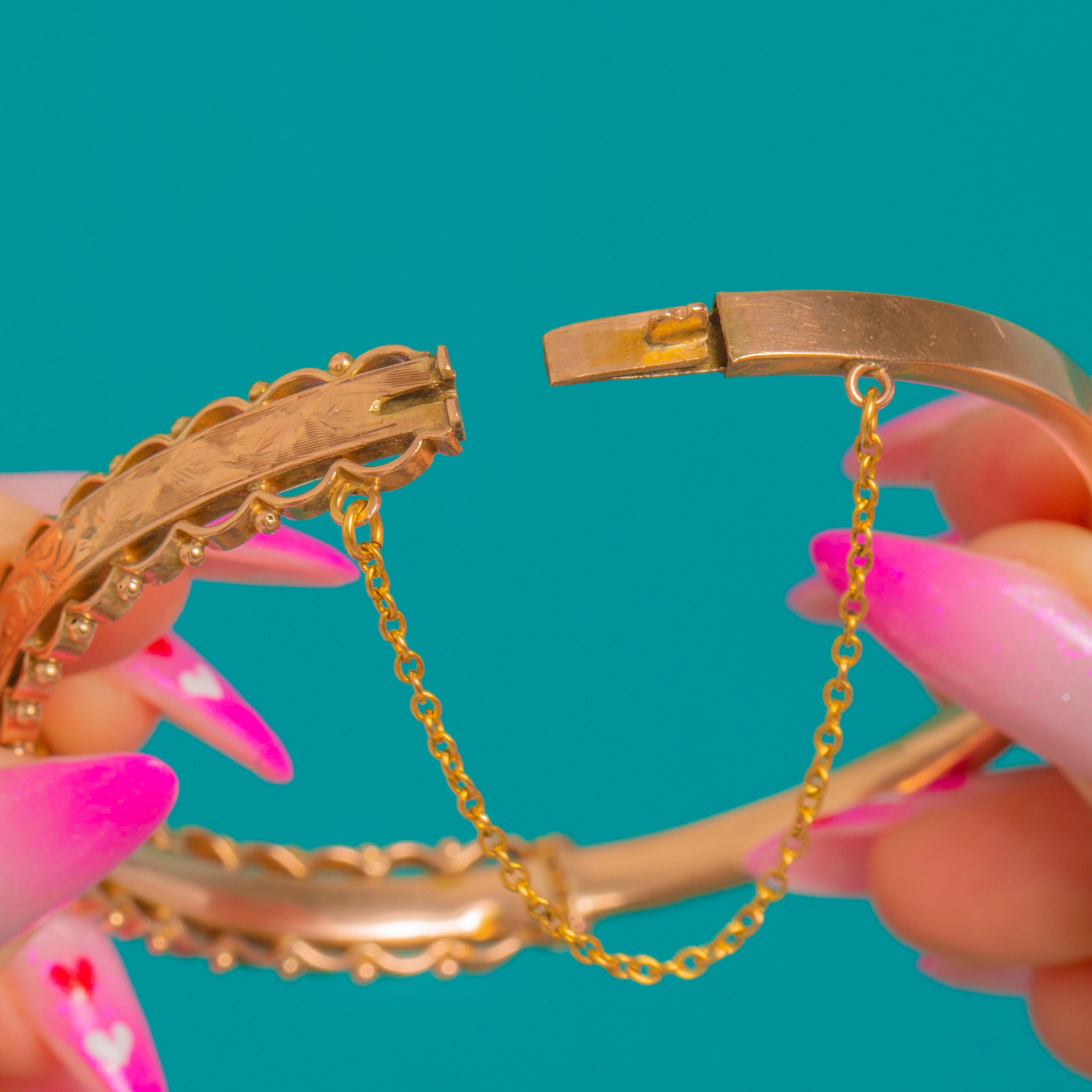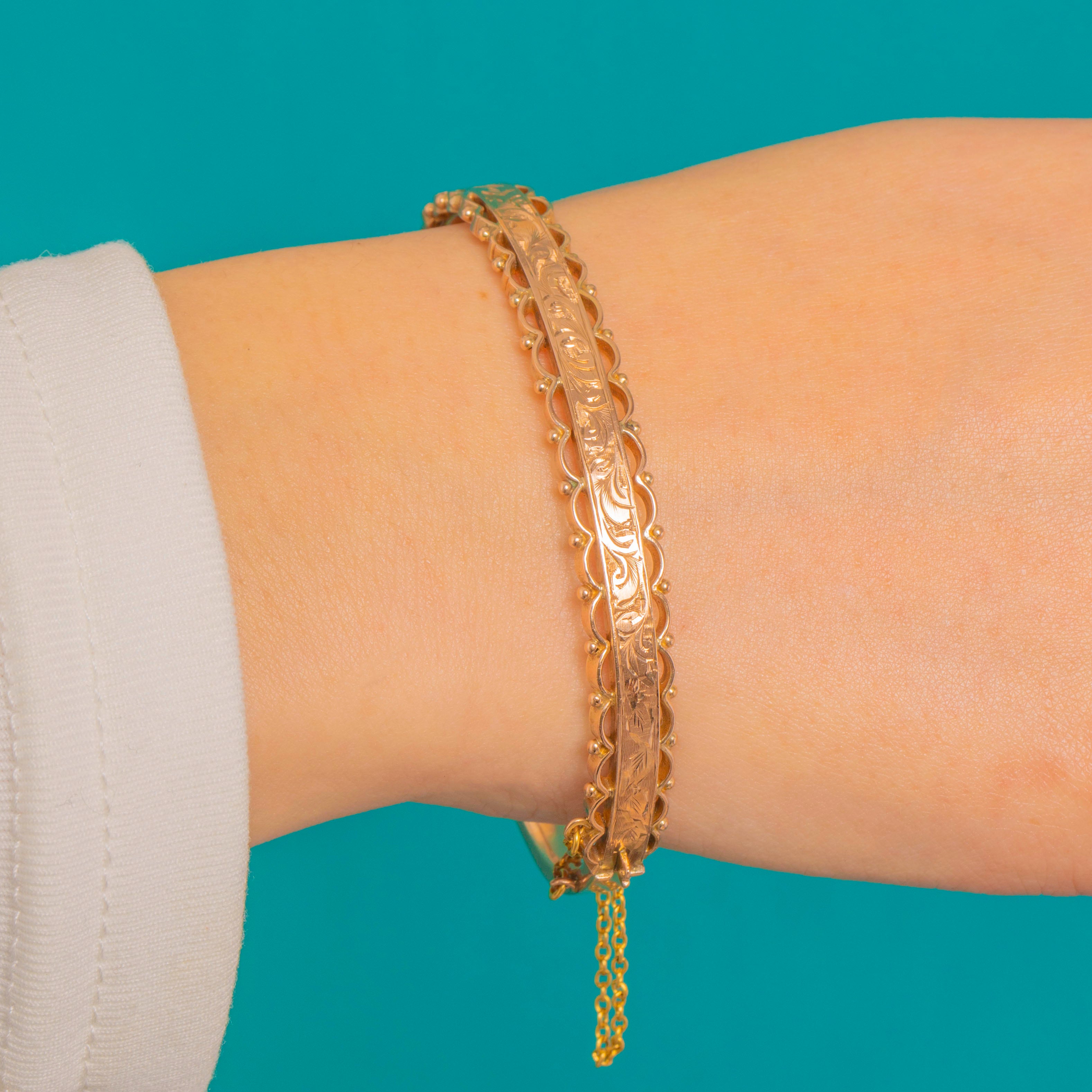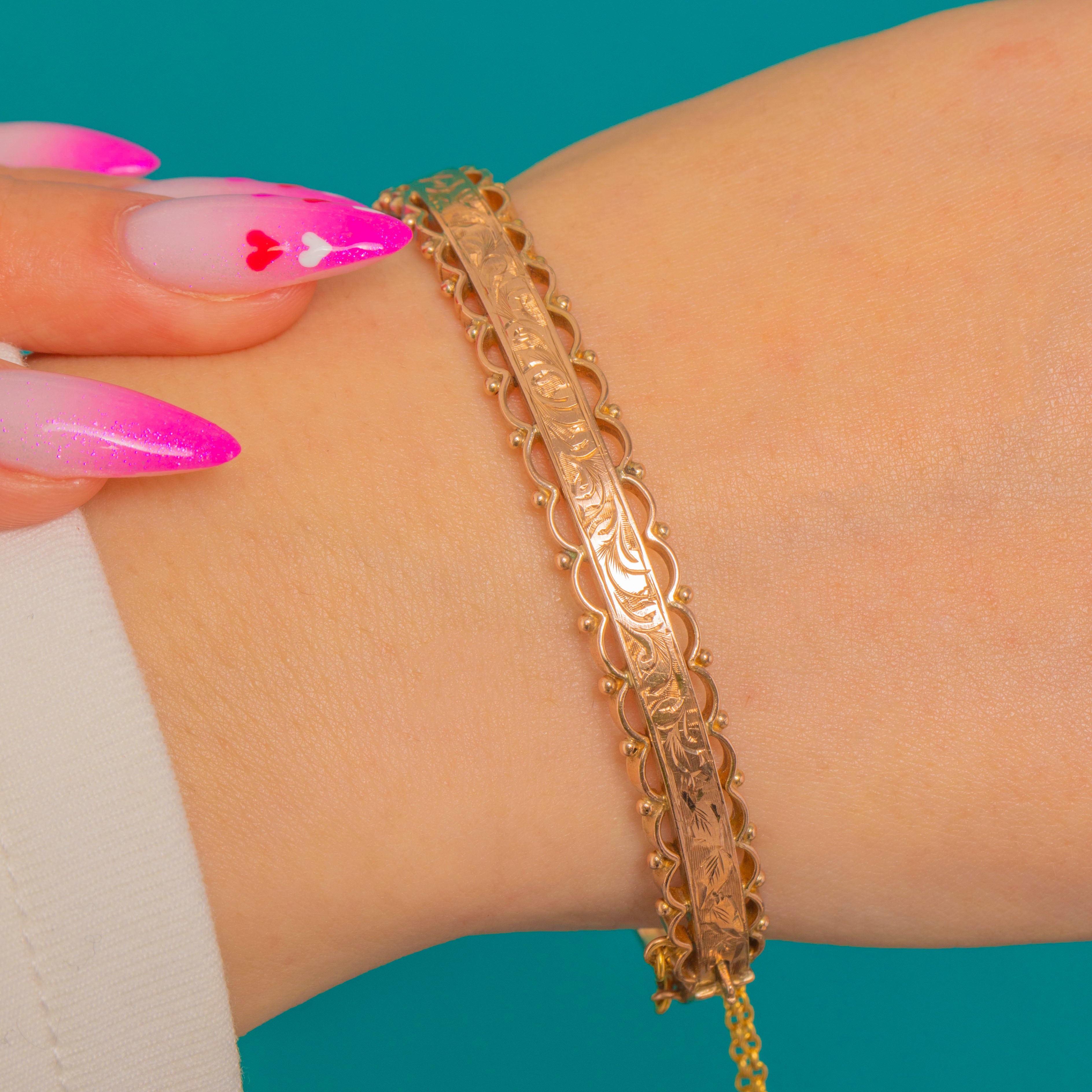 Beautifully made as a hinged bracelet, it closes with a tongue-in-box clasp and is secured by a short safety chain. The smooth back ensures comfort, while the raised, hand-finished front adds dimension and unmistakable Victorian charm.
