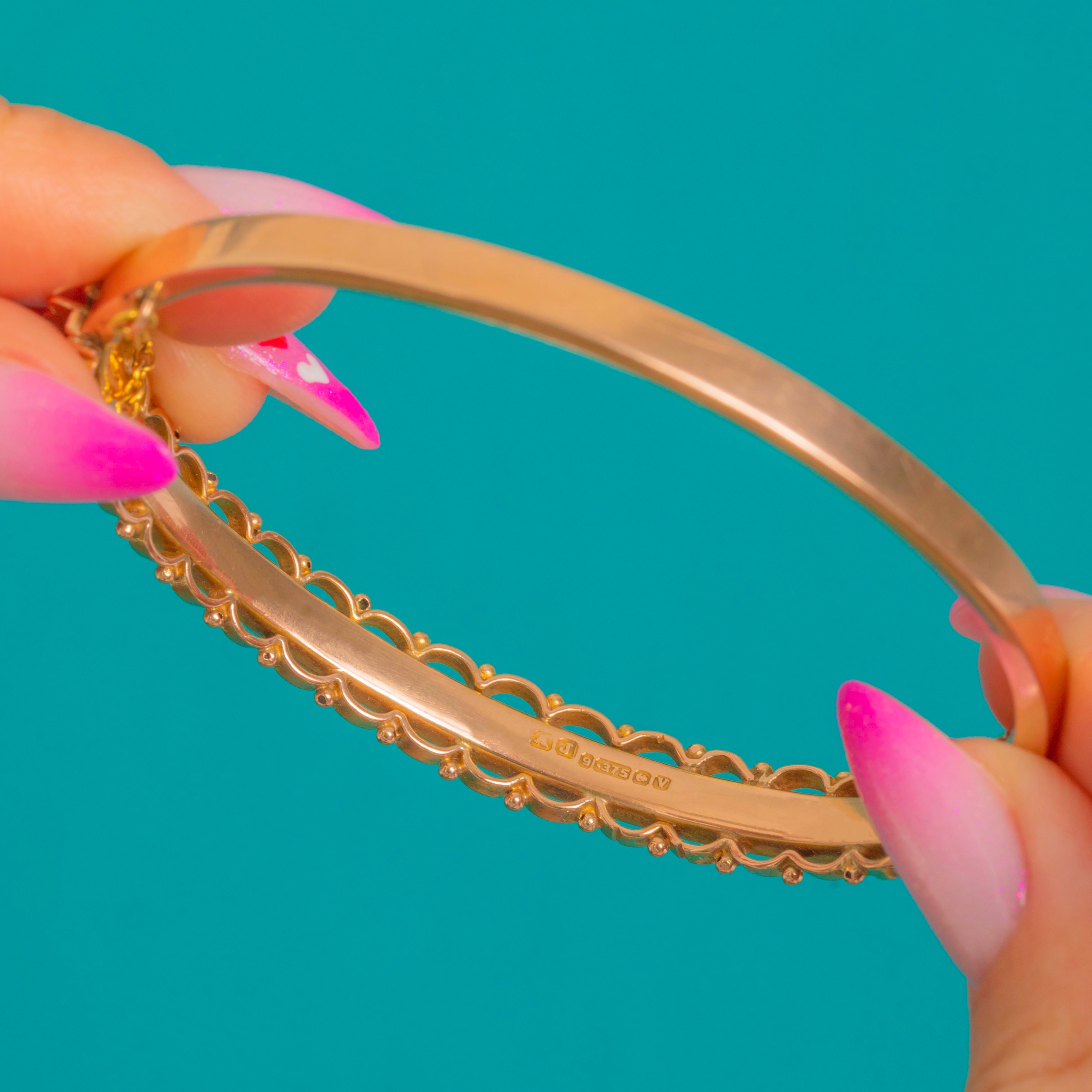 This slender Victorian bangle is fashioned in glowing 9ct Gold, its central panel richly chased with foliate scrolls and framed by a scalloped gallery dotted with tiny bead accents. Delicate yet ornate, it brings a romantic flourish to any stack and shines with a soft yellow-to-rose hue.