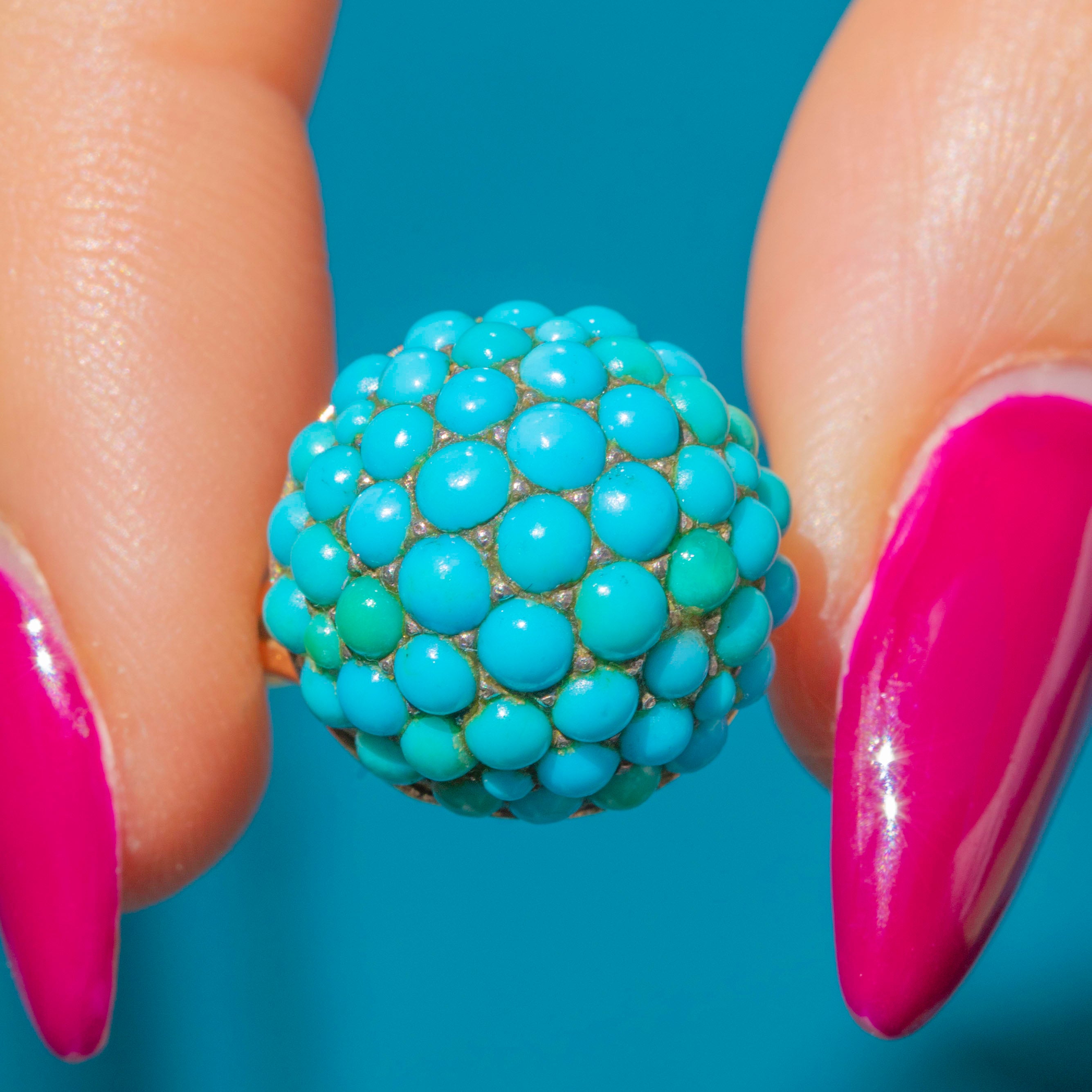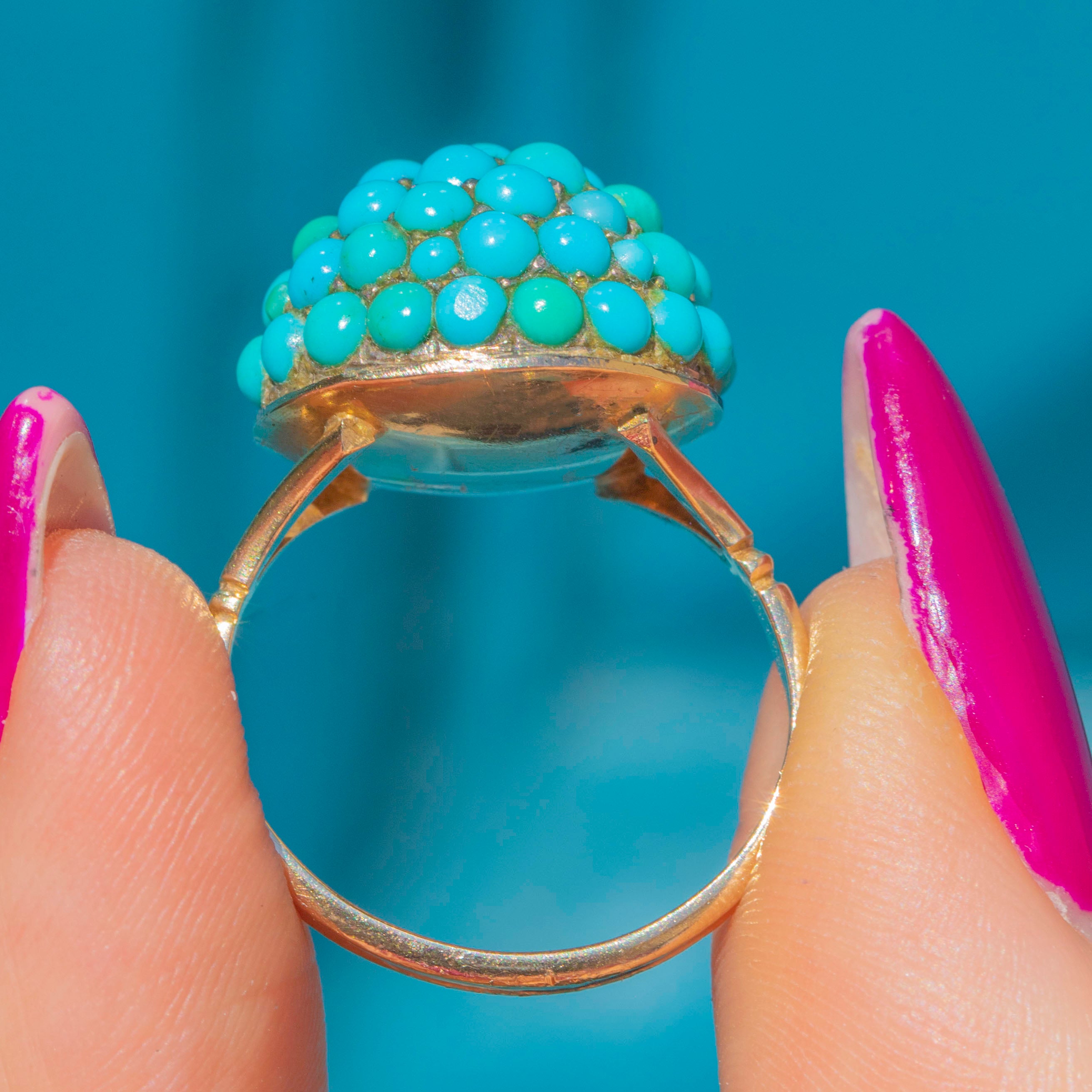This antique Turquoise bombe ring is a tantalising treat! The curvaceous ring face is completely covered in dainty pavé-set Turquoise cabochons, their varying blue and green hues combining to create a visually striking effect.