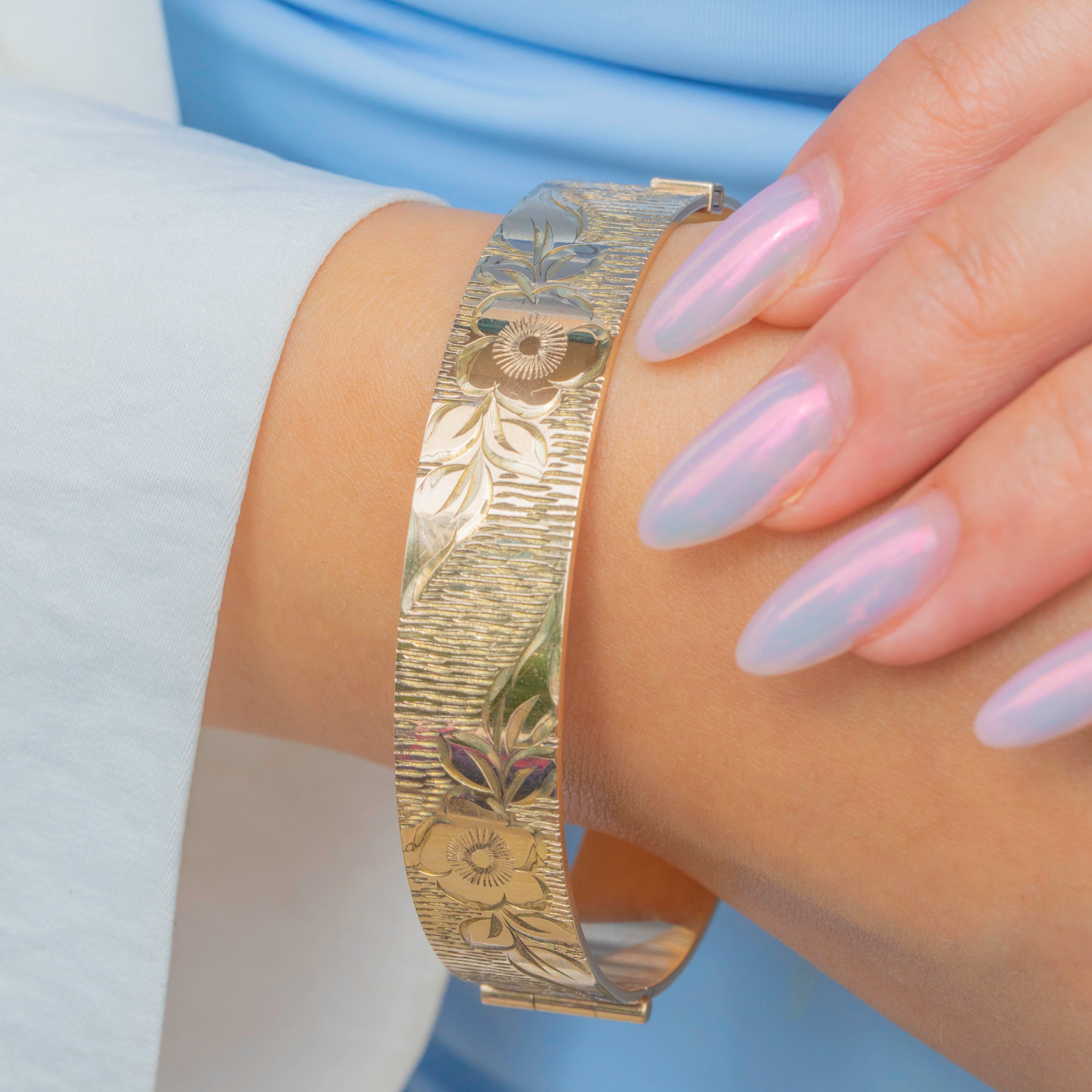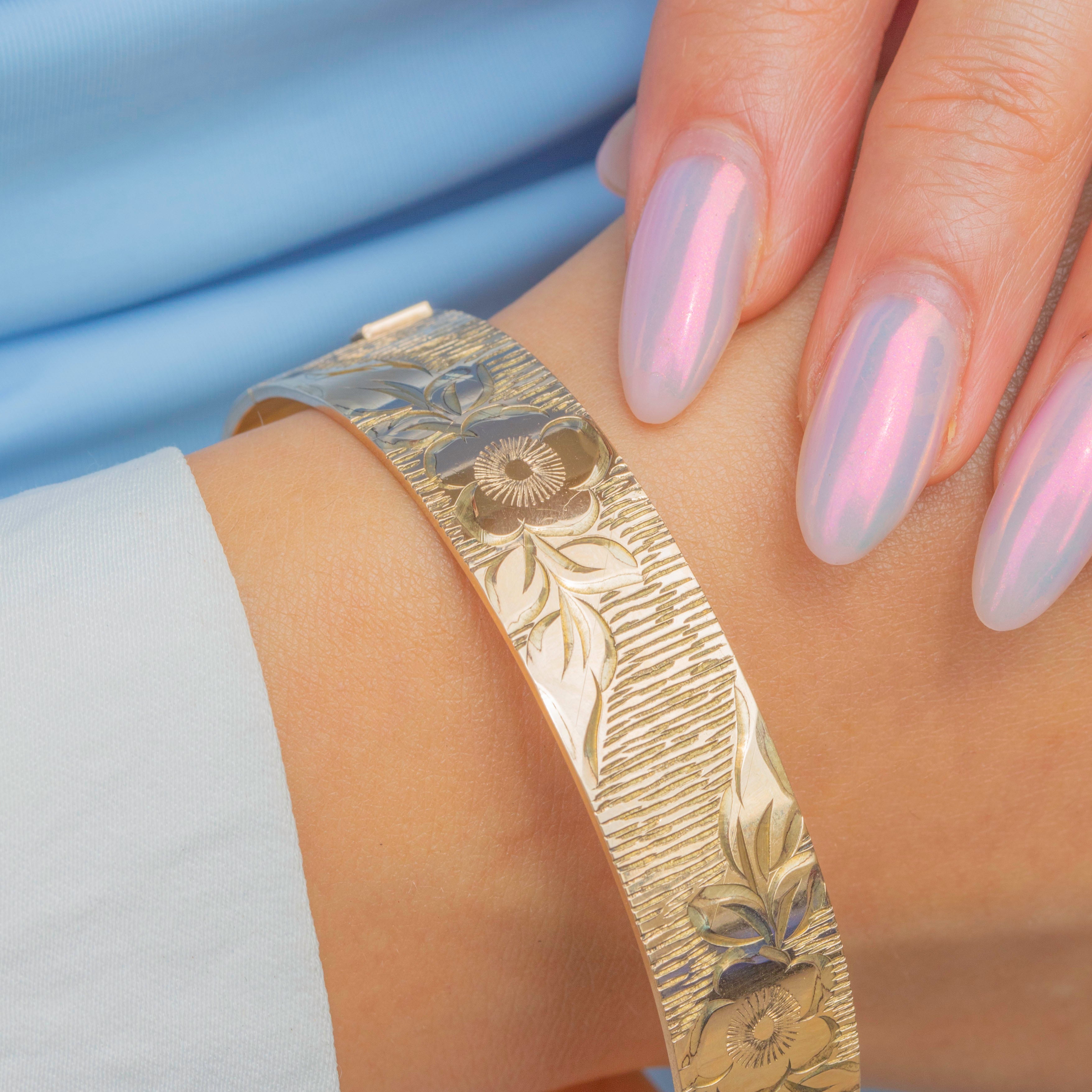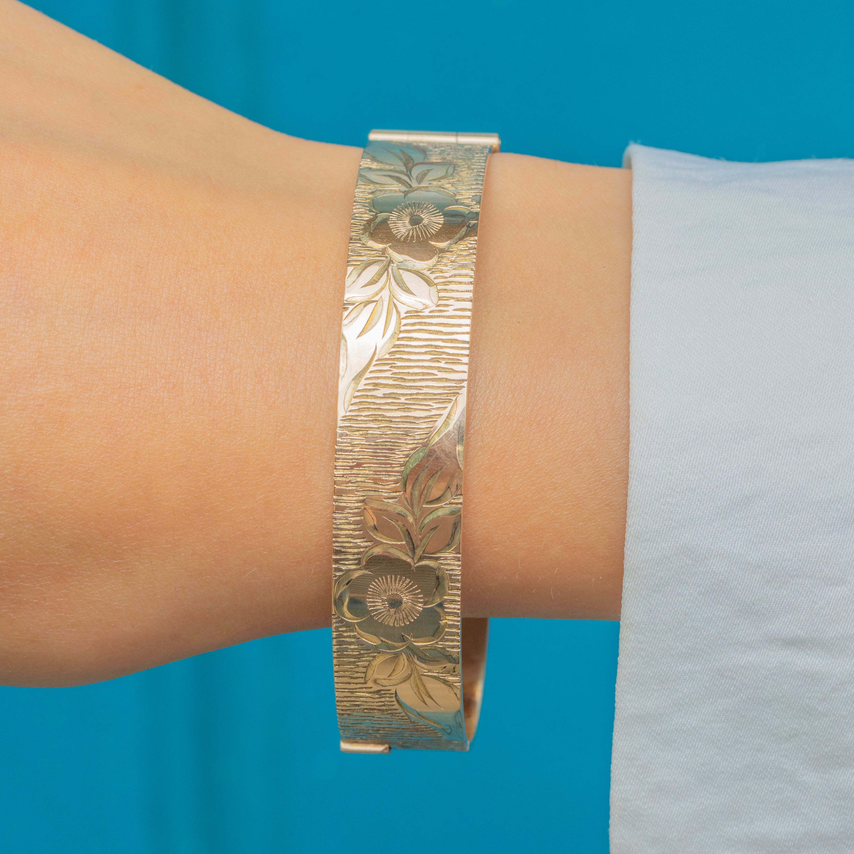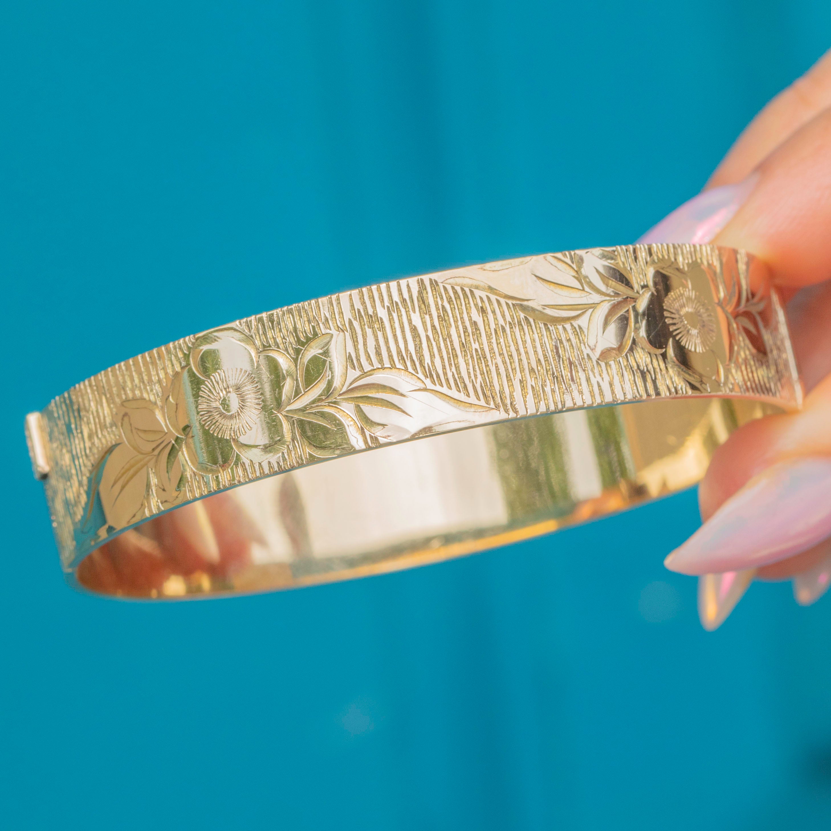 With bright and buttery 9ct rolled Gold and striking engraved floral details, there's no doubt you'll be attracting all the right attention as this vintage bangle adorns your wrist!