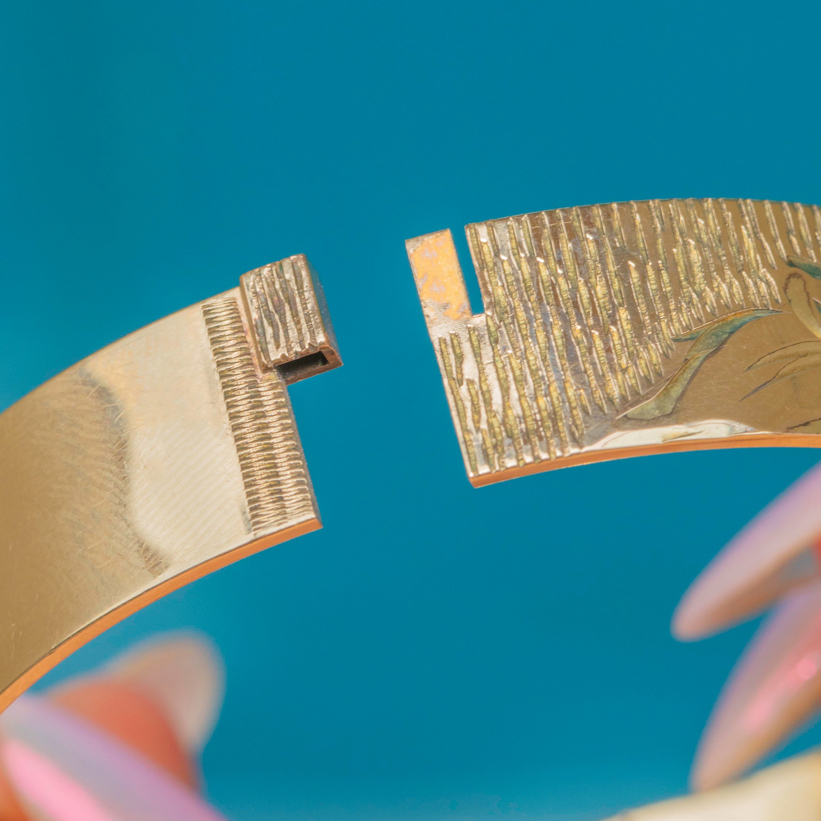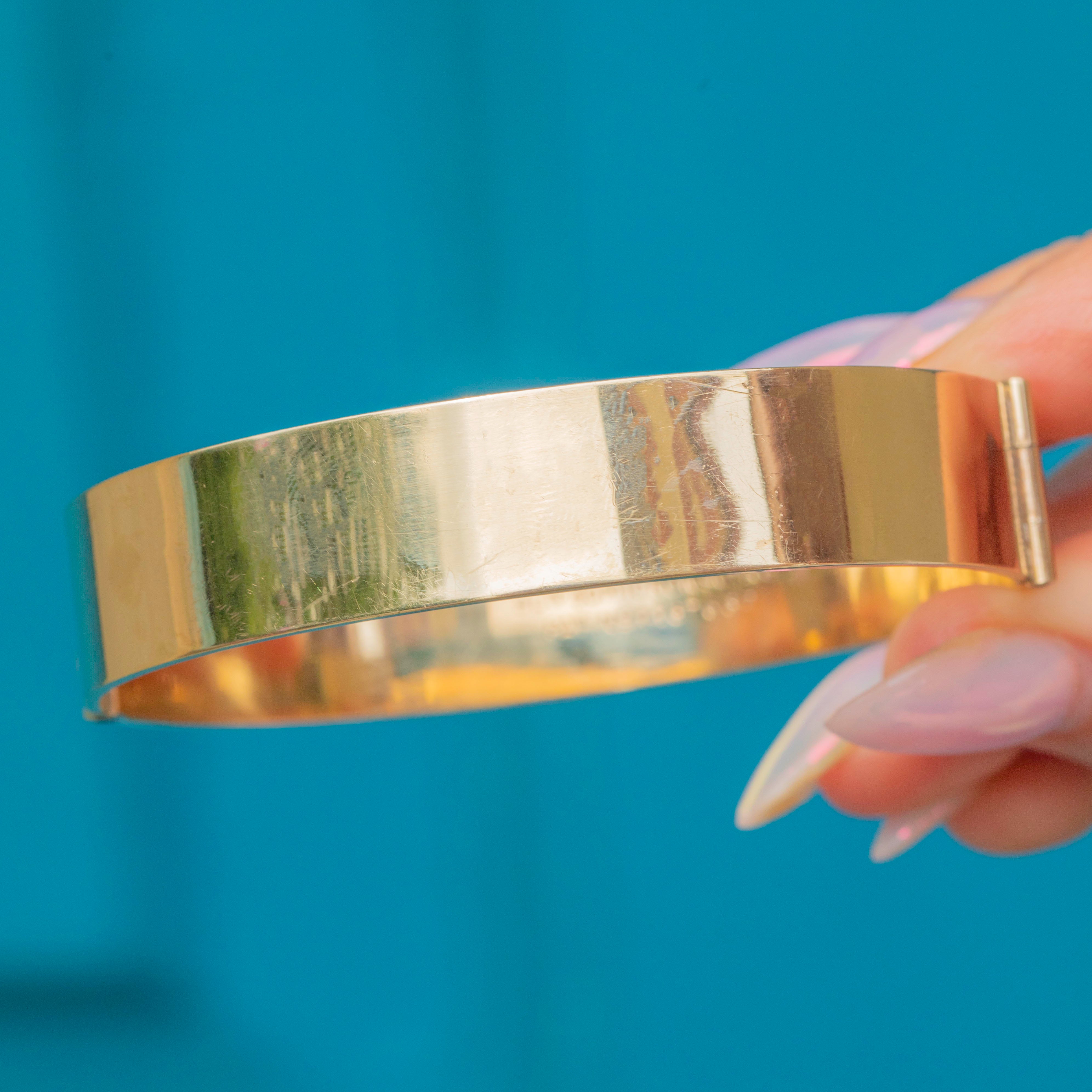 EXCELLENT: The 9ct rolled Gold is buttery with no signs of wear, and the engraving details are clear and crisp. There are no dings or scuffs to the body of the bangle, and it closes securely, allowing you to wear it with confidence!