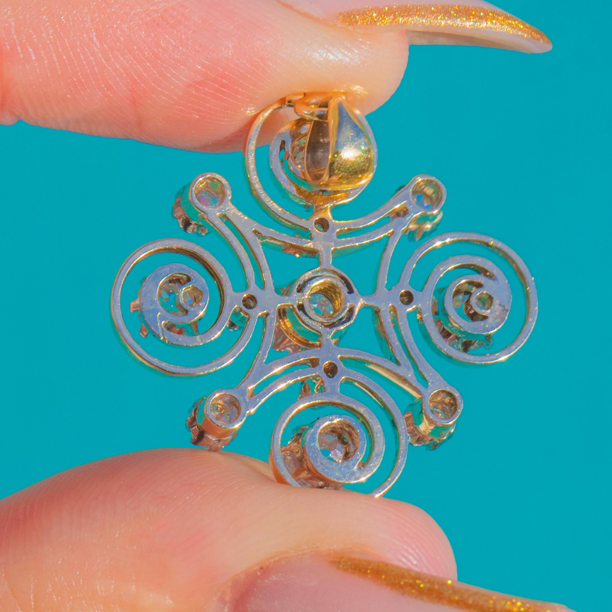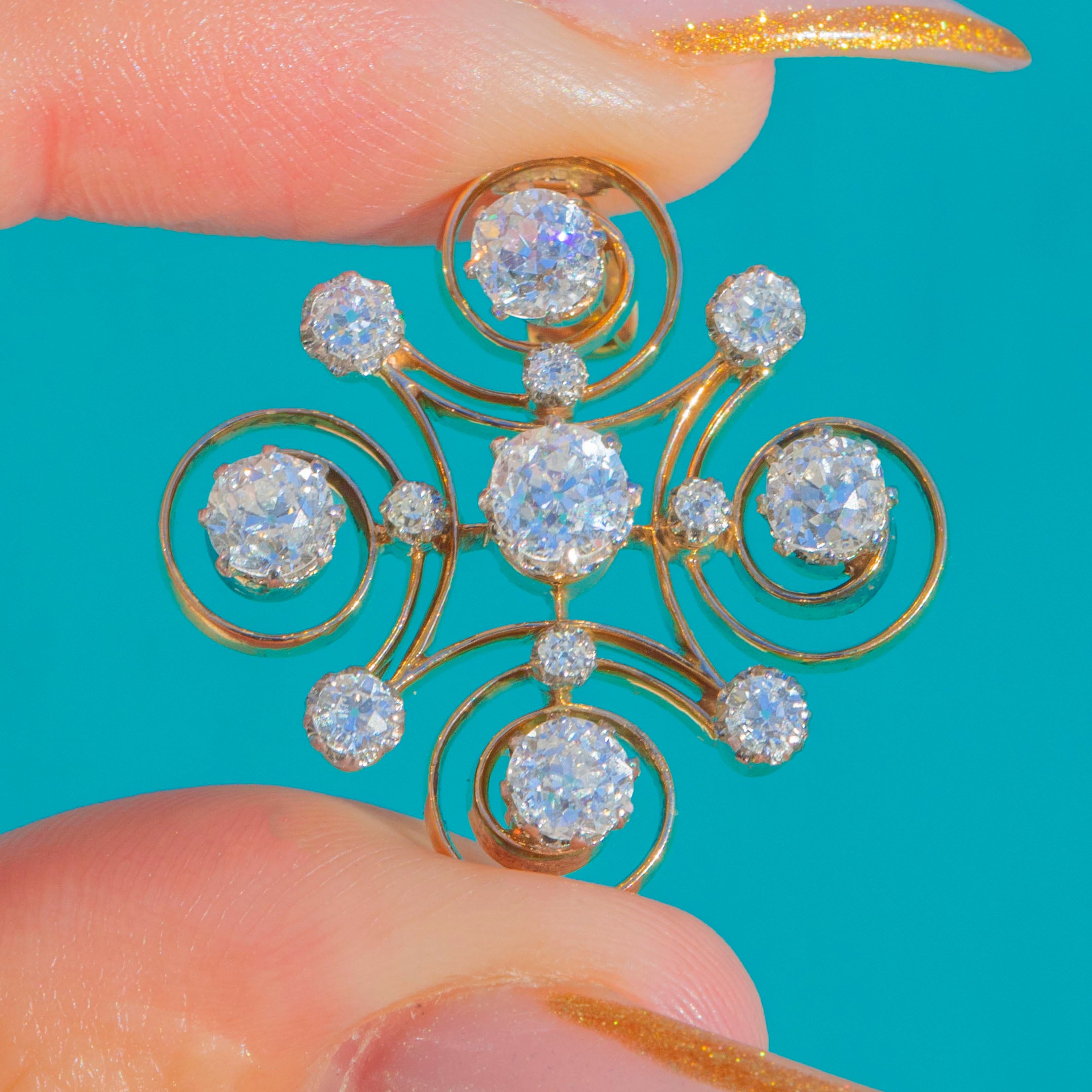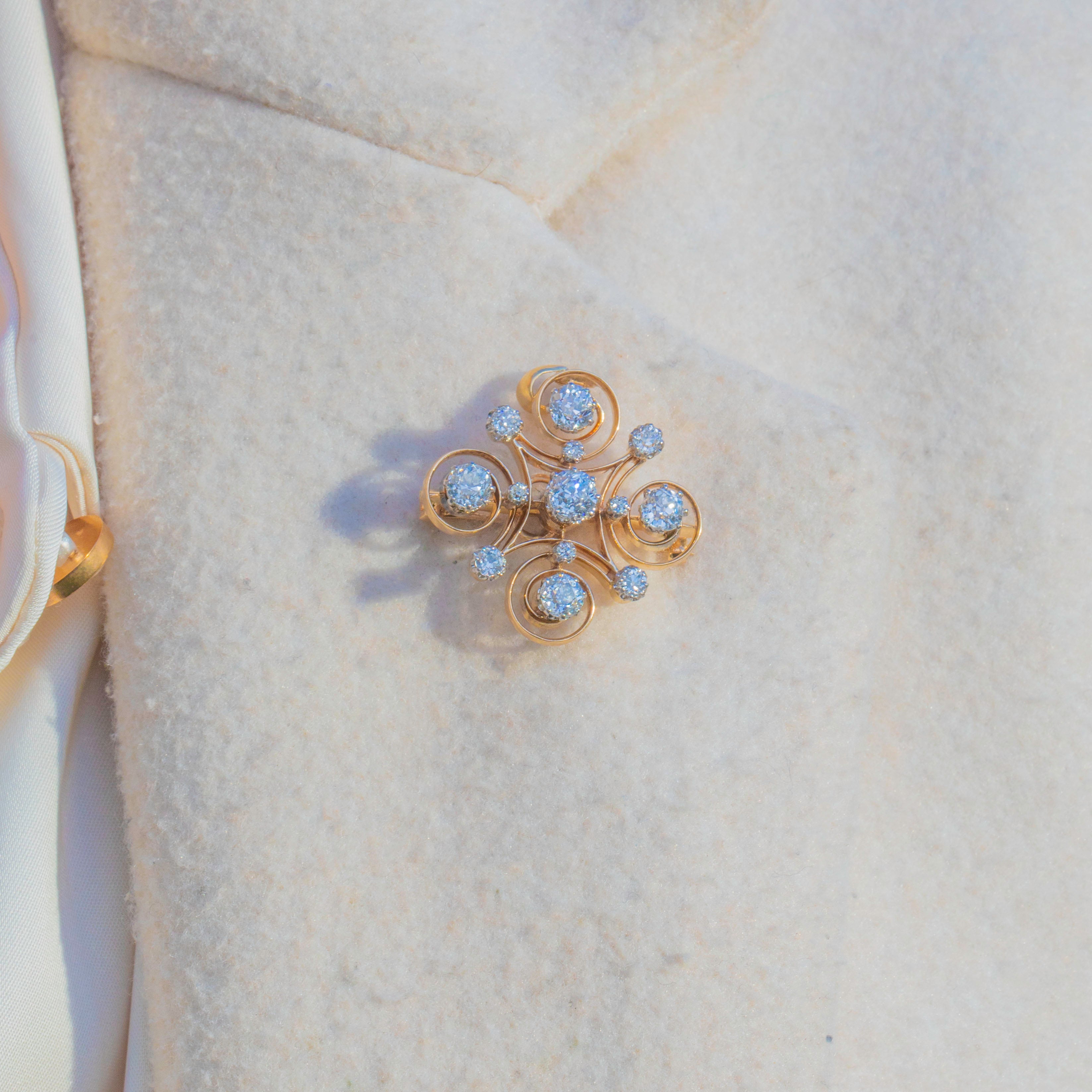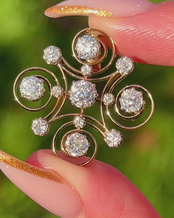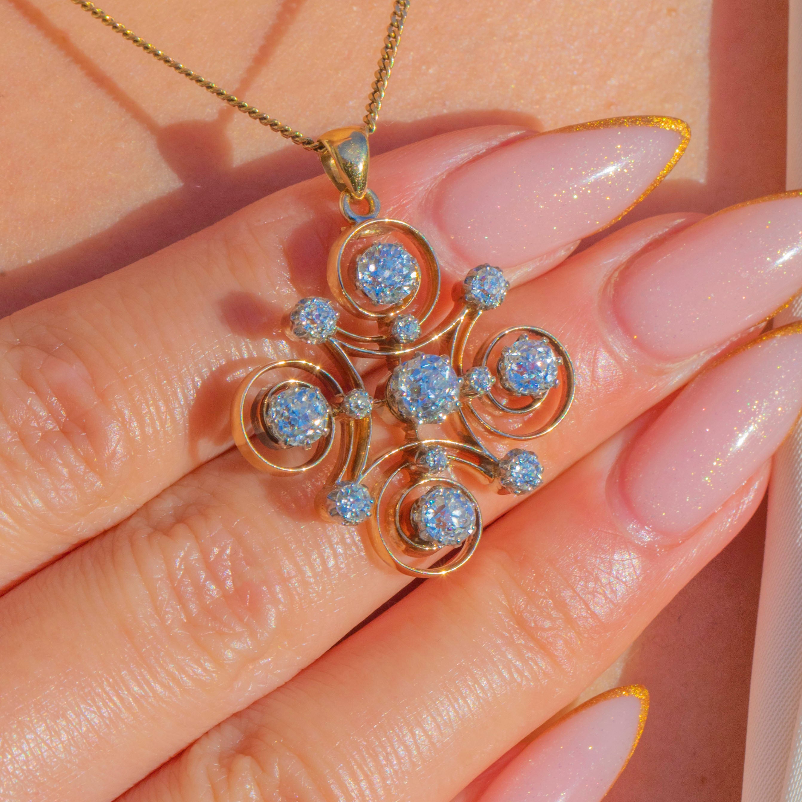 This exquisite Victorian old mine-cut Diamond jewel is crafted in 14ct Gold and designed as an elegant scrolling cross motif, set throughout with bright, lively Diamonds. Circa 1890, she blends classic antique Diamonds of the late 18th Century with swirling Art Nouveau influences from the Continent.