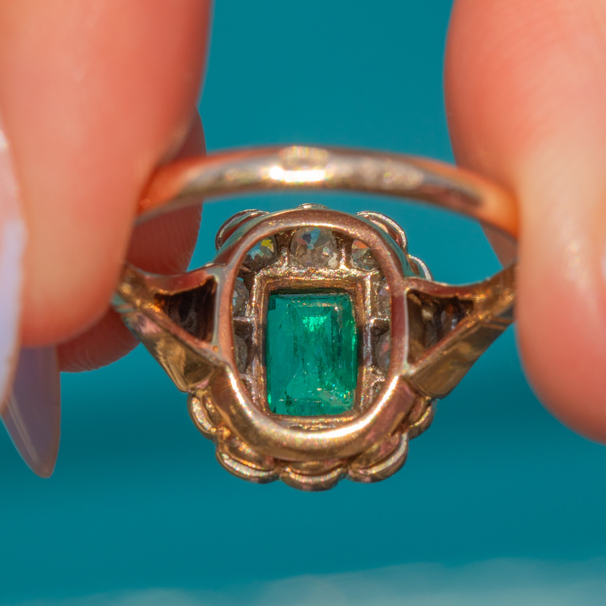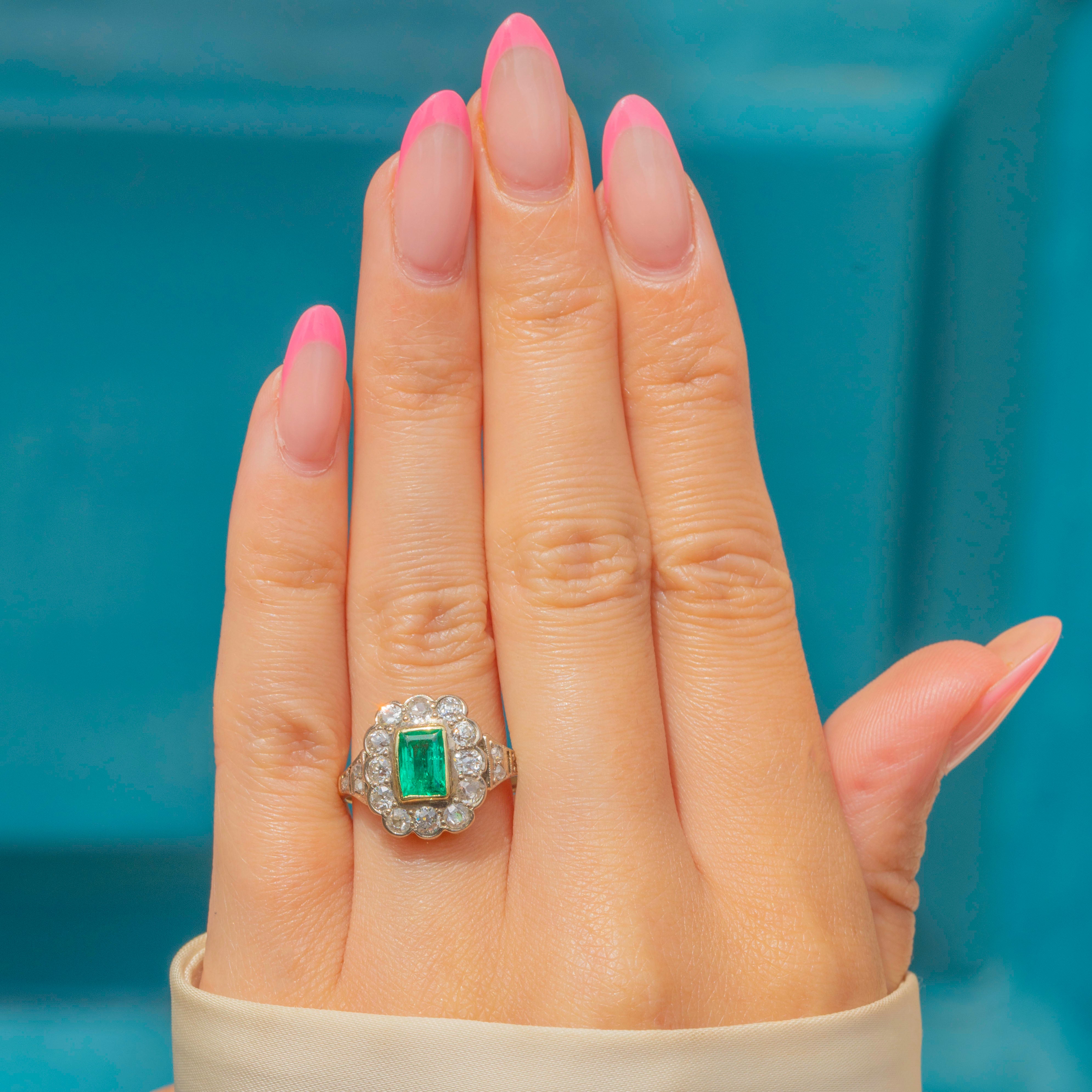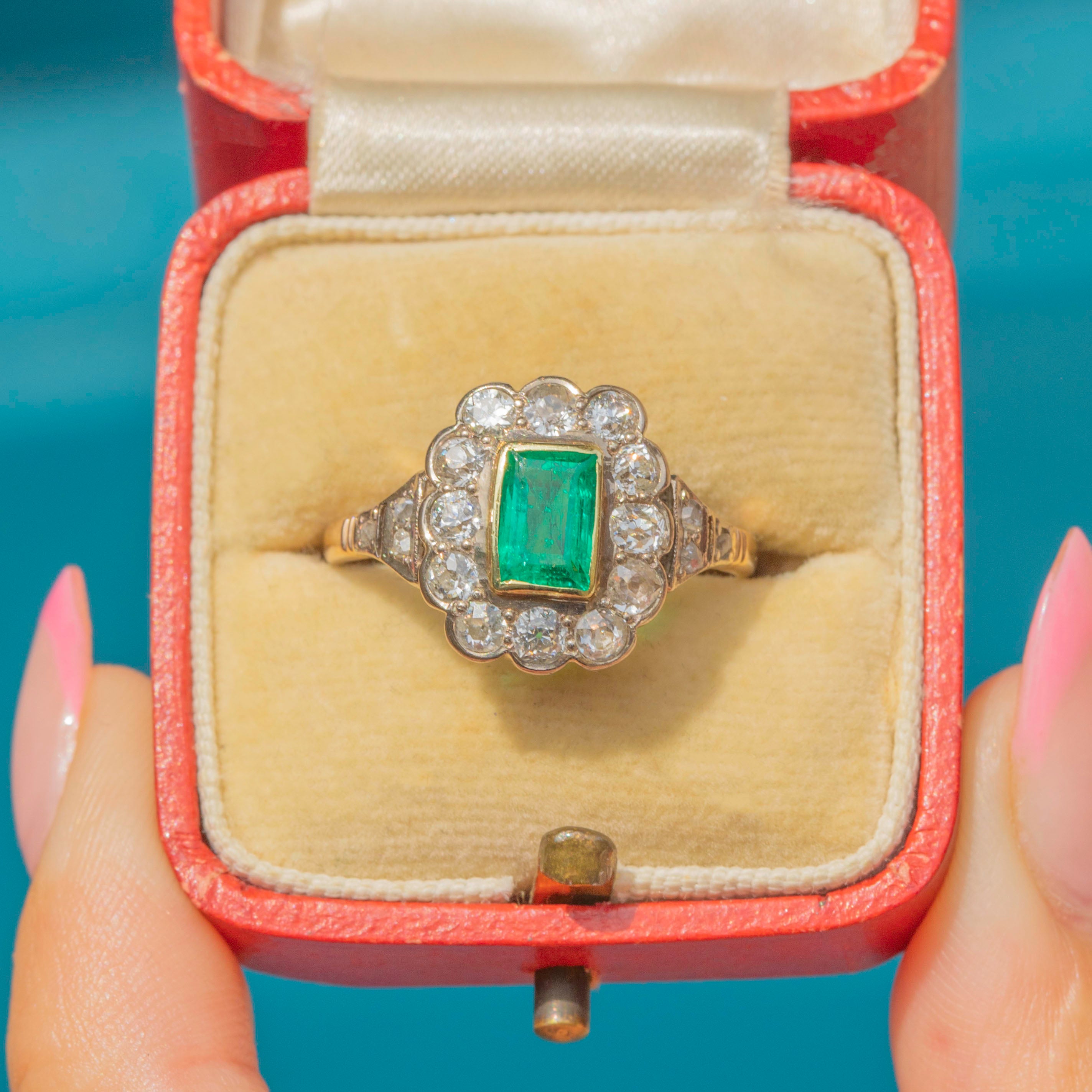 This Edwardian 14ct Gold Emerald Diamond cluster ring is quite incredible! In her centre sits a stunning, vibrant 0.70ct rectangular Emerald encircled by a halo of twelve scintillating Diamonds, boasting 0.60ct.