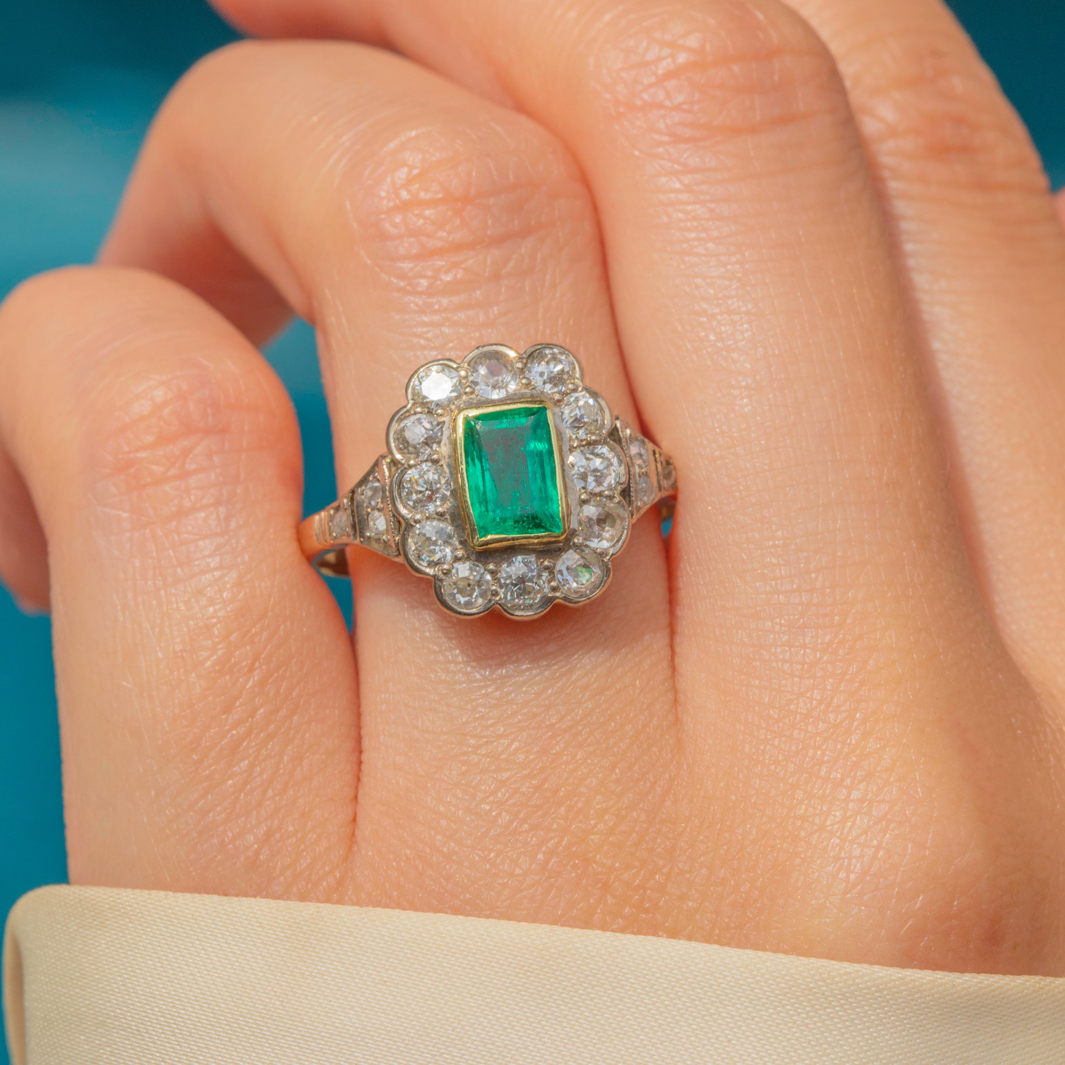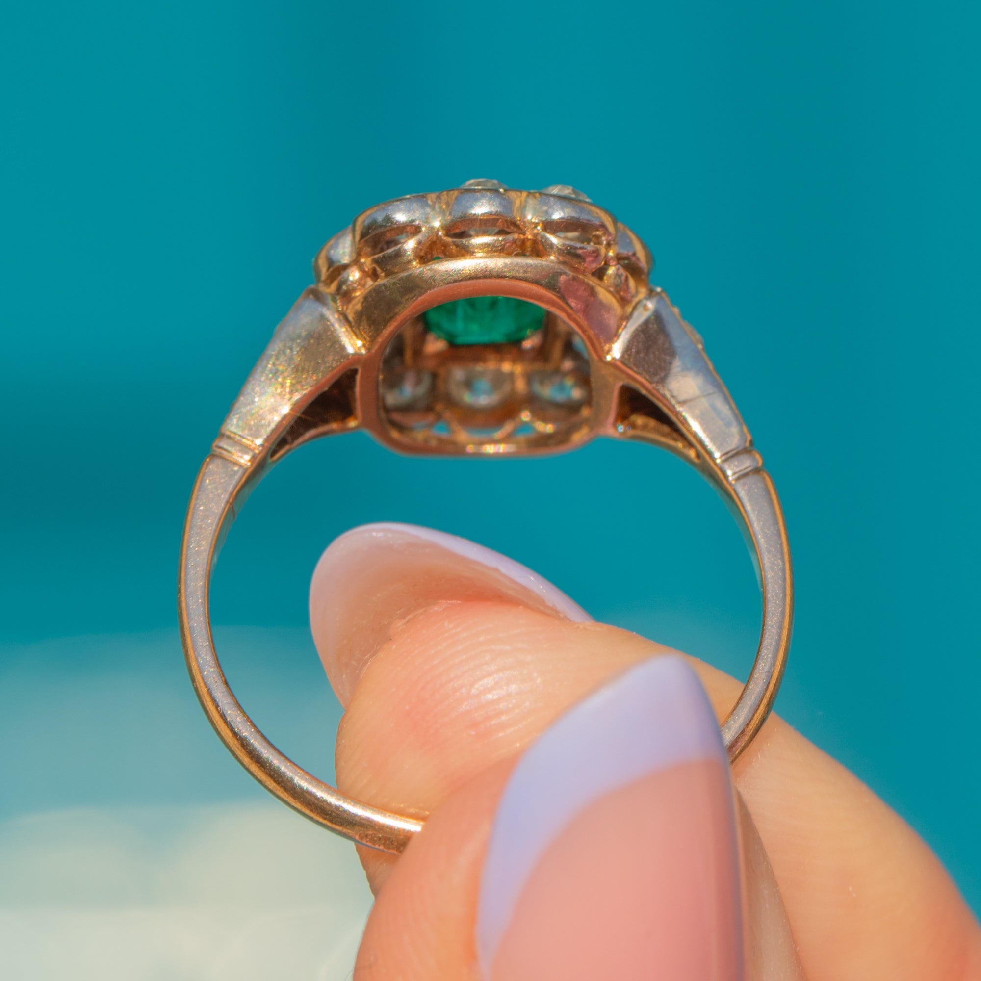 Antique 14ct Gold Emerald Diamond Cluster Ring, 0.70ct Emerald