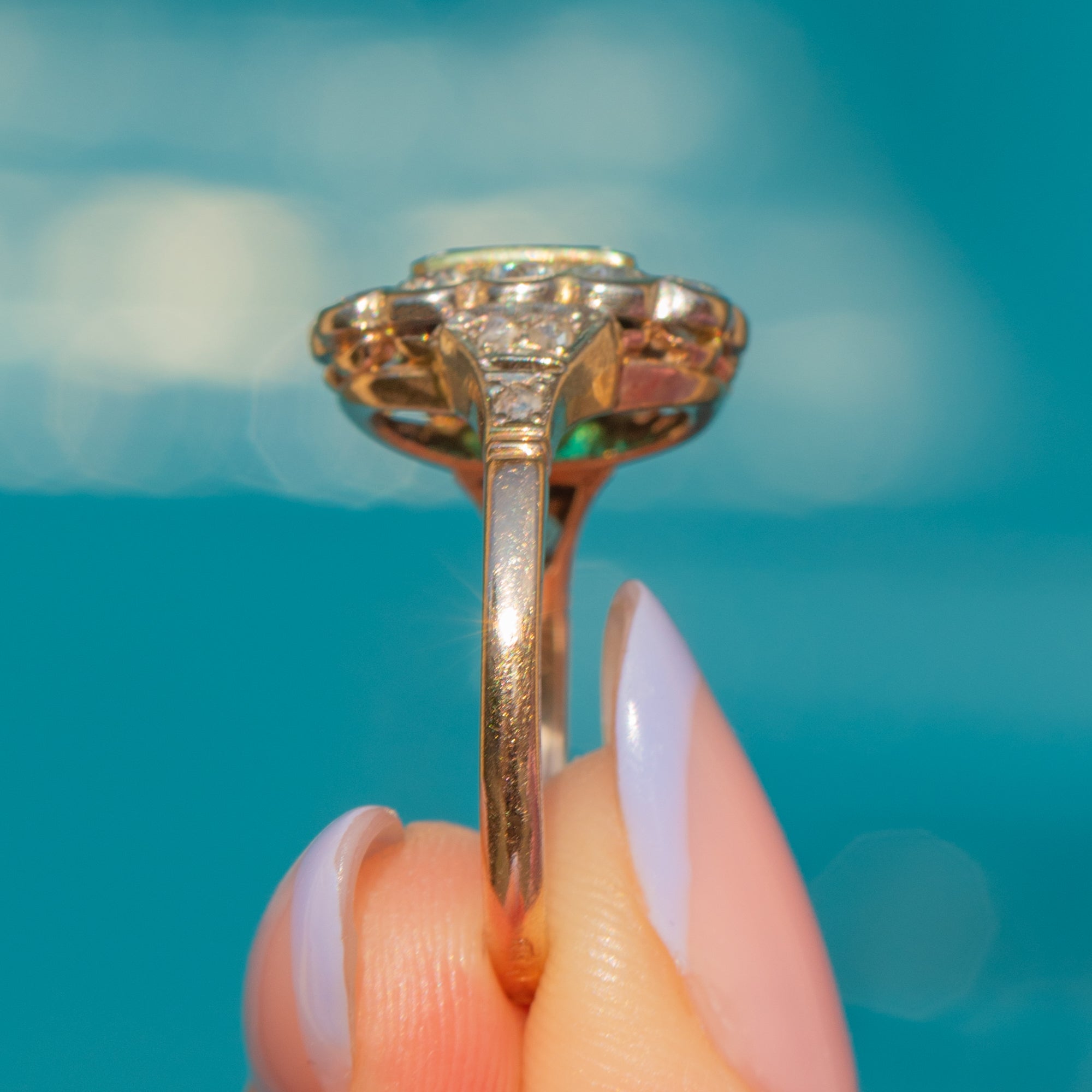 EXCELLENT: This antique 14ct Gold Emerald Diamond cluster ring is in wonderful condition. Each gemstone is radiant and secure within its setting, providing a distinctive sparkle. There are some inclusions to the Emerald - a quintessential feature of the gemstone and a nice nod to mother nature. With glossy 14ct yellow and 18ct White Gold, this Edwardian ring is a must-have!