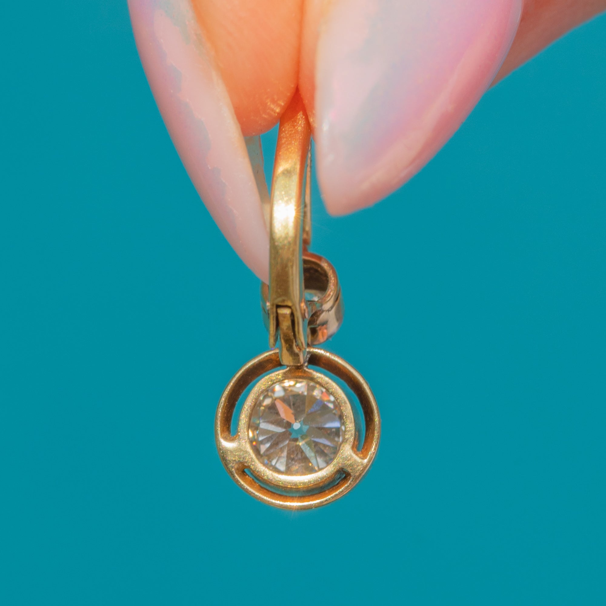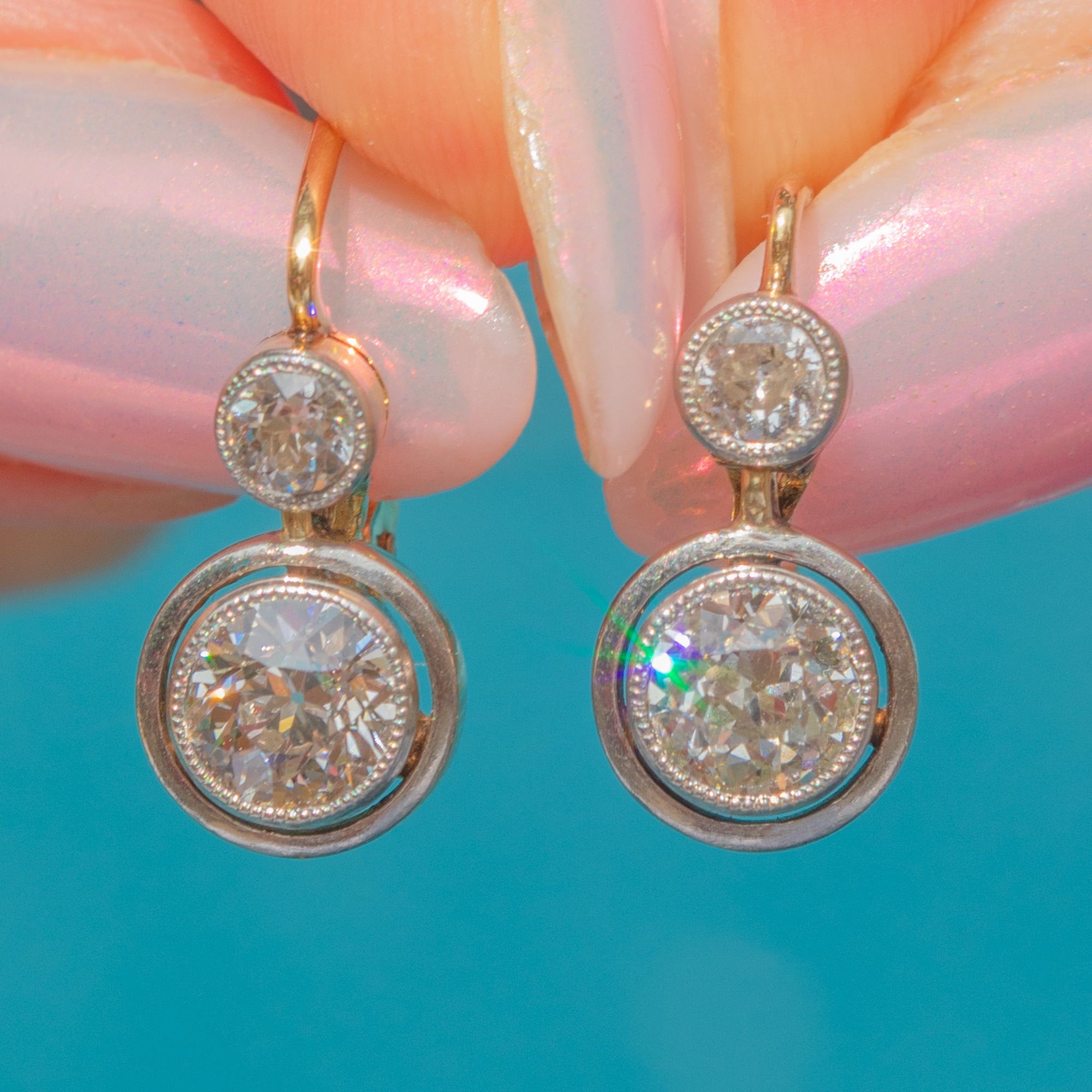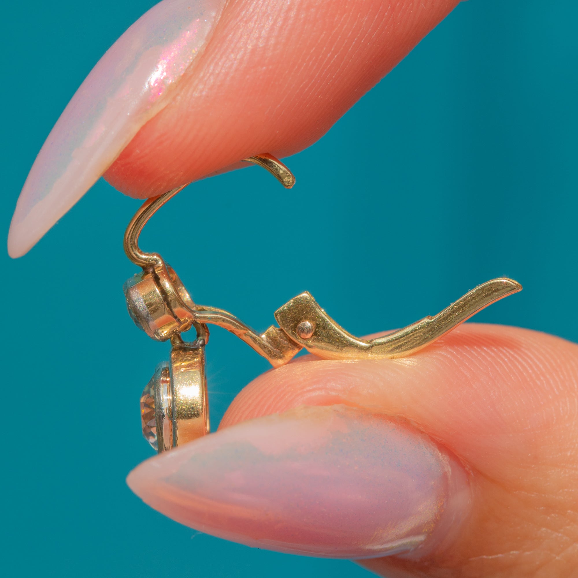 EXCELLENT: Each Old-European cut Diamond is radiant, having been gorgeously faceted and presenting a bright twinkle. There are some very minor fleabites present to the Diamonds, though this can only be seen under a x10 magnifying loupe. The Gold is bright and buttery, and the dormeuse hooks close securely, providing confident and comfortable wear.