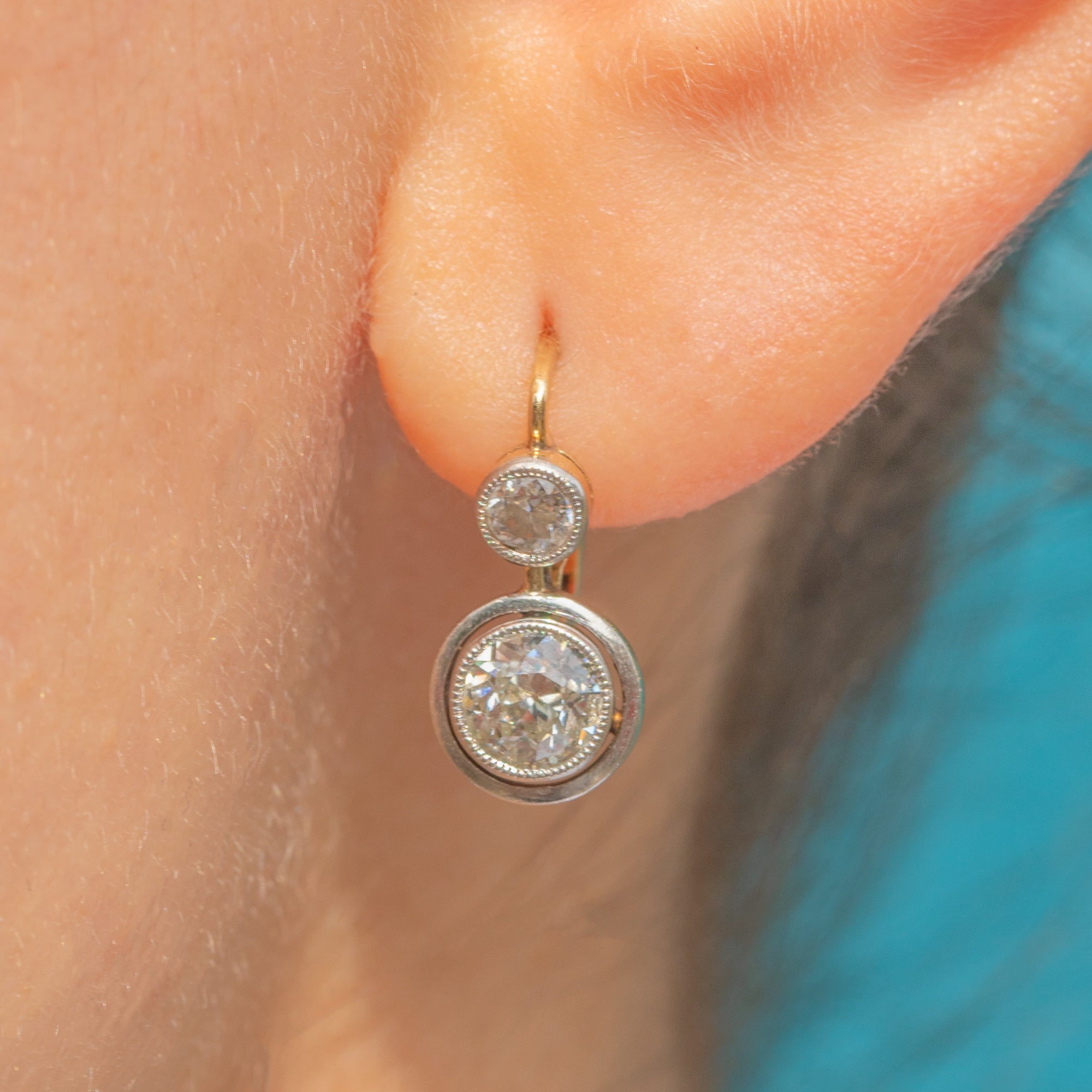 These Edwardian earrings boast two sparkling old European-cut Diamonds each, with a total carat weight of 1.10ct, radiating a brilliant twinkle from every angle.