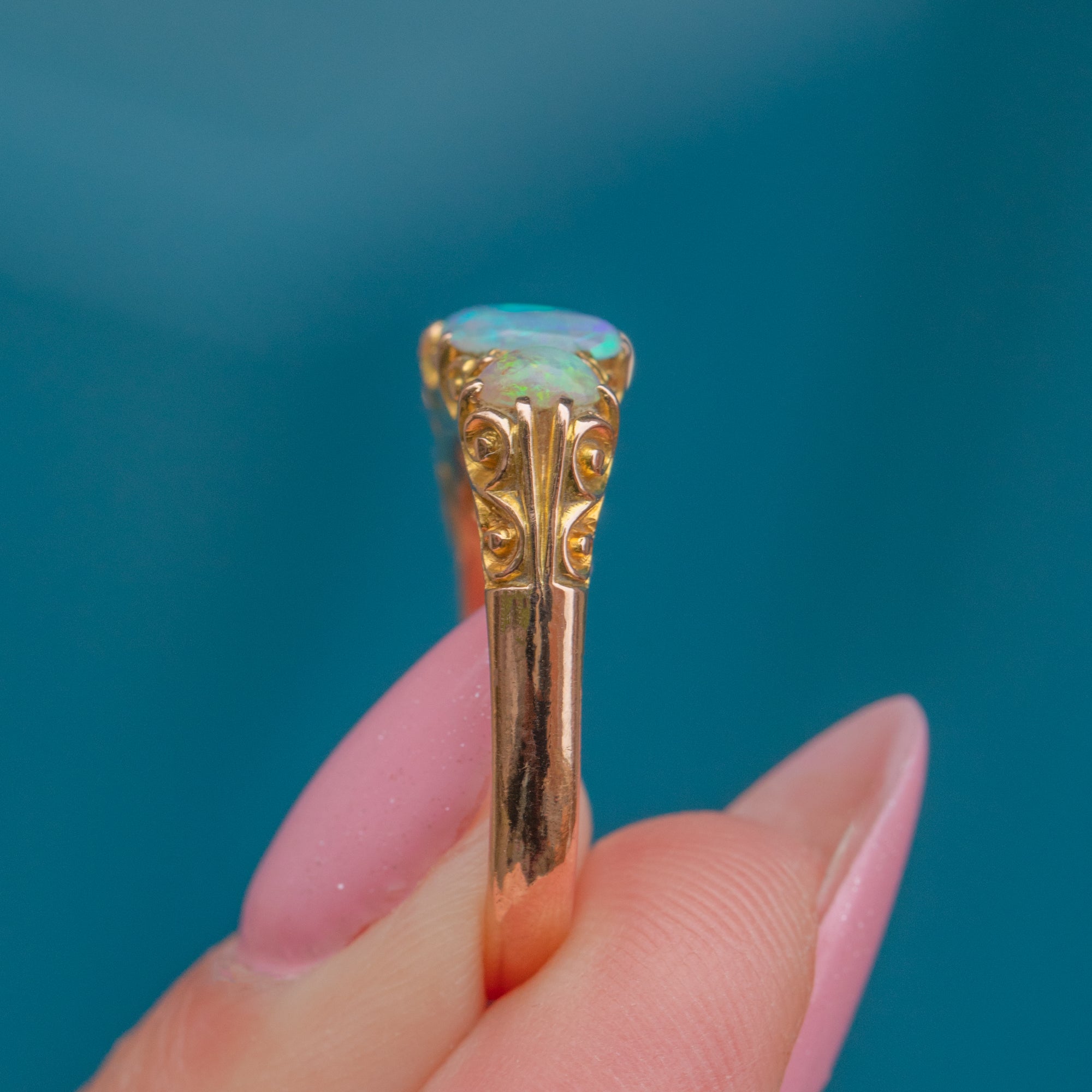 Add a touch of whimsy to your ring stack with this gorgeous antique 14ct Gold Opal five stone ring! Finely crafted from solid 14ct Gold, this Victorian ring boasts five lively Opal cabochons displayed within an ornately formed c-scroll gallery.