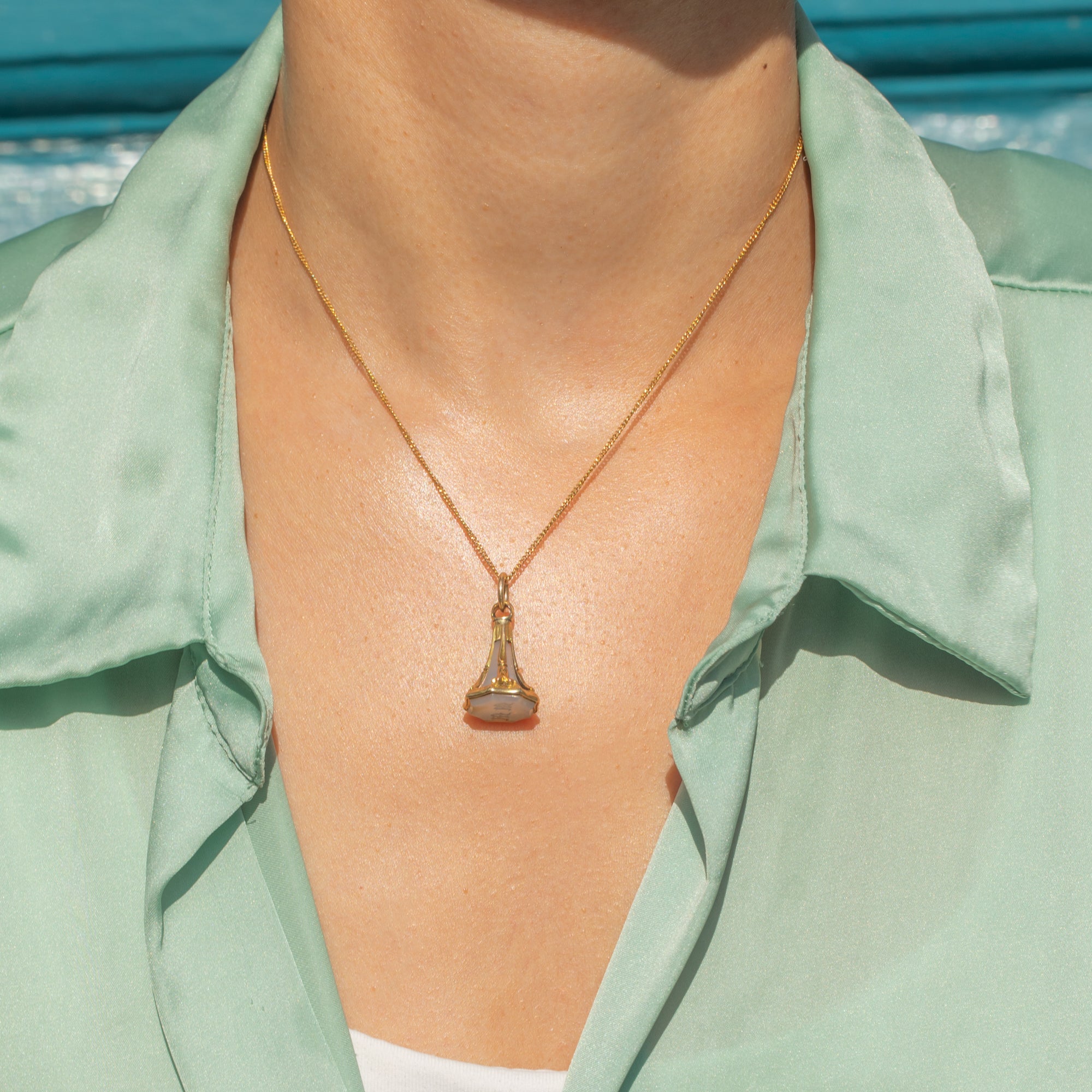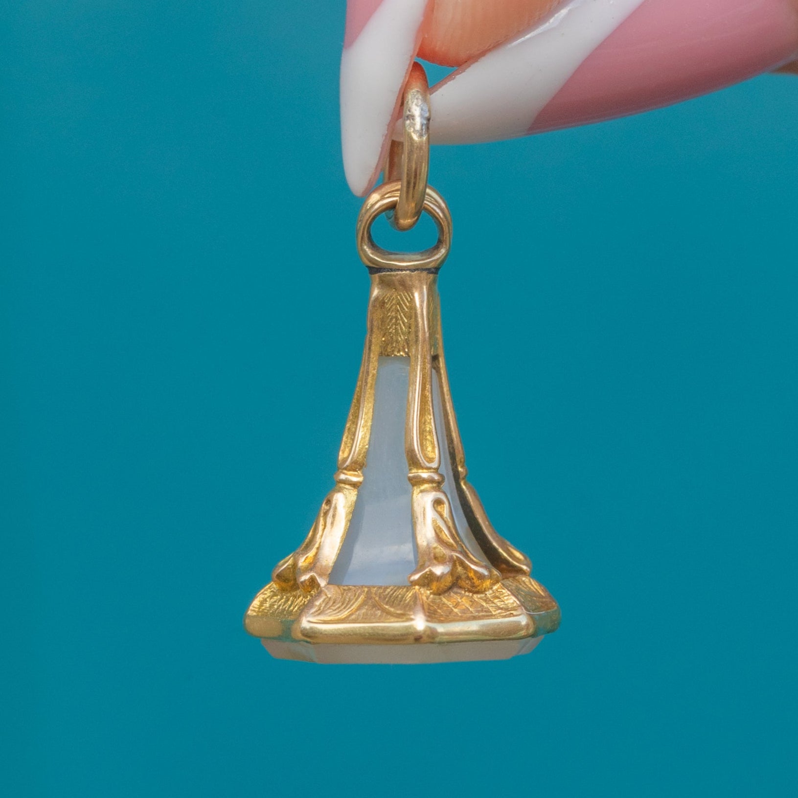This ornate Victorian pendant displays a glossy Agate fob, radiating a creamy lilac-powder blue hue adorned by distinctive banding for which the gemstone is so revered.