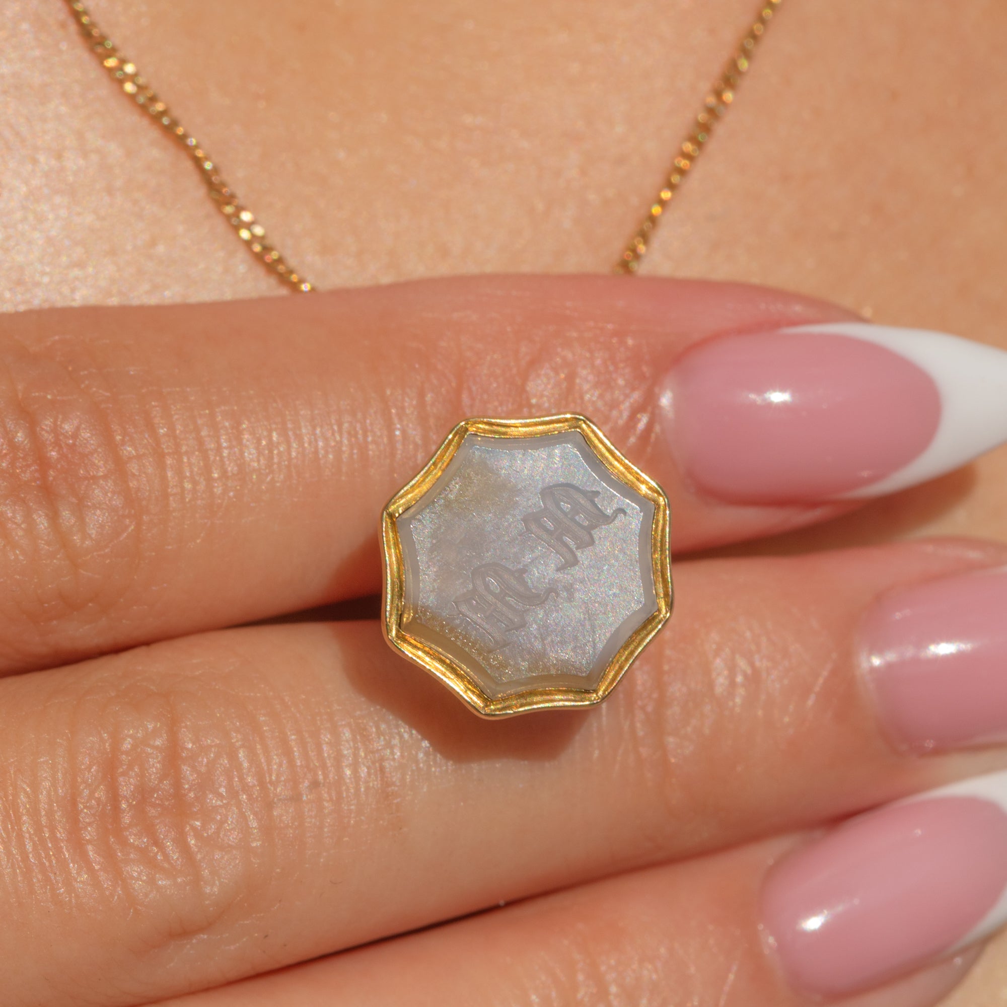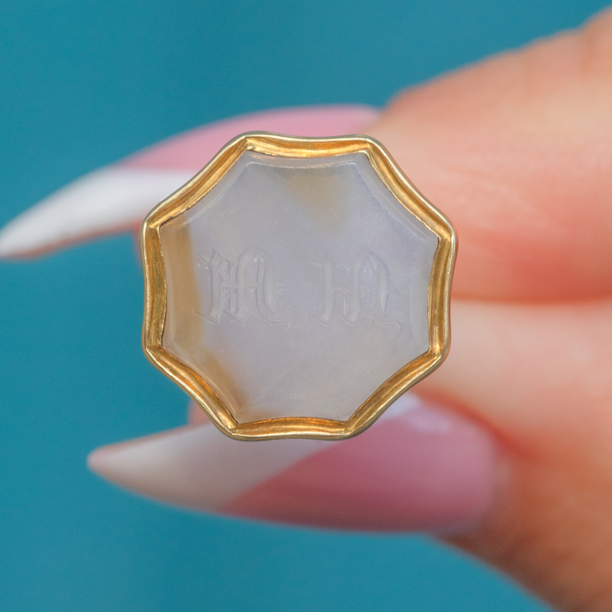 It is set within bright and glossy 15ct Gold and is complete with an engraved MM intaglio on the base of the Agate, adding unique antique charm to this piece.