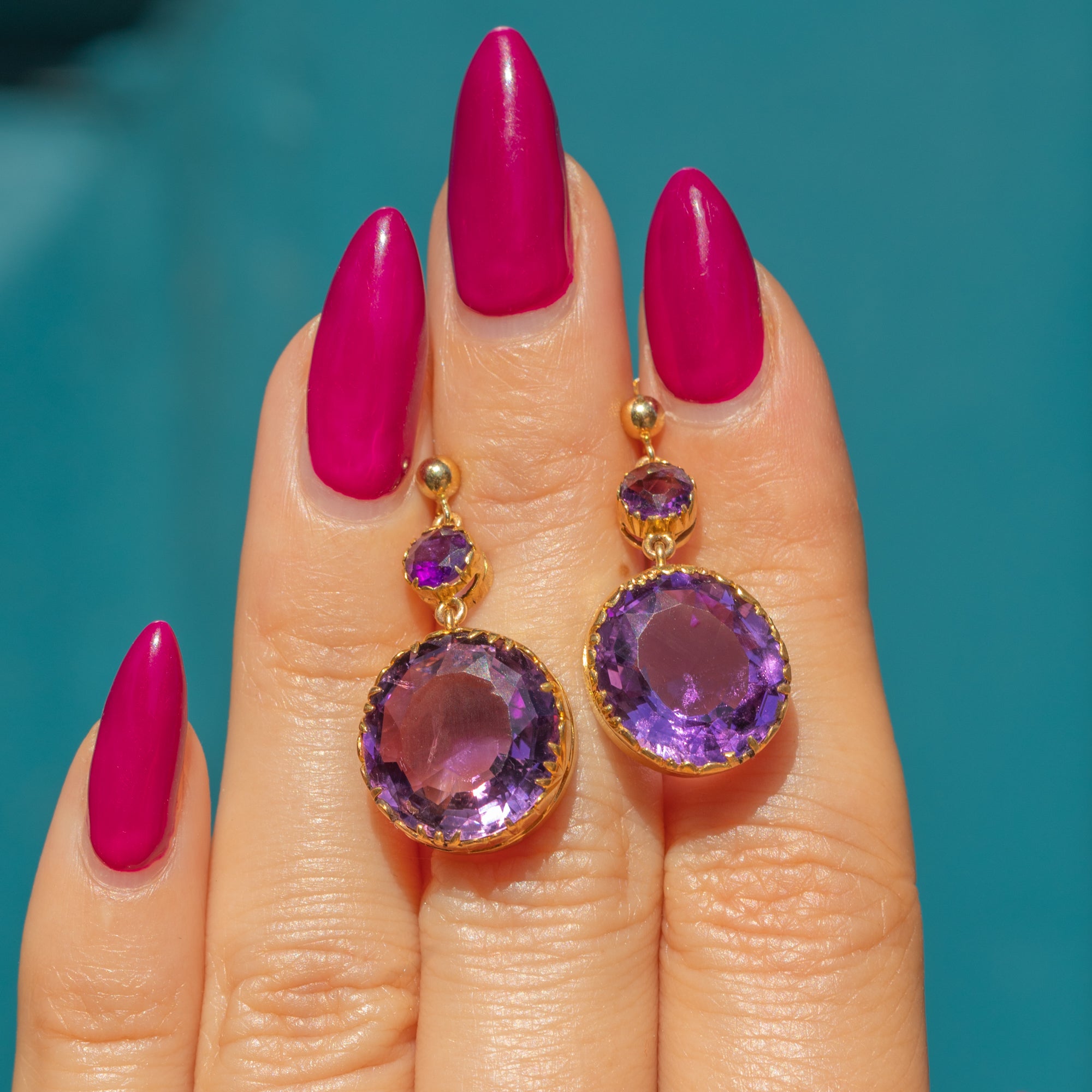 EXCELLENT: The Amethysts are stunning, vibrant and securely set, with no chips or surface wear. The Gold has a rich, buttery hue and shows no signs of wear around the settings, ensuring the gemstones remain securely set. There are subtle signs indicating the earrings were once converted from a different piece of jewellery, adding a touch of history to their charm.