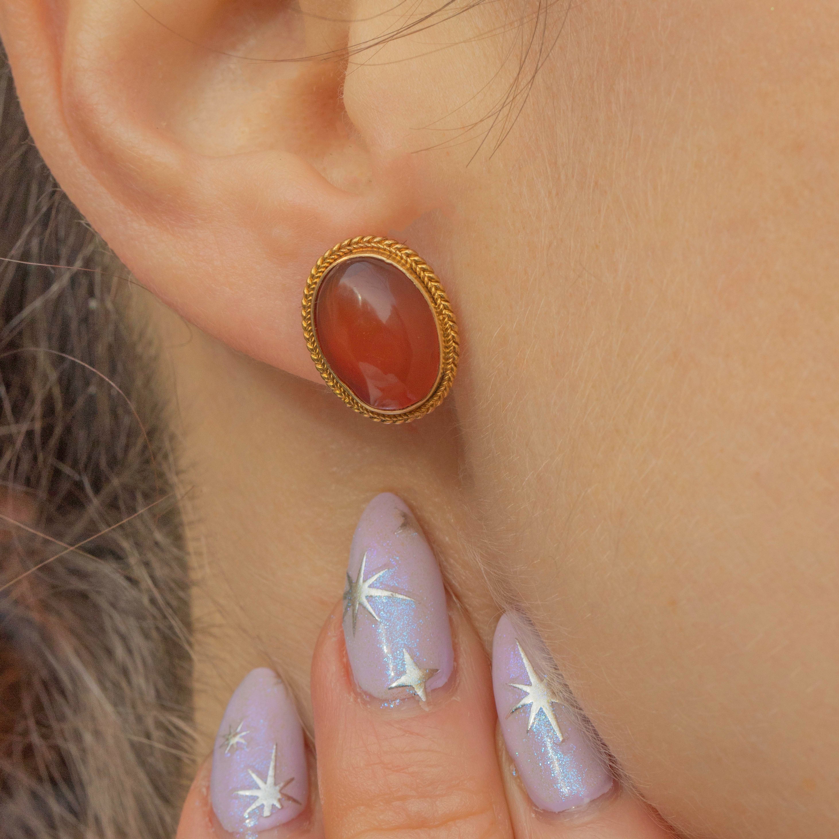 Each inlaid with a glossy Carnelian cabochon, these earrings are a versatile pair you can wear every day.