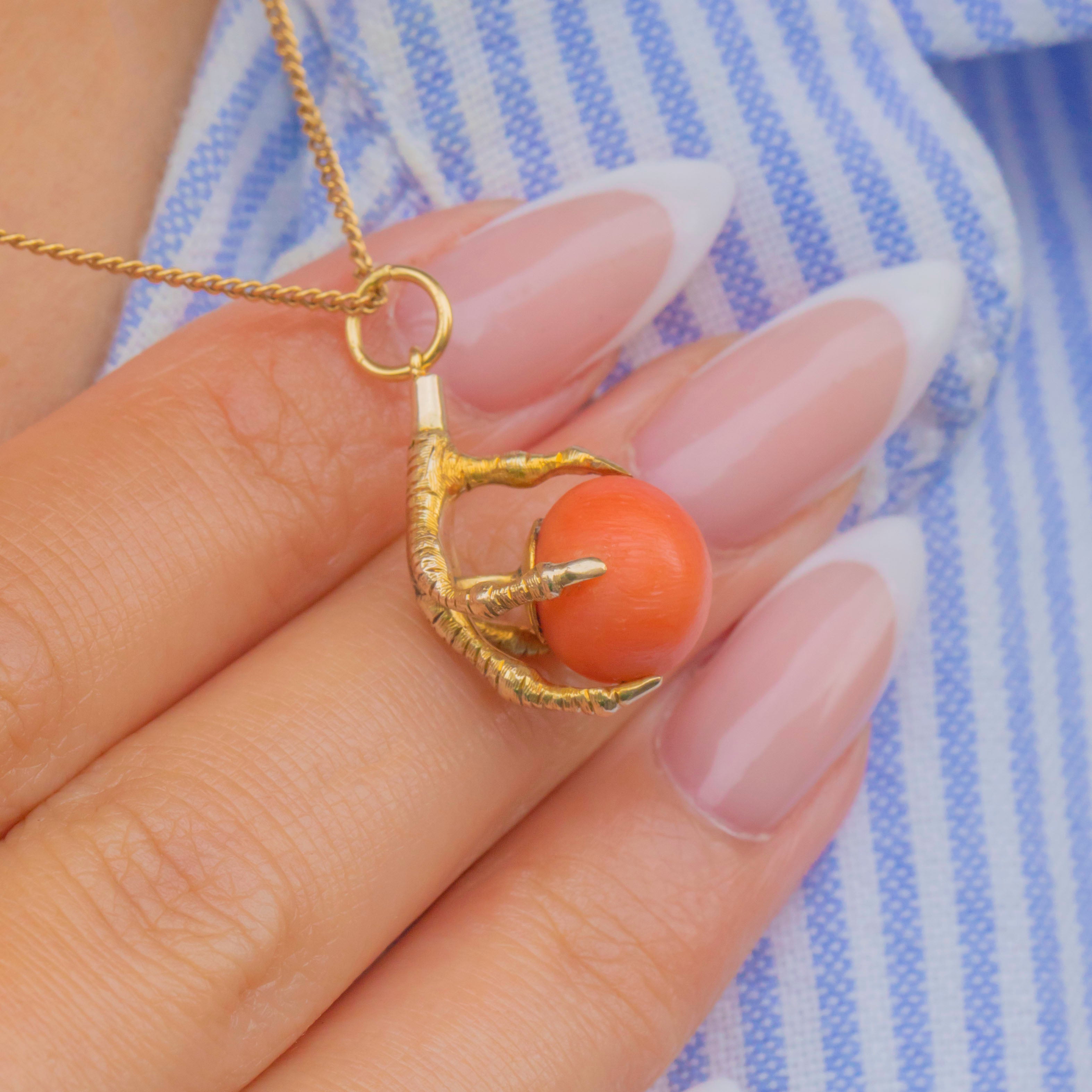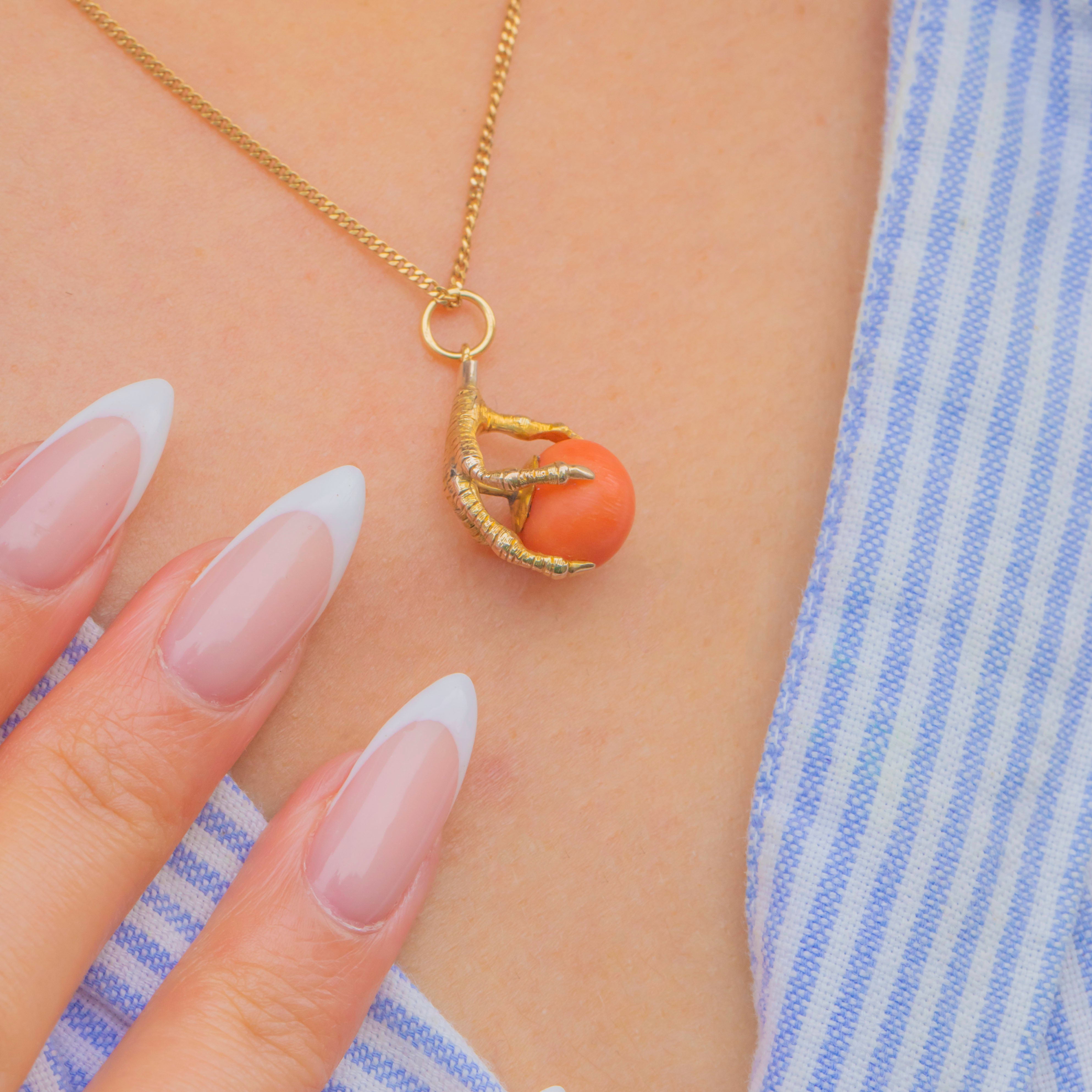 Distinctive and delightfully tactile, this Victorian pendant is crafted in rich 15ct Gold as a lifelike claw clasping a smooth Coral orb. The sculpted talon wraps around the gemstone with wonderful texture and definition, creating a striking contrast to the soft, satin sheen of the Coral.