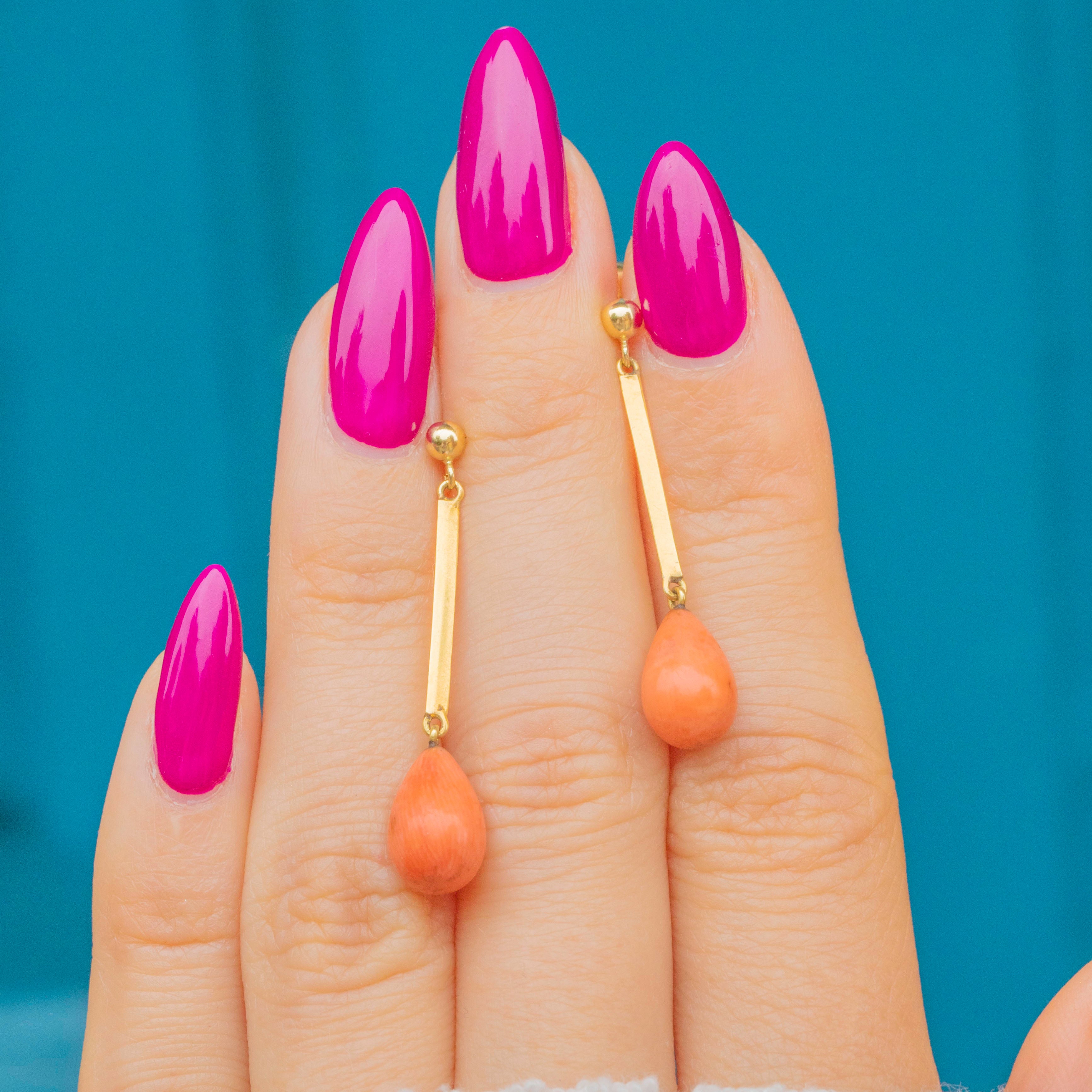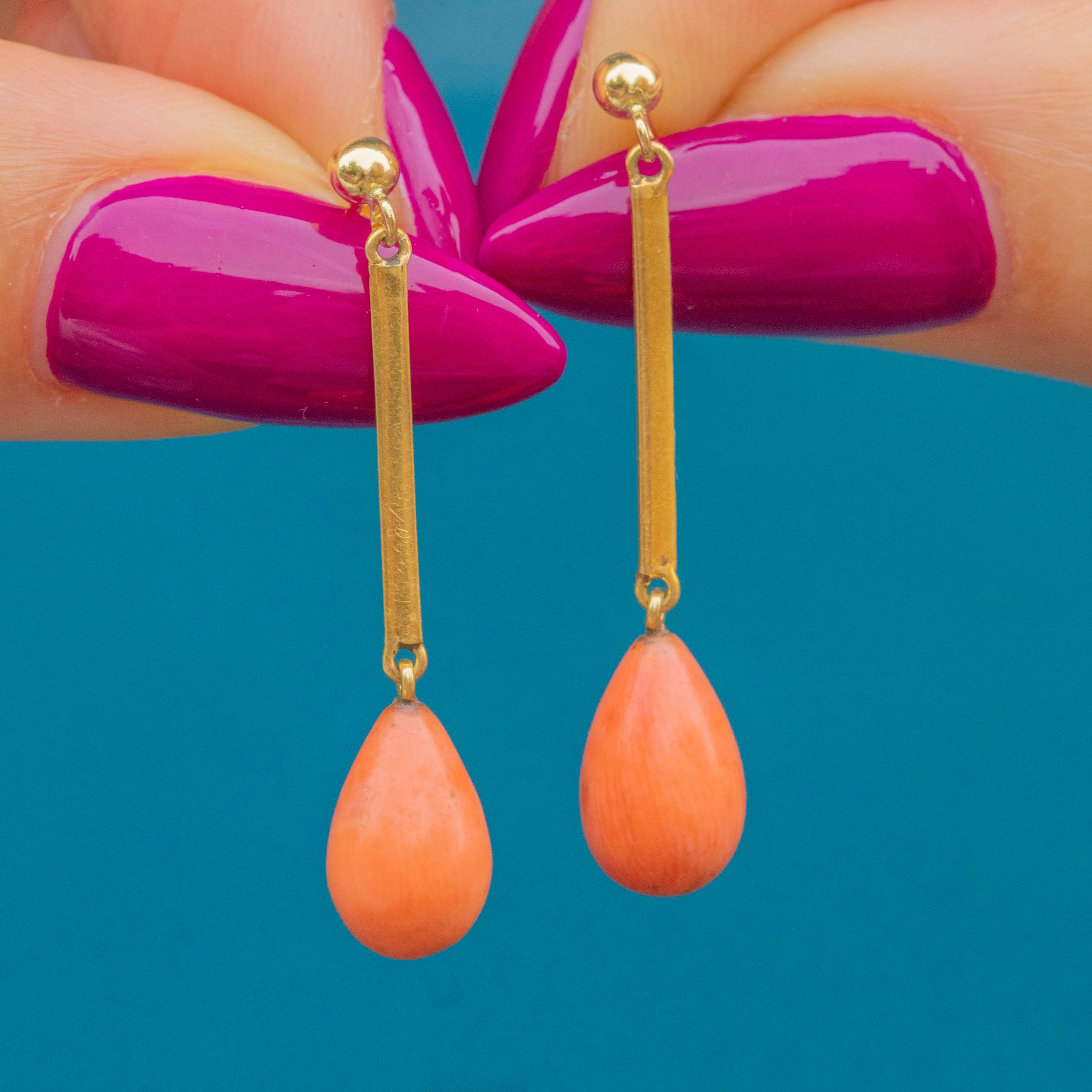 These antique drop earrings are complete with a smooth droplet of peachy pink Coral, each suspended from an elegant 15ct Gold knife drop bar.
