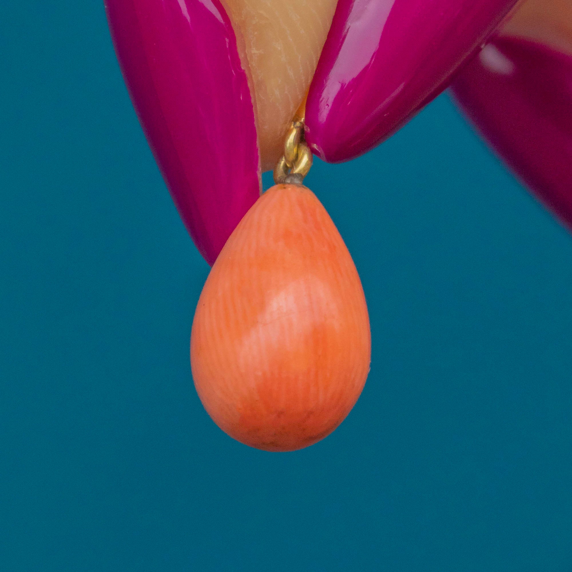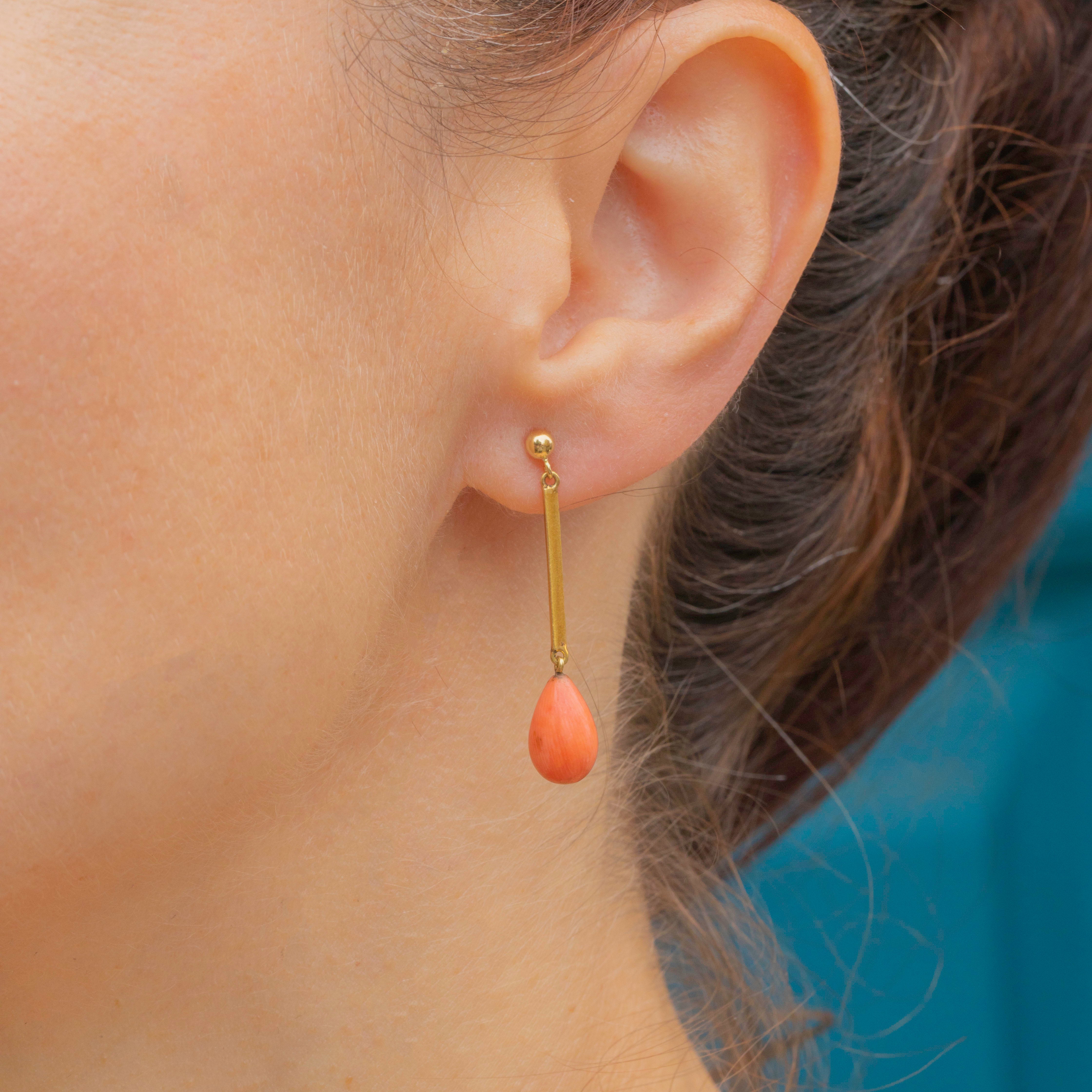 The natural Coral drops have a lovely sunset orange hue, perfectly complemented by the glossy 15ct Gold settings and dance with movement as they suspend from your lobes.