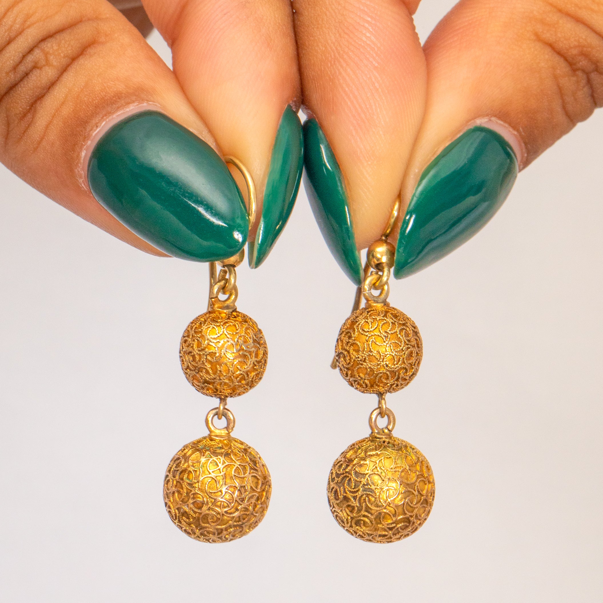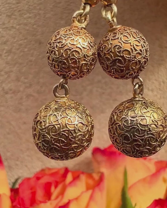 These exquisite antique 15ct Gold decorative ball drop earrings exude timeless elegance and charm. Crafted with meticulous attention to detail, each earring is home to two Gold spheres with delicate filigree wire embellishments for a decorative finish.
