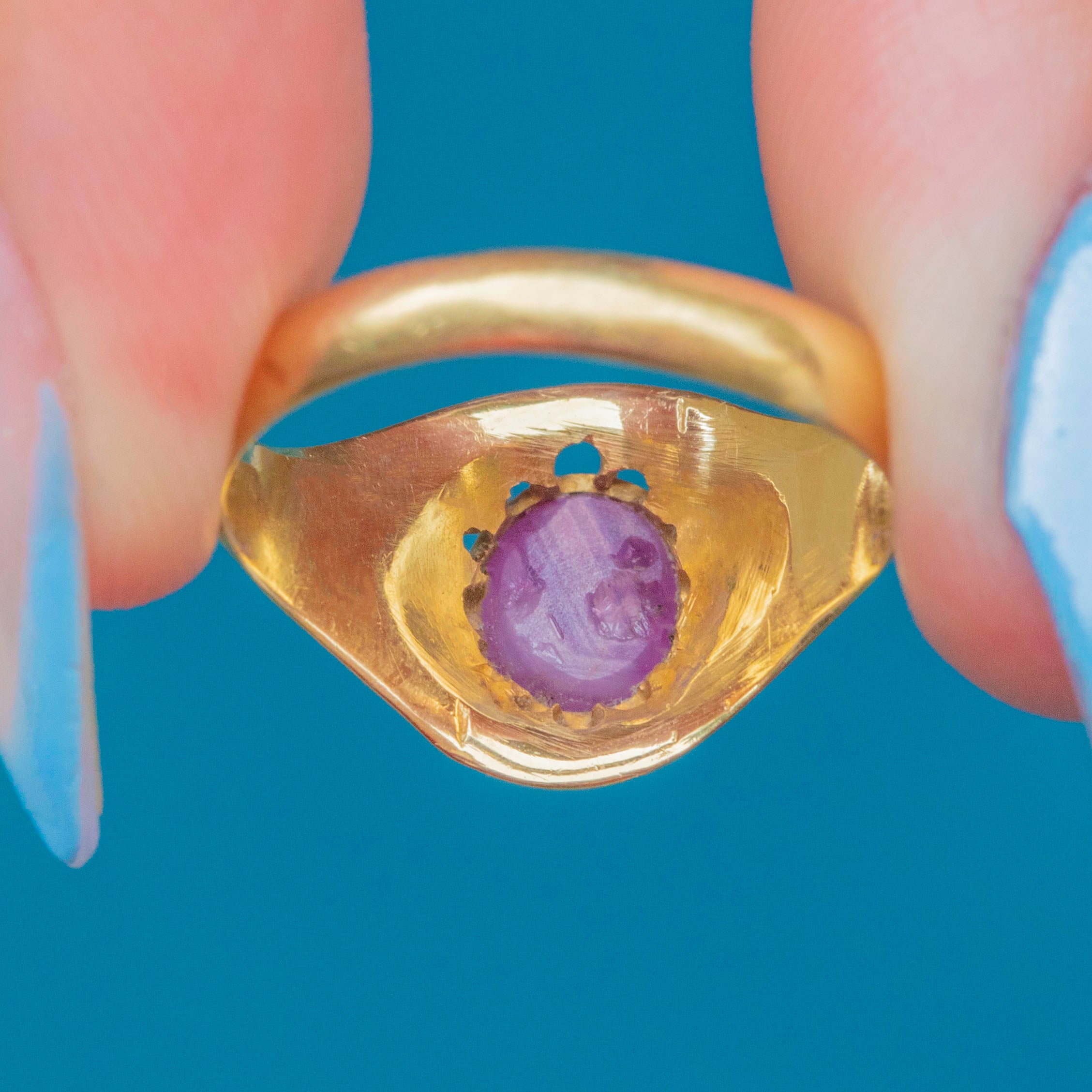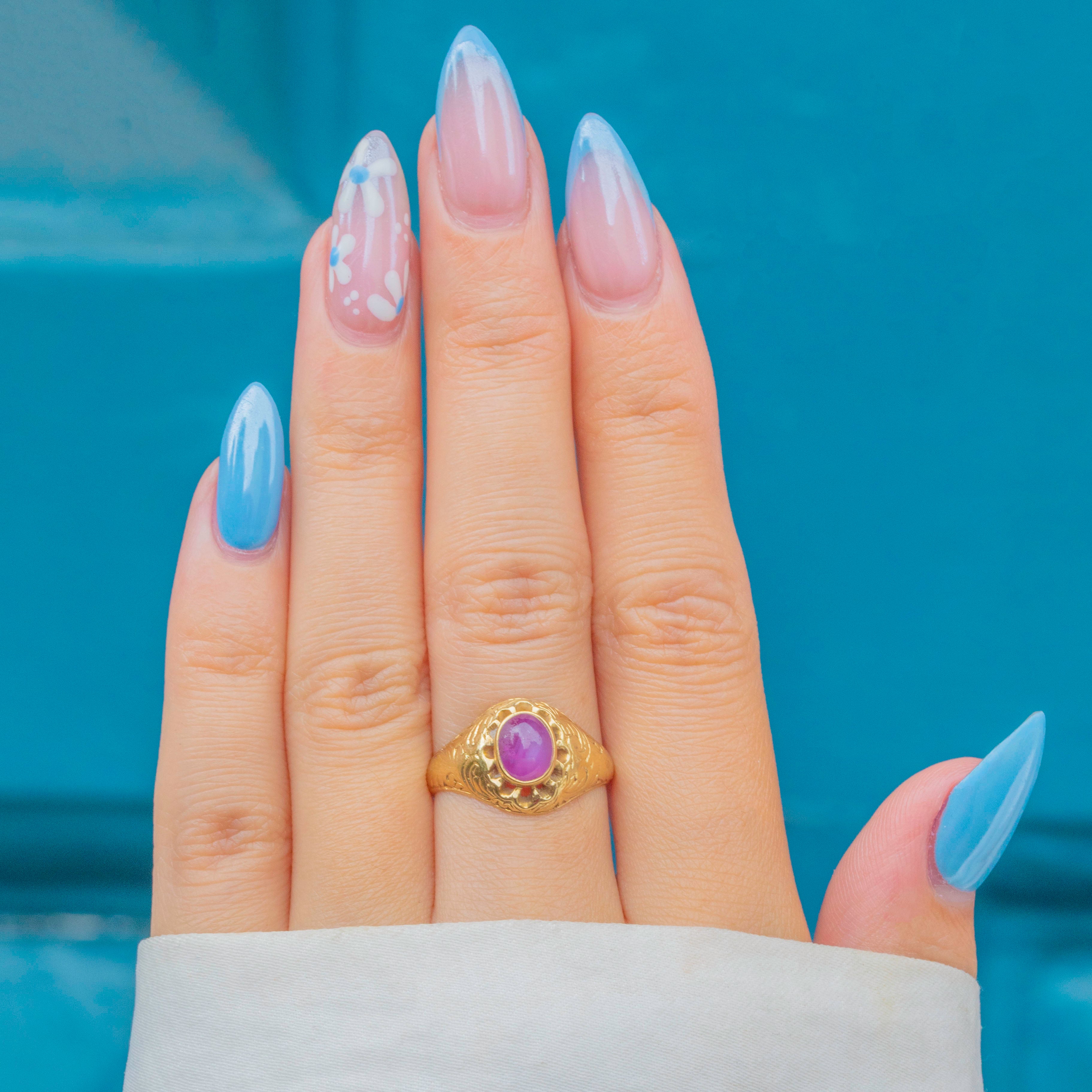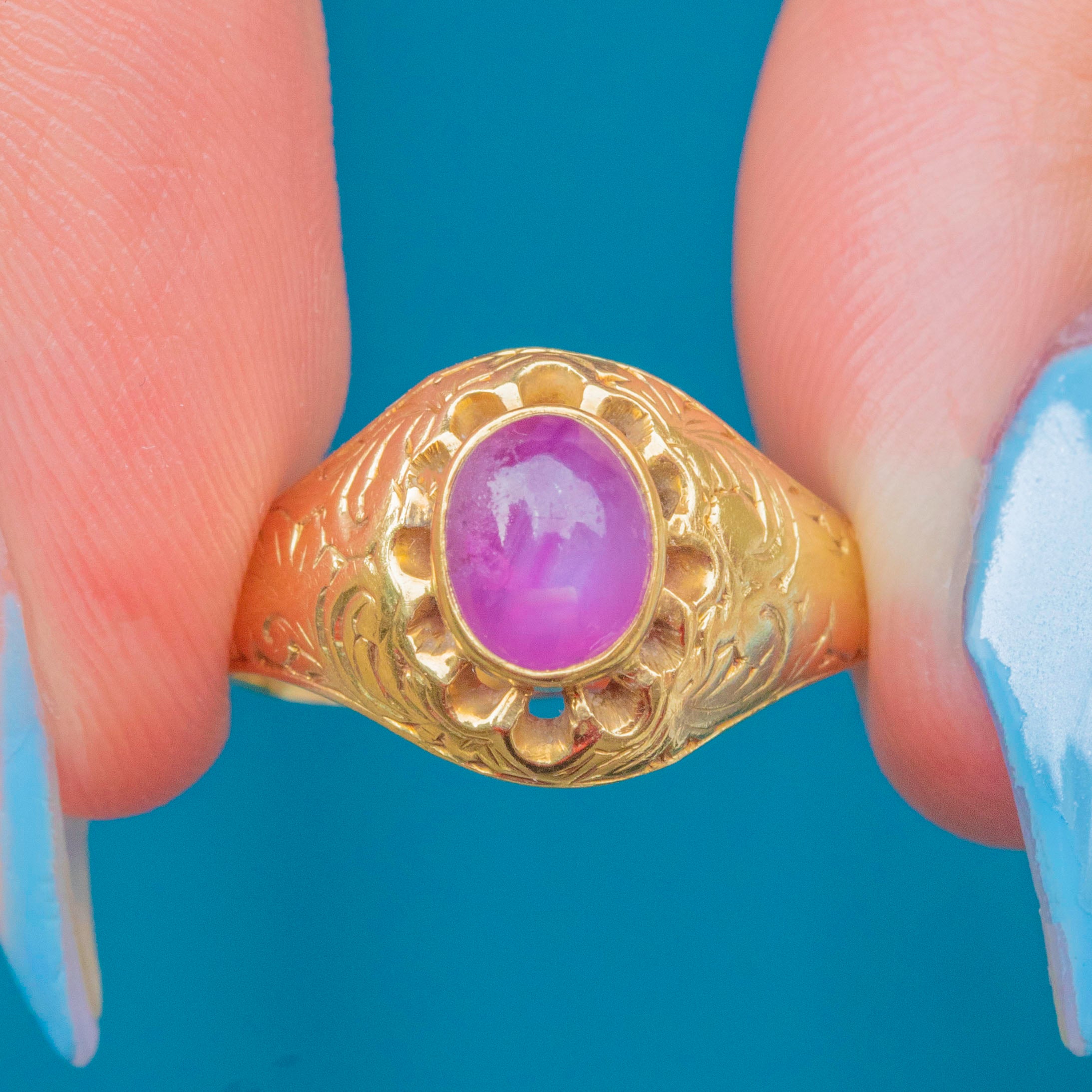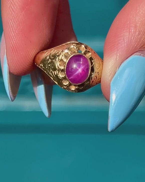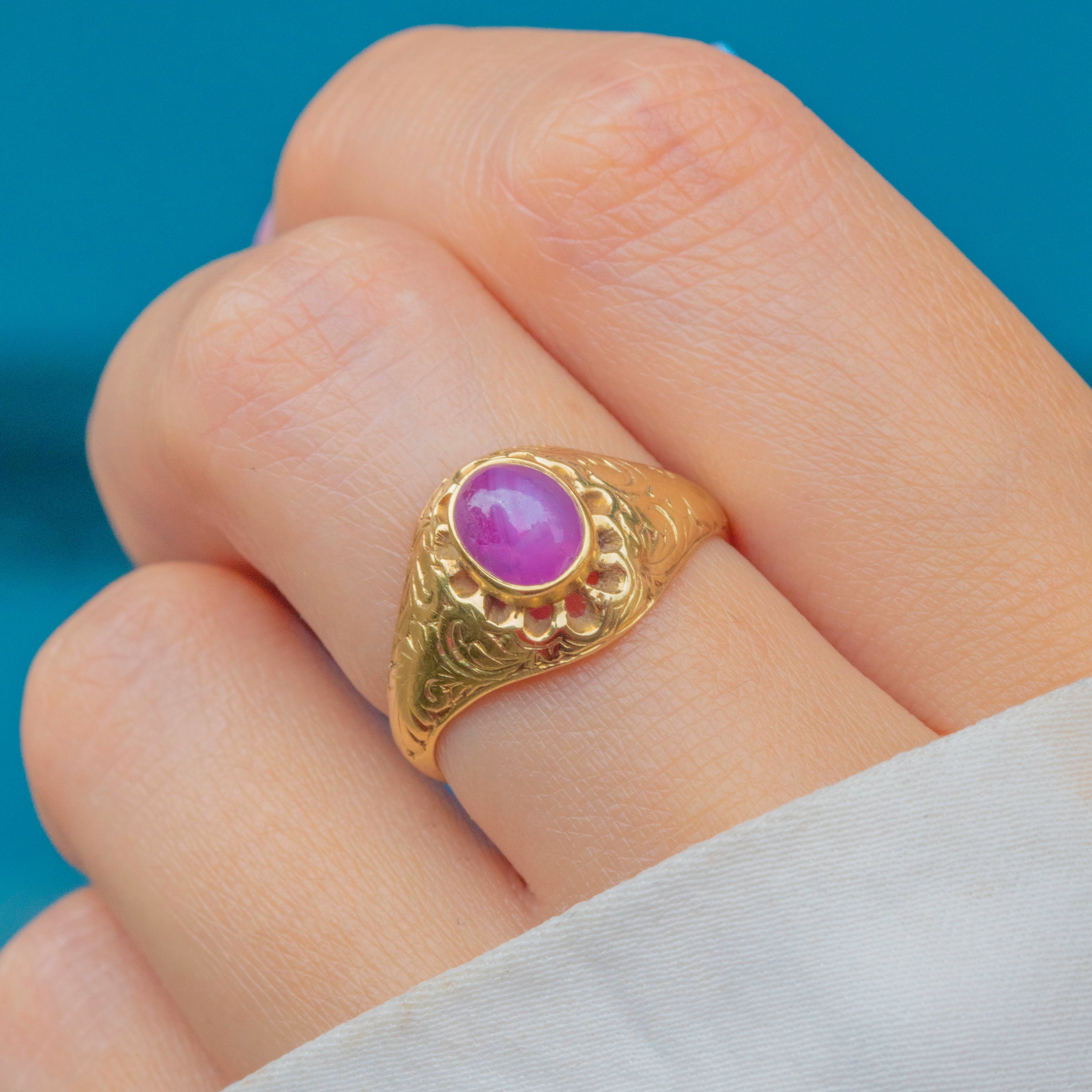 This engraved Victorian ring boasts a resplendent Star Ruby in its centre, radiating saturated magenta hues and flaunting a distinct asterism which provides the gemstone its namesake 'star'.