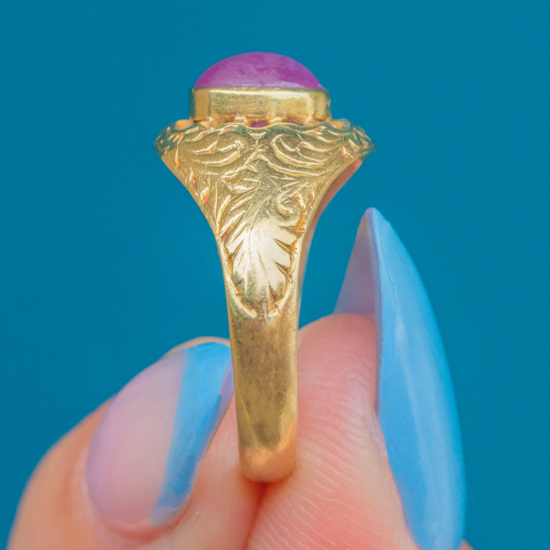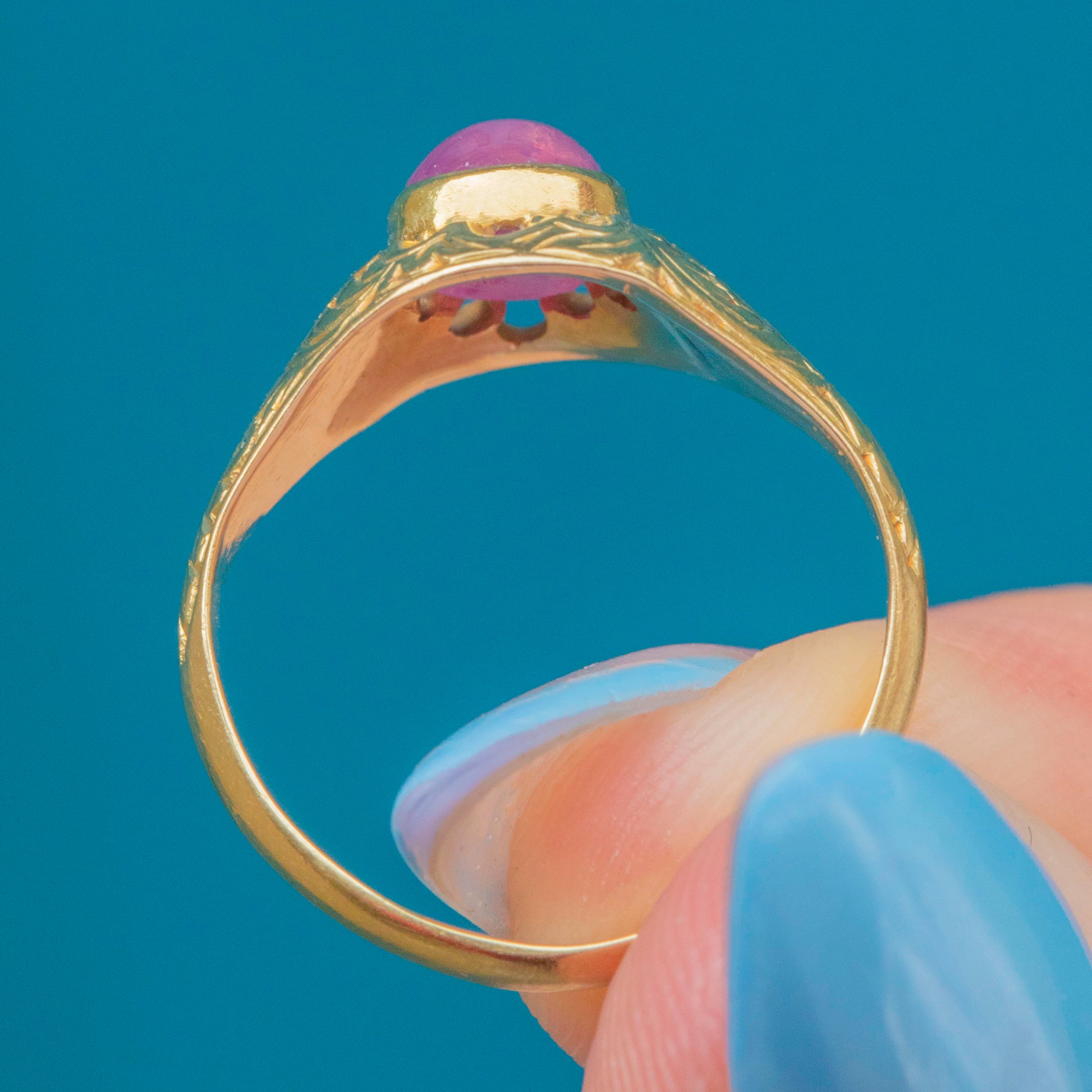 The Ruby is encircled by an intricately engraved band, crafted from bright and glossy 15ct Gold, givinhg it bundles of antique charm.