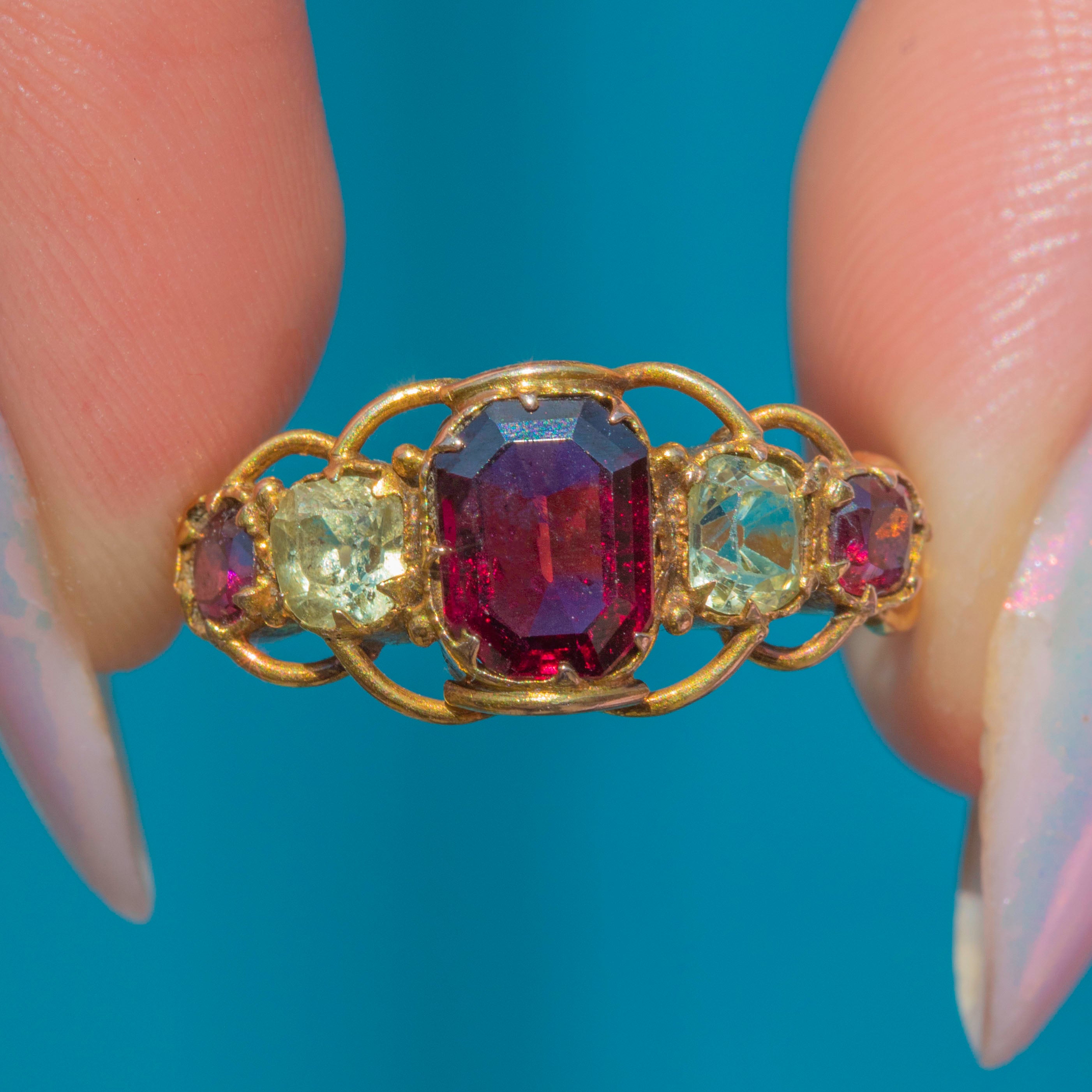 A charming Victorian five stone Garnet and Chrysoberyl openwork ring, crafted from glossy 15ct Gold!