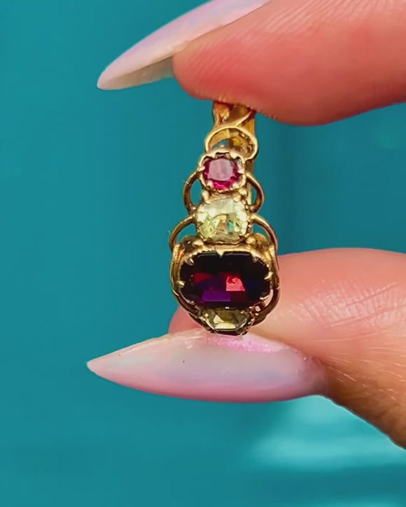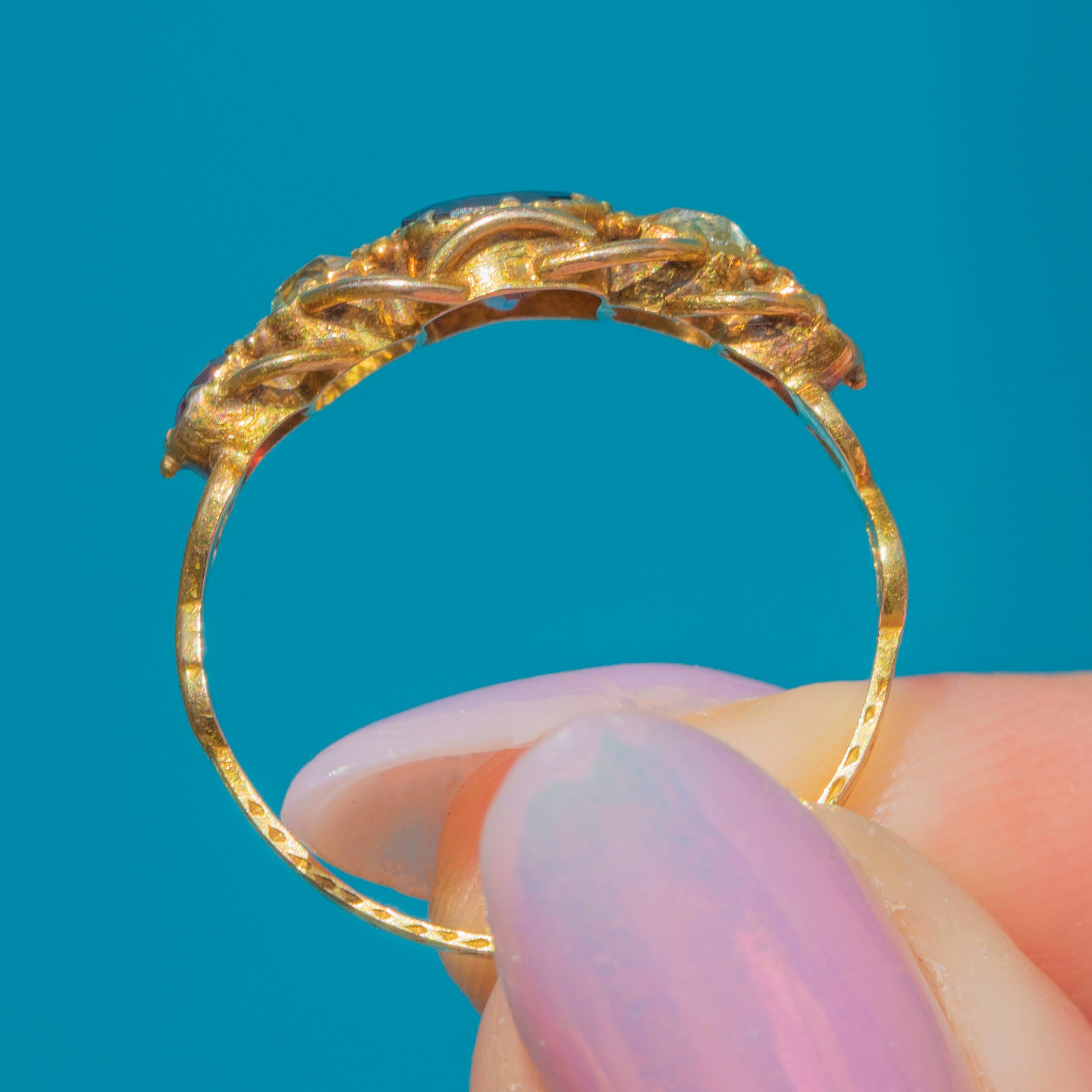 The ring face is comprised of three juicy Garnets interspersed with cool, sage green Chrysoberyl, each gemstone married by the warmth of the bright 15ct Gold. She is complete with ornate openwork settings and a finely detailed band, providing undeniable Victorian antique allure!