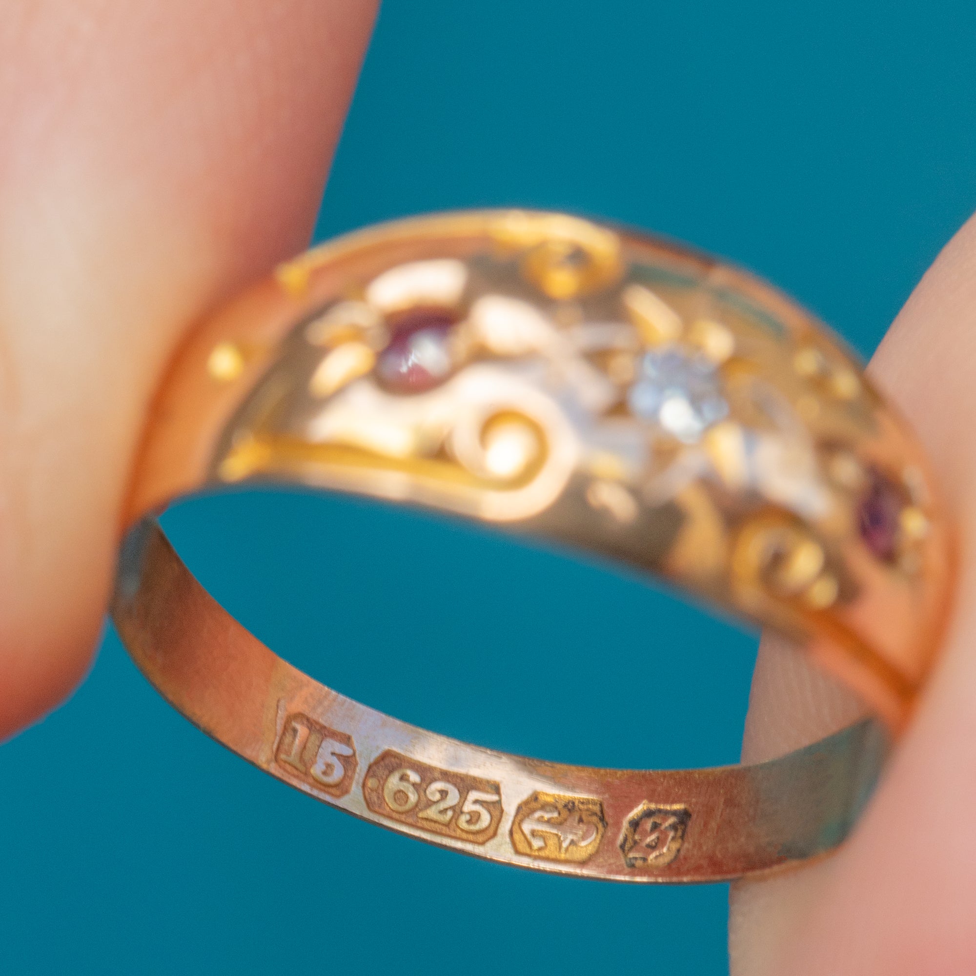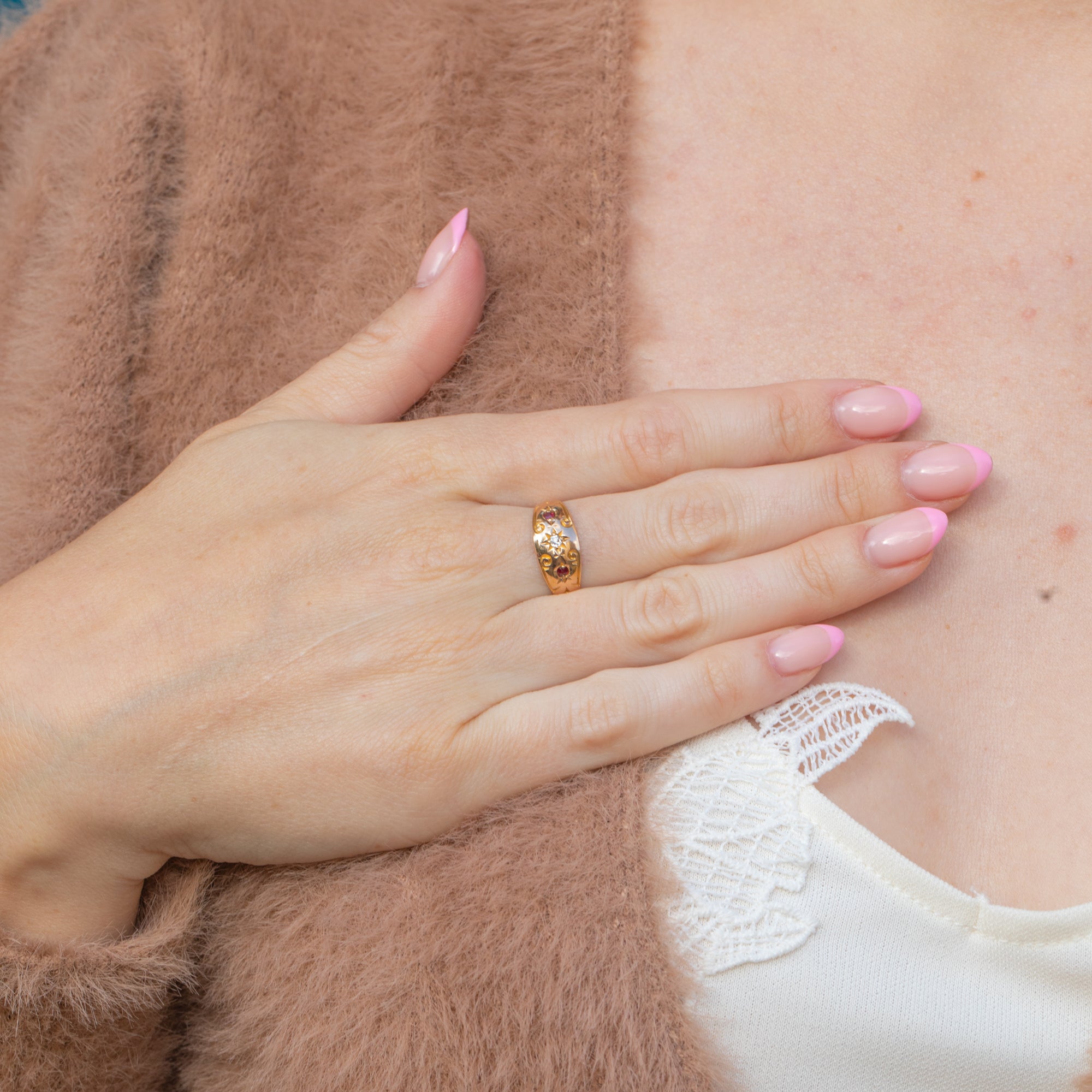 EXCELLENT. This Victorian 15ct Gold Diamond Garnet gypsy ring is in wonderful condition. Her gemstones are all securely set with no chips to note. The Gold remains in great nick, with a wonderful saturation and no dings to its smoothly domed profile. The hallmarks are all intact, making this the perfect Victorian treasure for your jewellery collection!