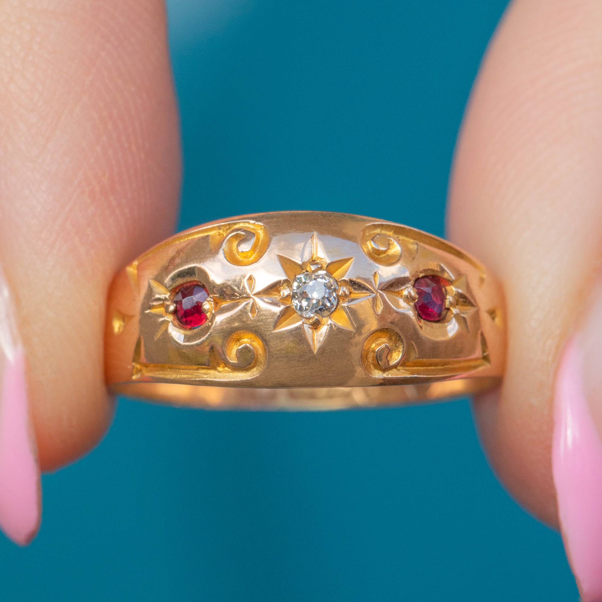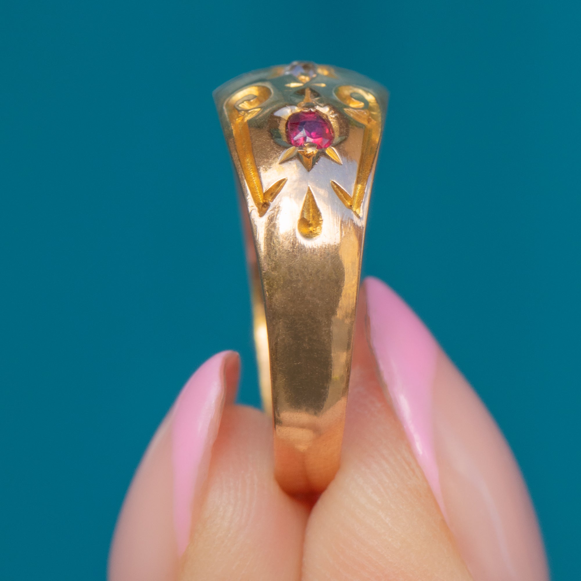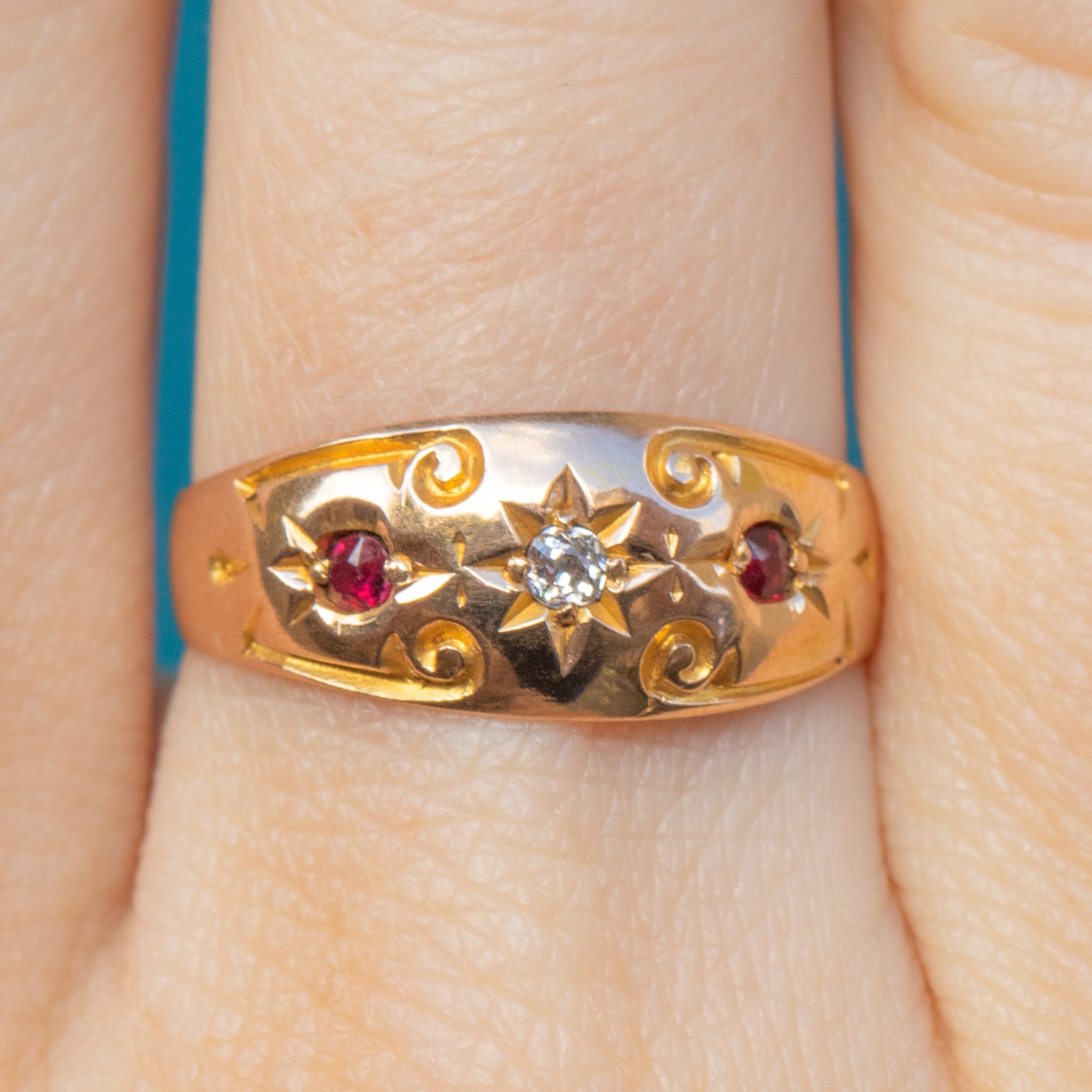 What a gorgeous antique 15ct Gold Diamond Garnet gypsy ring! Featuring two cherry-red Garnets and a single sparkling Diamond, this Victorian 15ct Gold ring has a smooth and perfectly domed profile so she feels wonderful on the hand and catches the light just so!