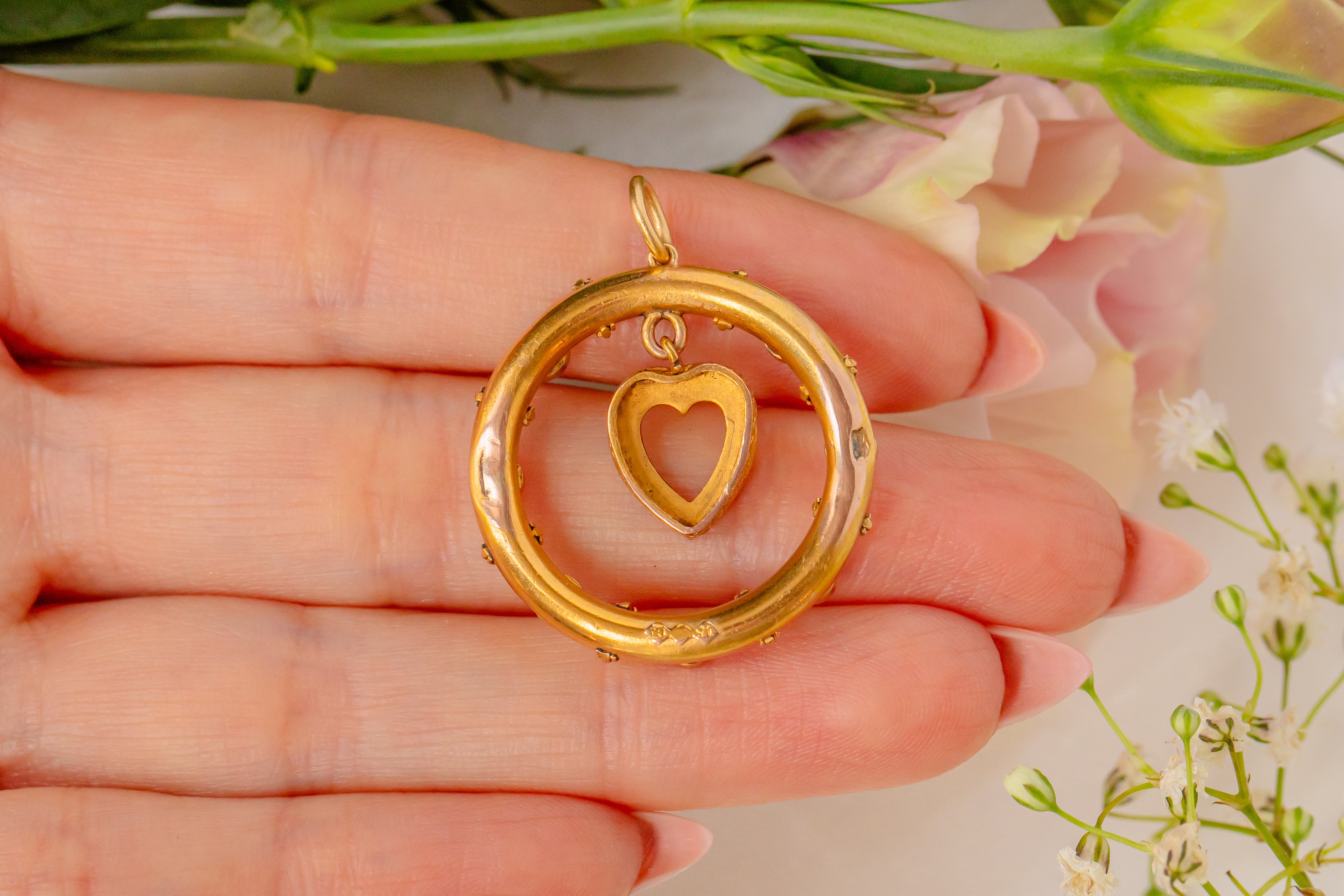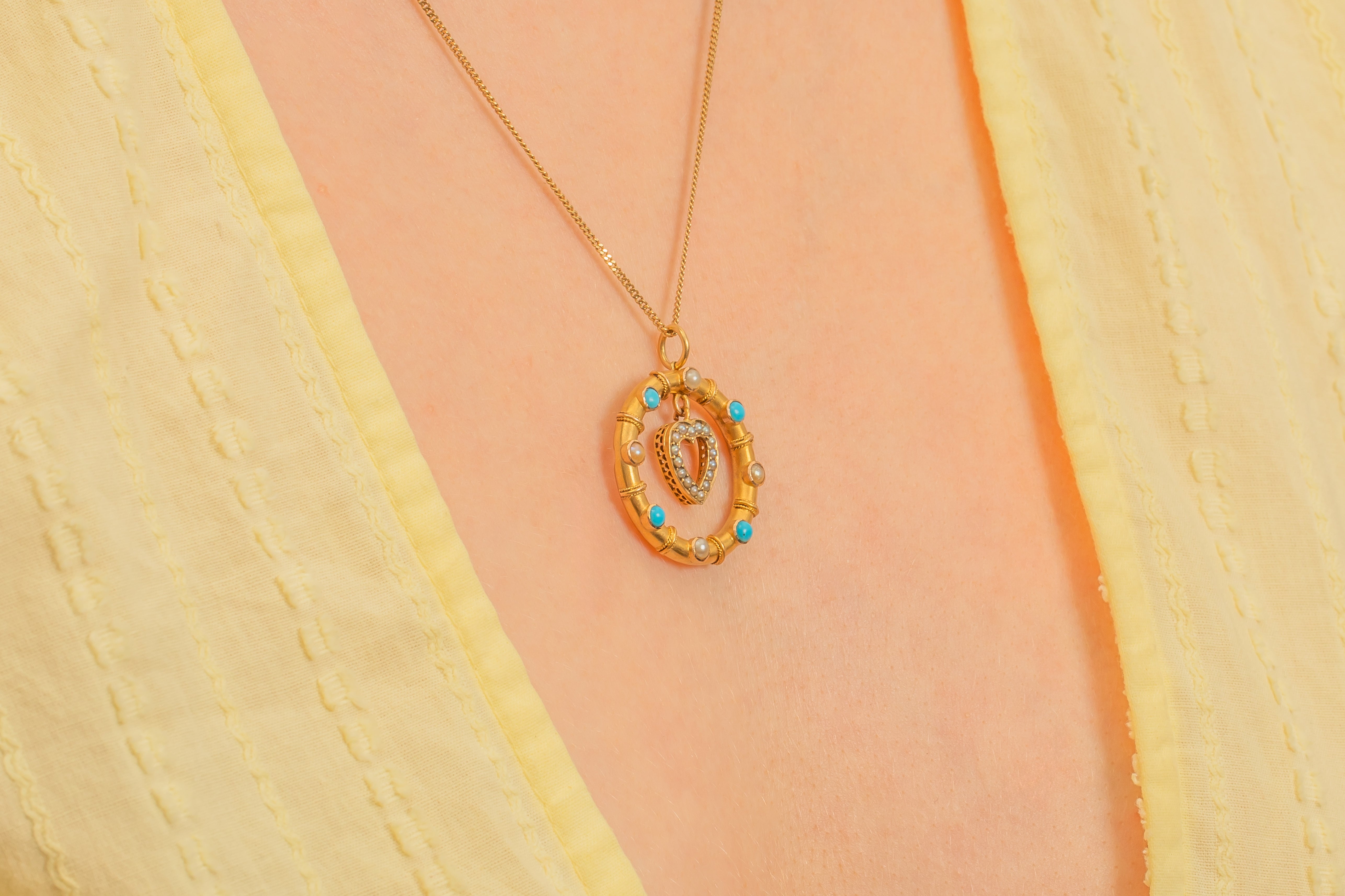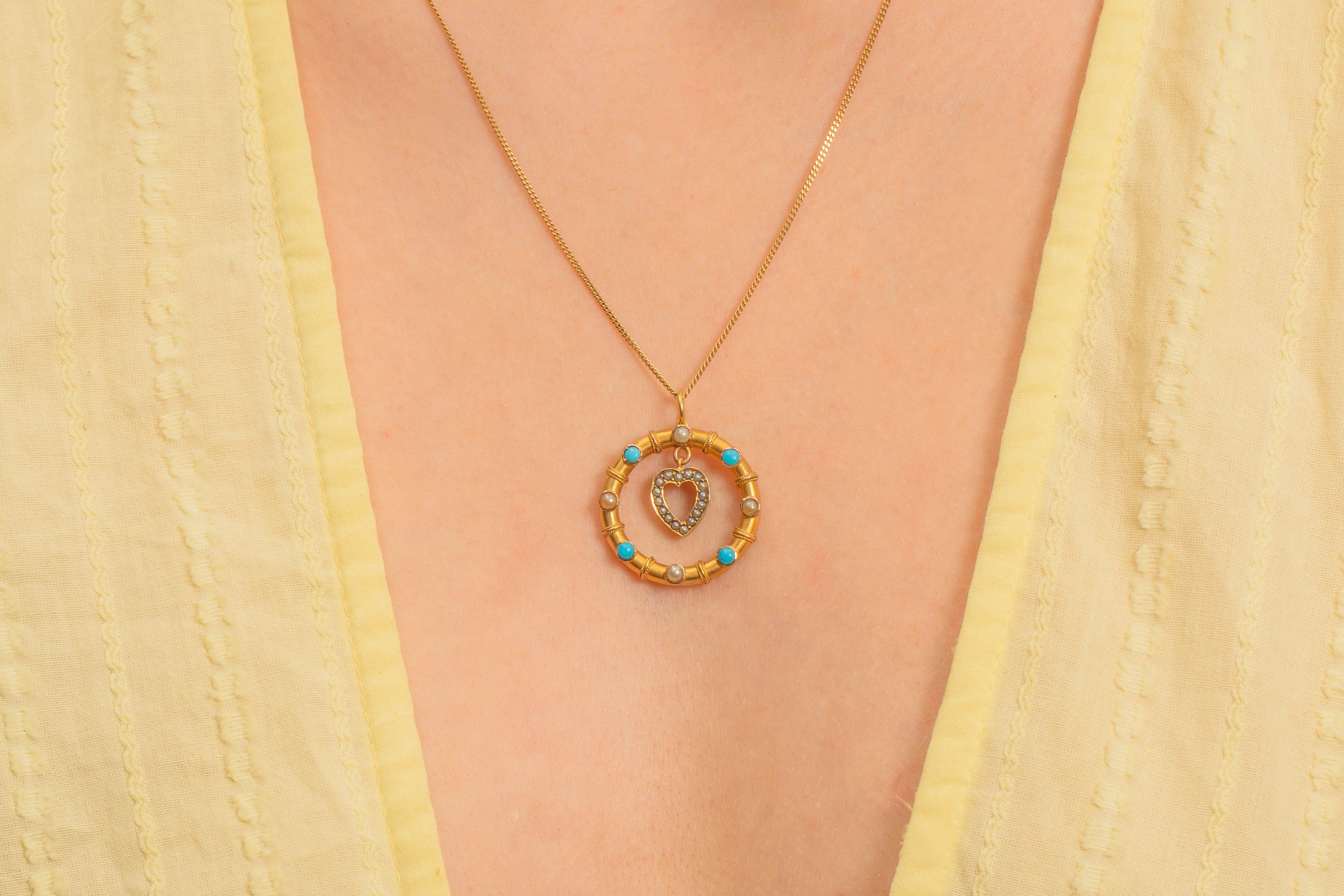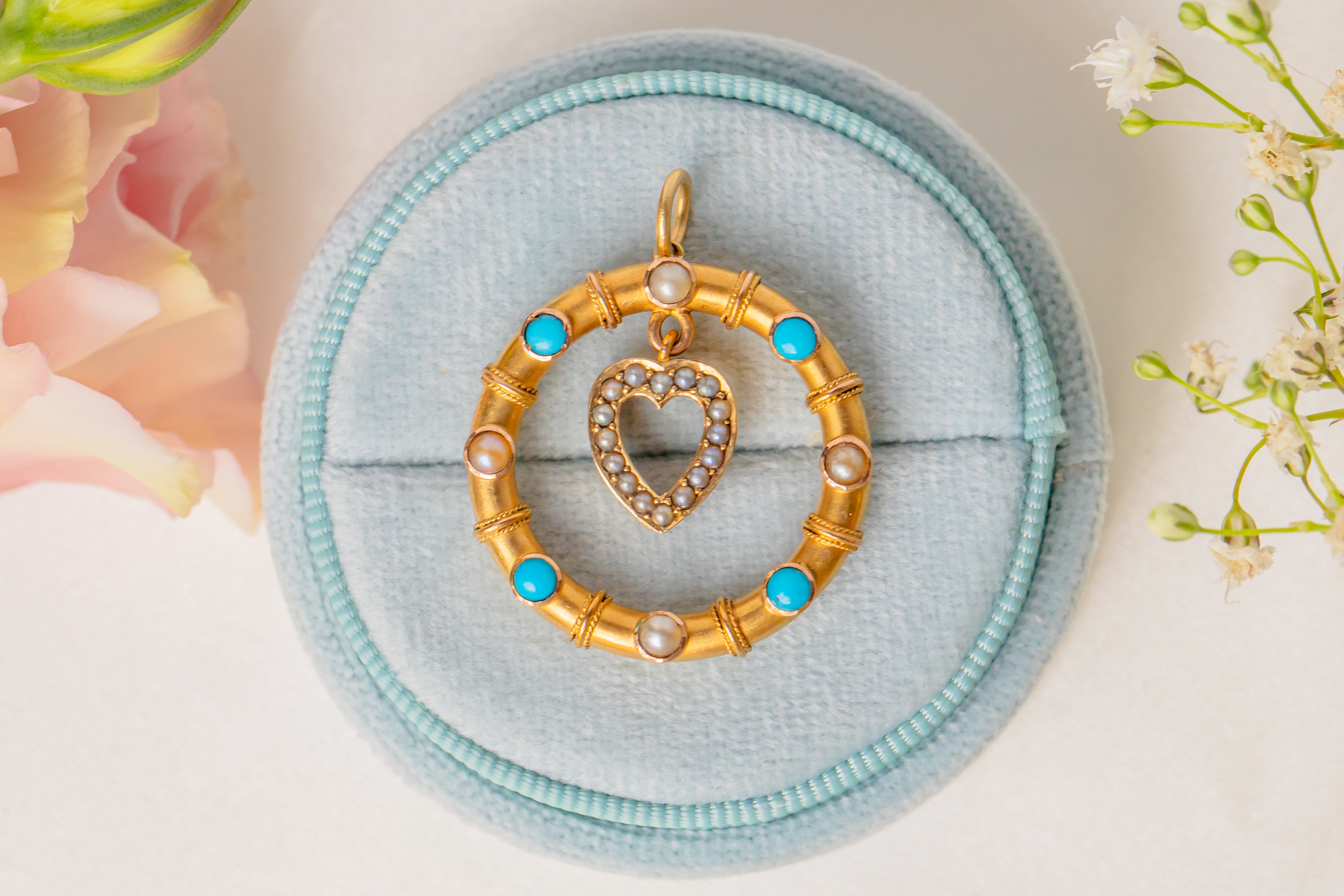 We simply adore this antique 15ct Gold heart drop Turquoise Pearl pendant! This gorgeous Gold pendant is buttery and bright, with a sweet little heart at the centre.