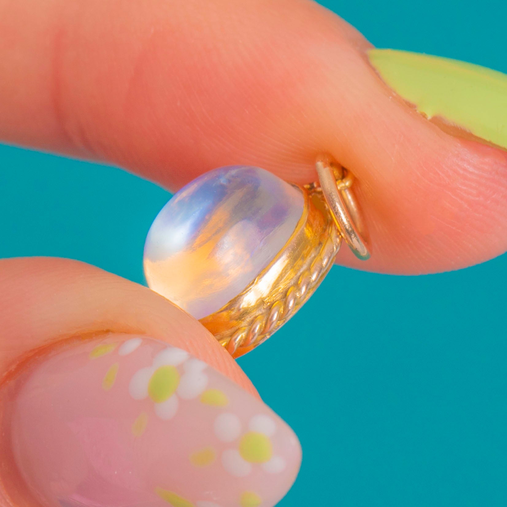 Ethereal and elegant, this Victorian Moonstone charm is a petite treasure in buttery 15ct Gold. The oval cabochon Moonstone shimmers with beautiful adularescence, casting blue-white flashes with hints of peach and lilac as it moves. A neatly executed bezel is framed by a delicate rope-twist border, lending subtle texture and vintage romance in a wearable, everyday scale.
