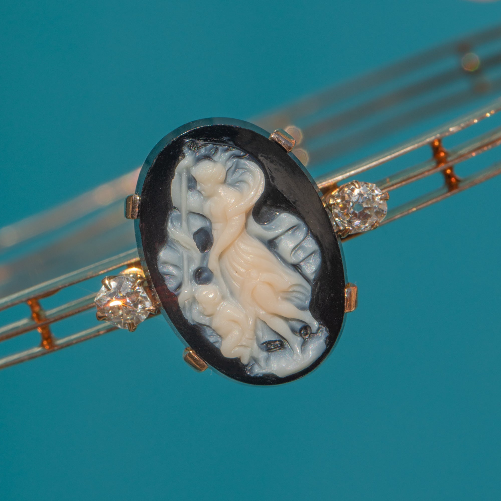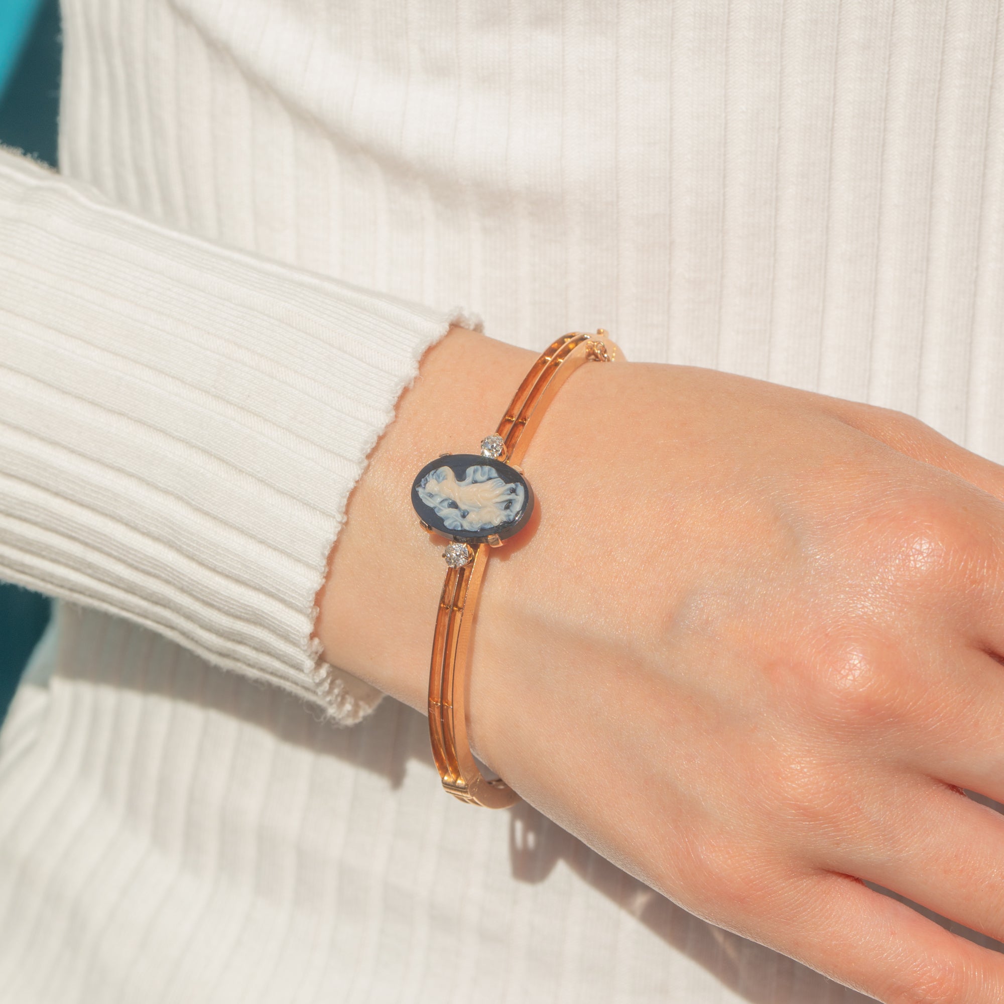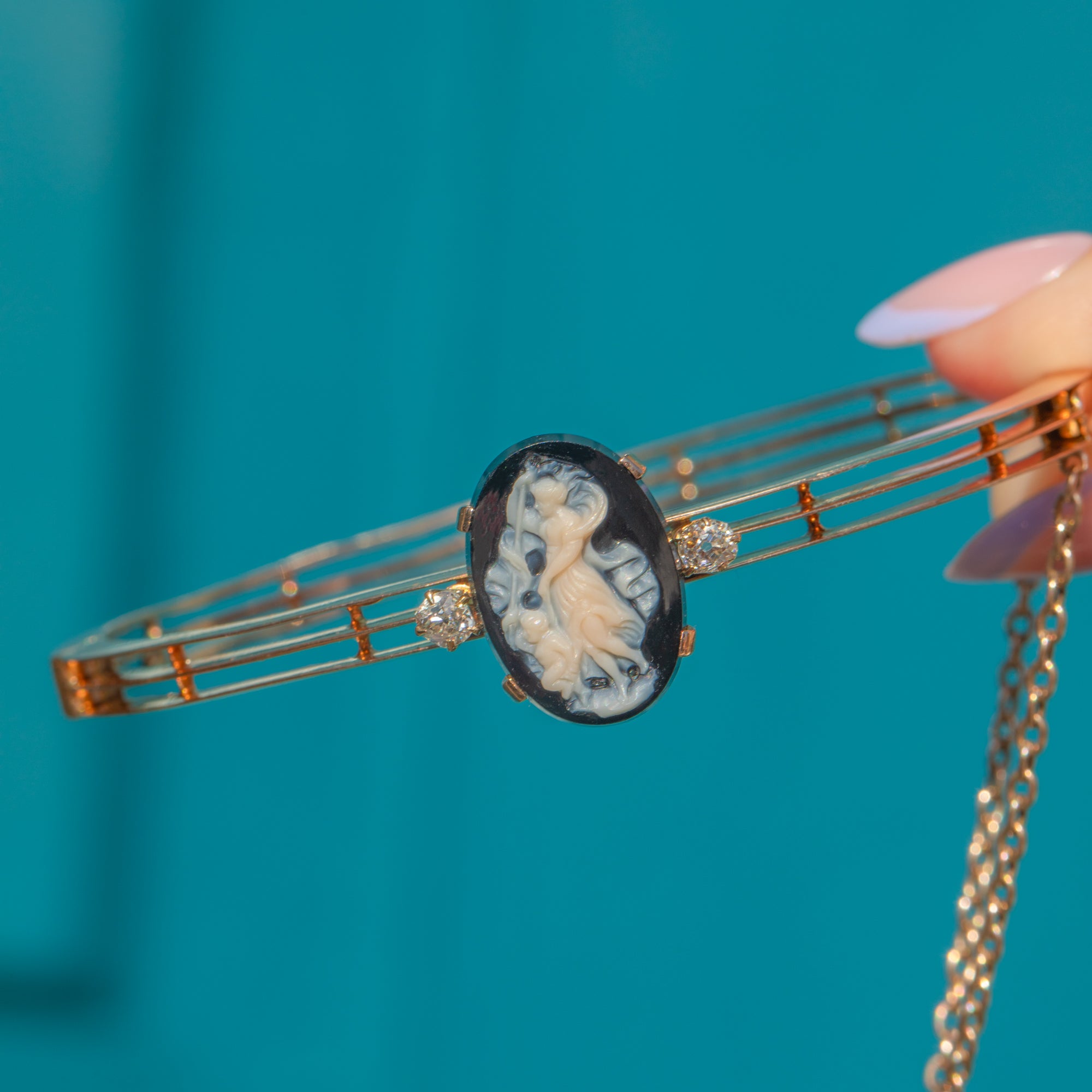 This antique 15ct Gold Onyx Cameo Diamond bangle is a true celebration of Victorian jewellery! The hand-carved Onyx displays exquisitely detailed figures, giving the piece a life-like appearance - one can only marvel at the skilled craftsmanship of this impressive bangle.