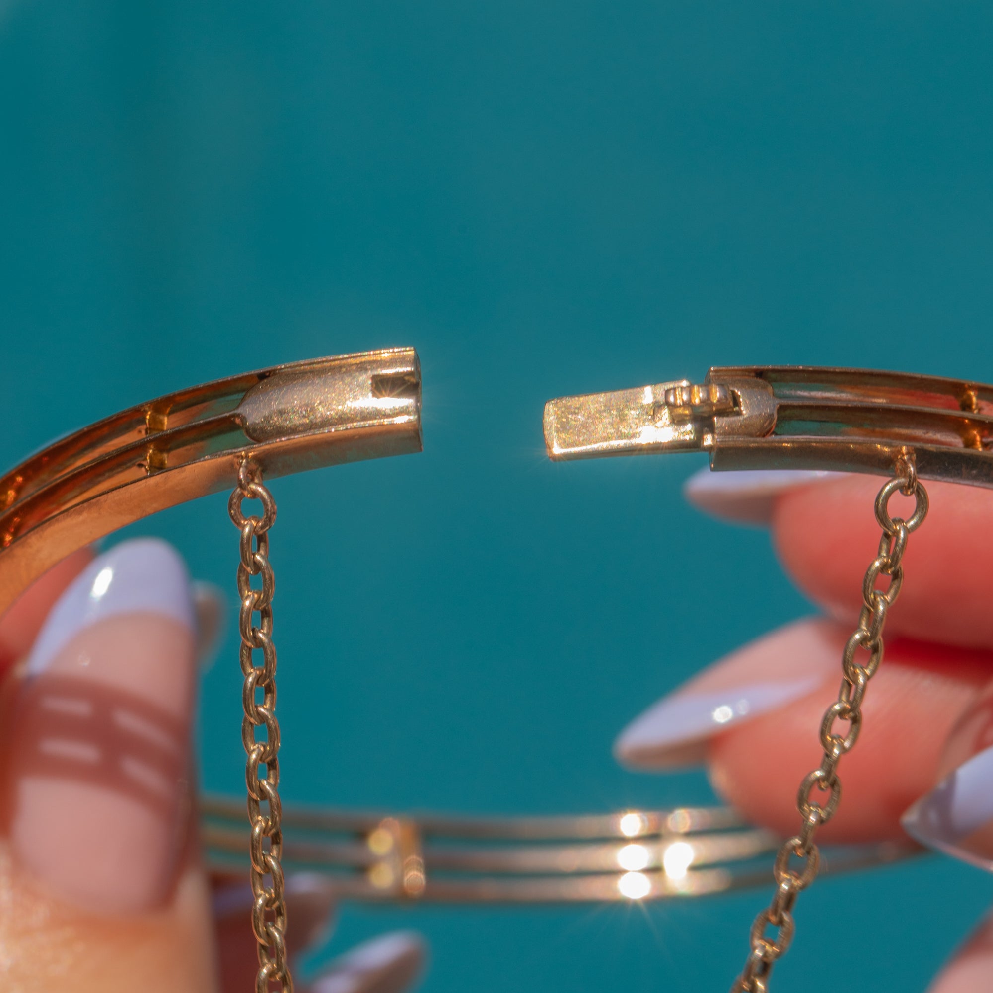 VERY GOOD-EXCELLENT: This antique 15ct Gold Onyx Cameo Diamond bangle is in wonderful condition. The Cameo is pristine, with no wear to the carved details, and the Diamonds are secure and free from flebaites or abrasions. Although the band has a few mild dings, these are only noticeable under close inspection and do not detract from the overall impact of the piece. The Gold is bright with a high-shine polish and the bangle closes securely. With the additional, solid 9ct Gold safety chain, you can enjoy wearing this outstanding antique Gold bangle with absolute confidence!