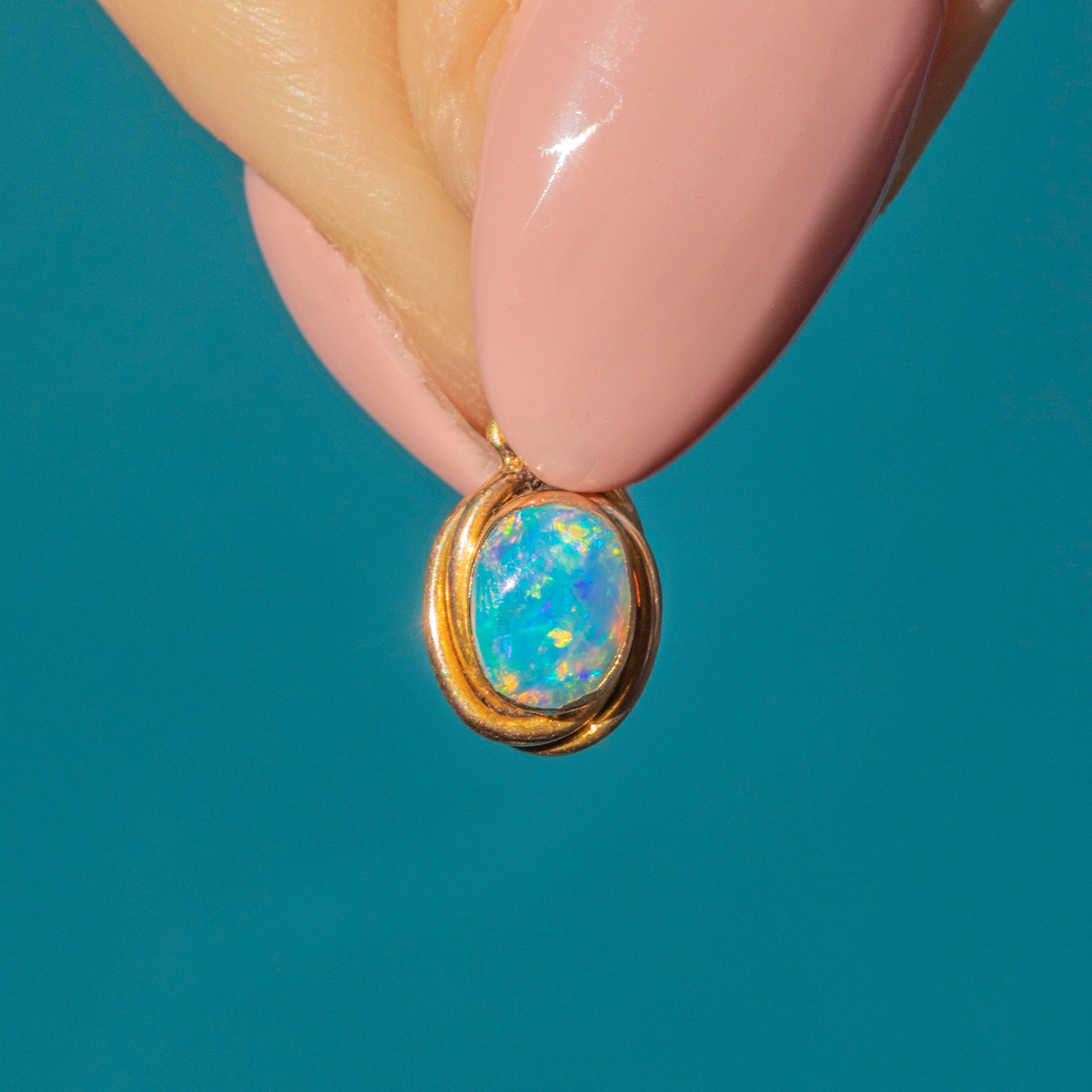 Add a vibrant pop of colour to your décolletage with this sensational antique 15ct Gold Opal charm! This Edwardian charm is dainty in size and is bursting with zingy hues, from azure blue with flecks of neon green, graduating to peachy pink dappled with acid orange.