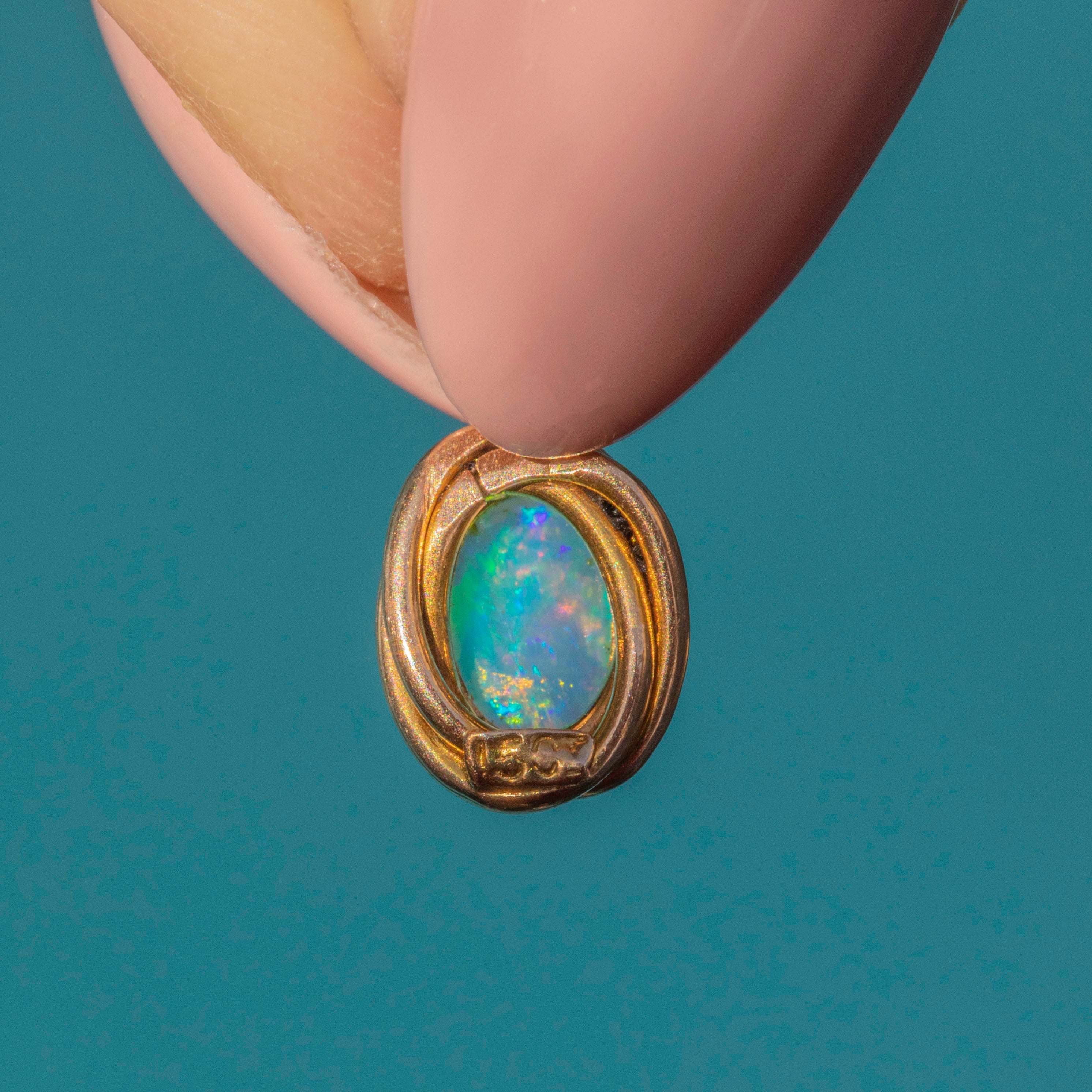 EXCELLENT. This antique 15ct Gold Opal charm is in excellent condition. The Opal cabochon has a lively display of colour, is smooth with no signs of wear, and securely held within its bezel setting. The Gold has a bright saturation throughout and the rare 15CT stamp on the back has remained crisp. All this antique Opal charm needs is a skinny Gold chain to adorn!