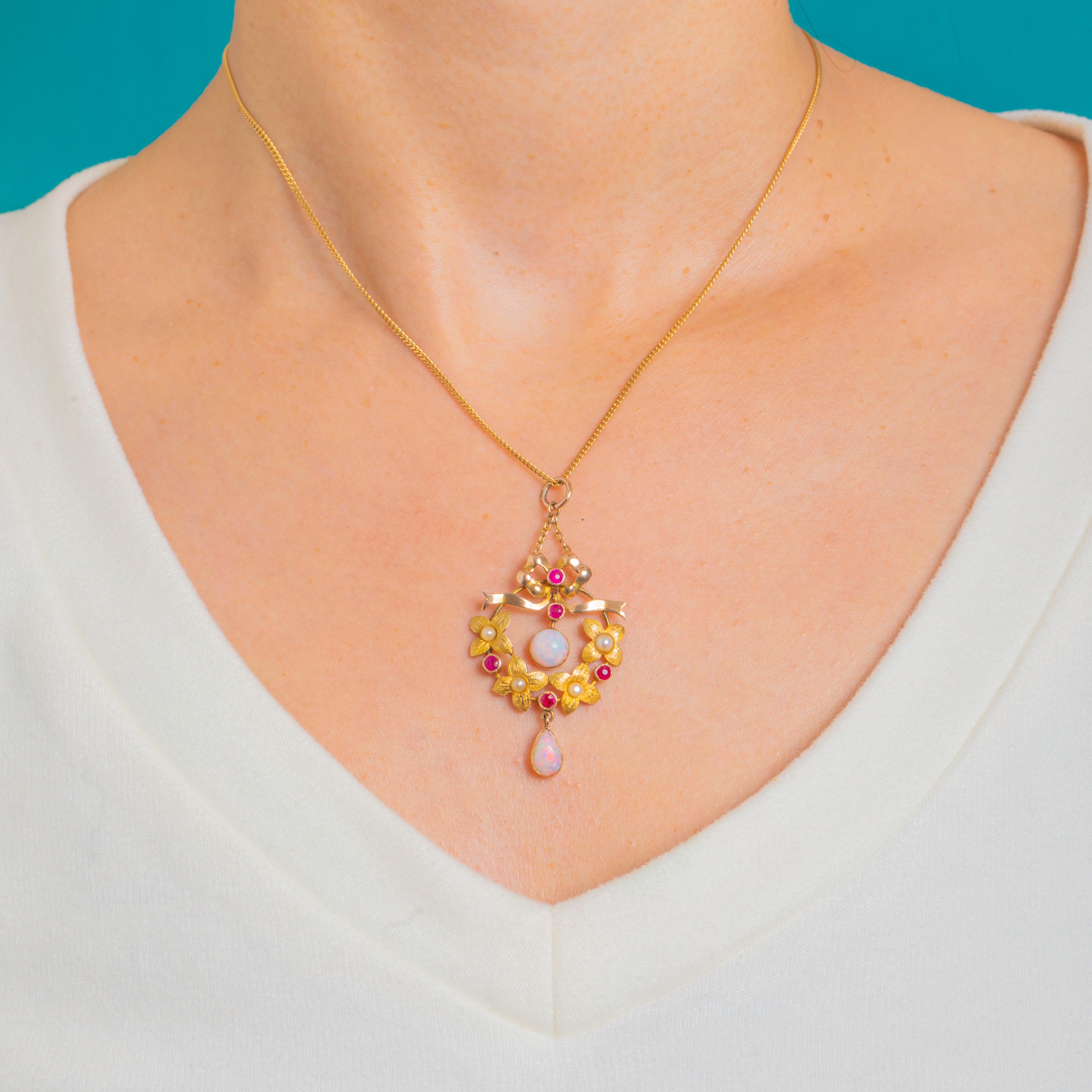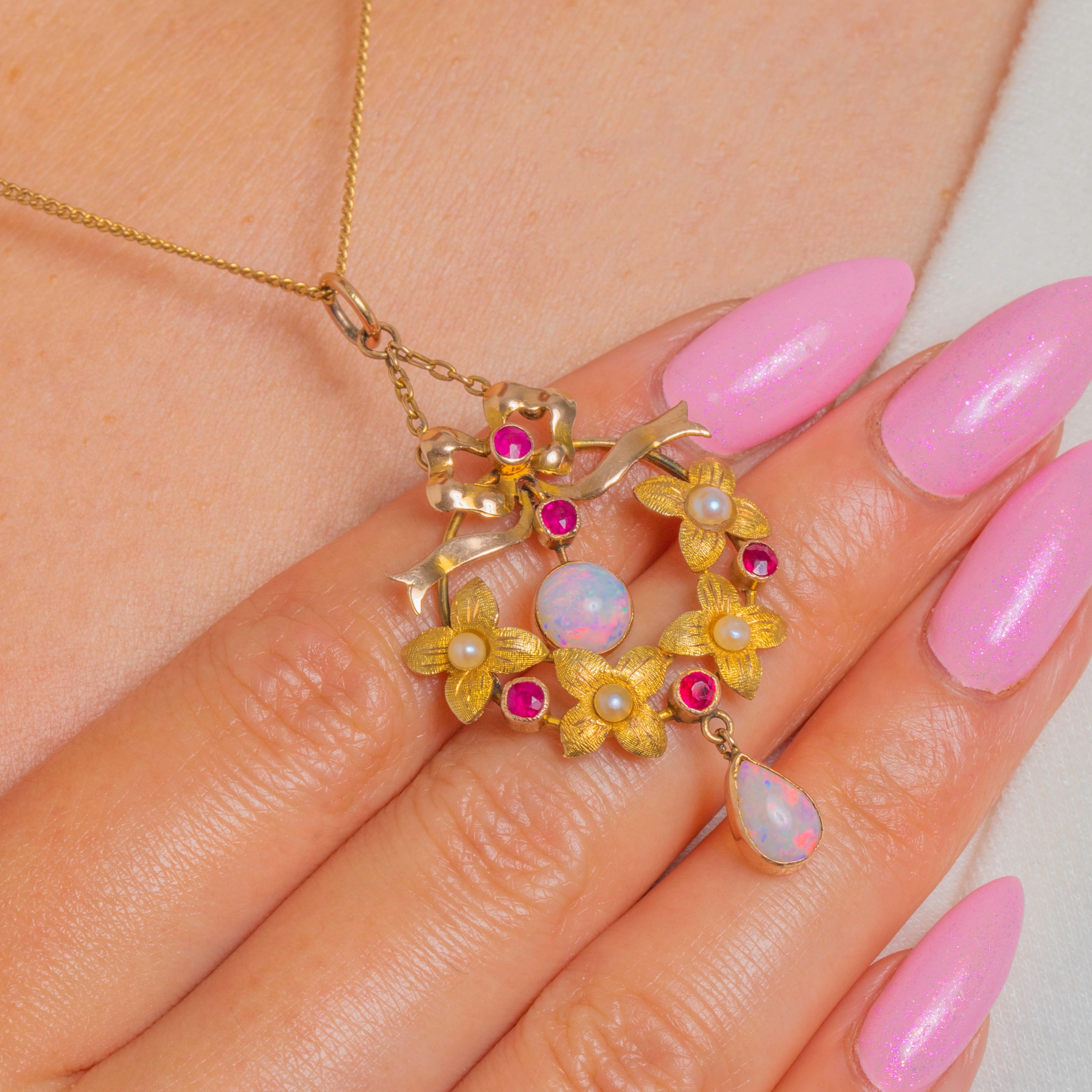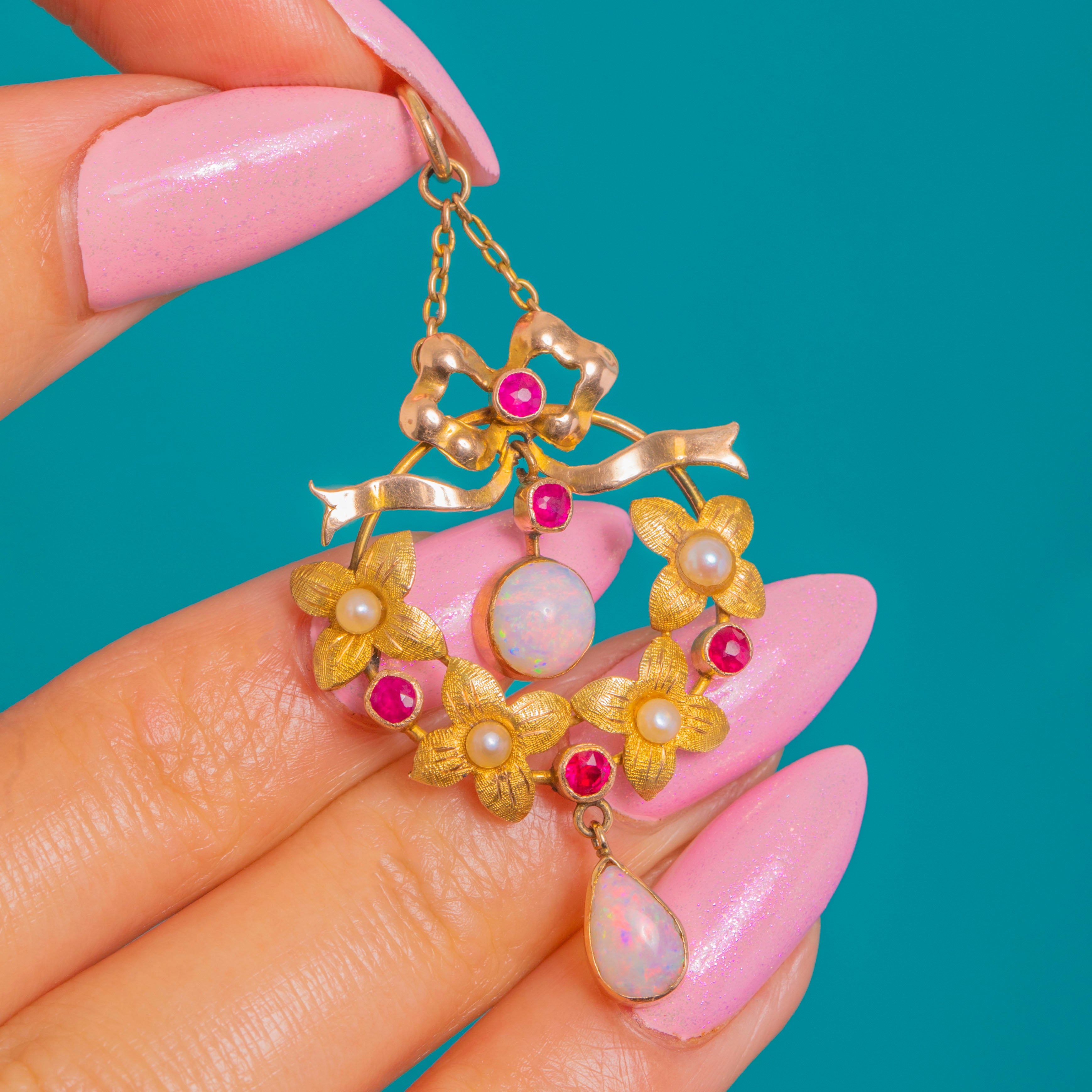 A quintessential Edwardian beauty in 15ct Gold, this romantic pendant marries a graceful ribbon top with a floral wreath, all centred on a luminous round Opal cabochon and finished with an elegant pear Opal drop. The warm Gold setting is softly textured to echo petals and leaves, while bright, pinkish-red Rubies and creamy Pearls lend delicate colour and contrast throughout.