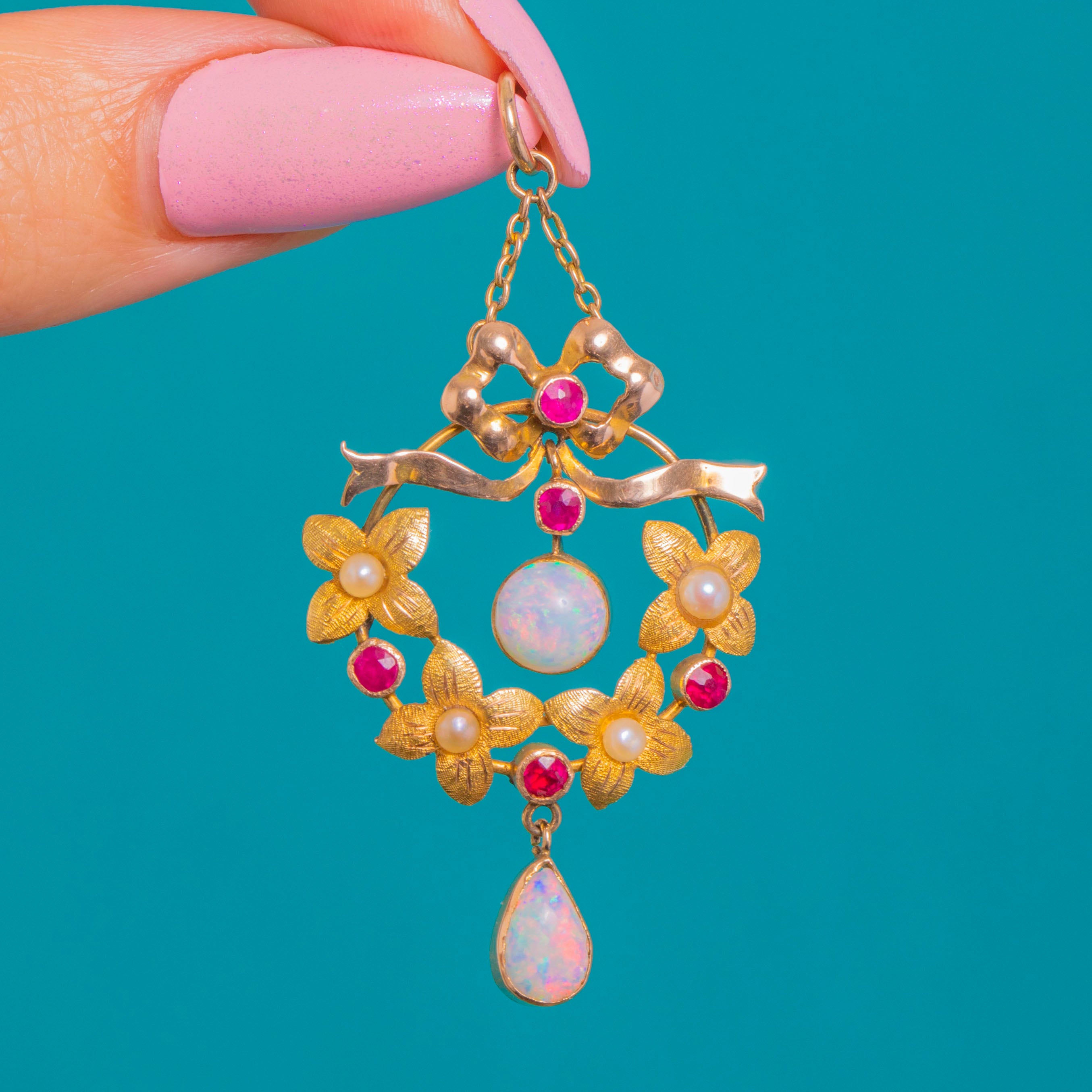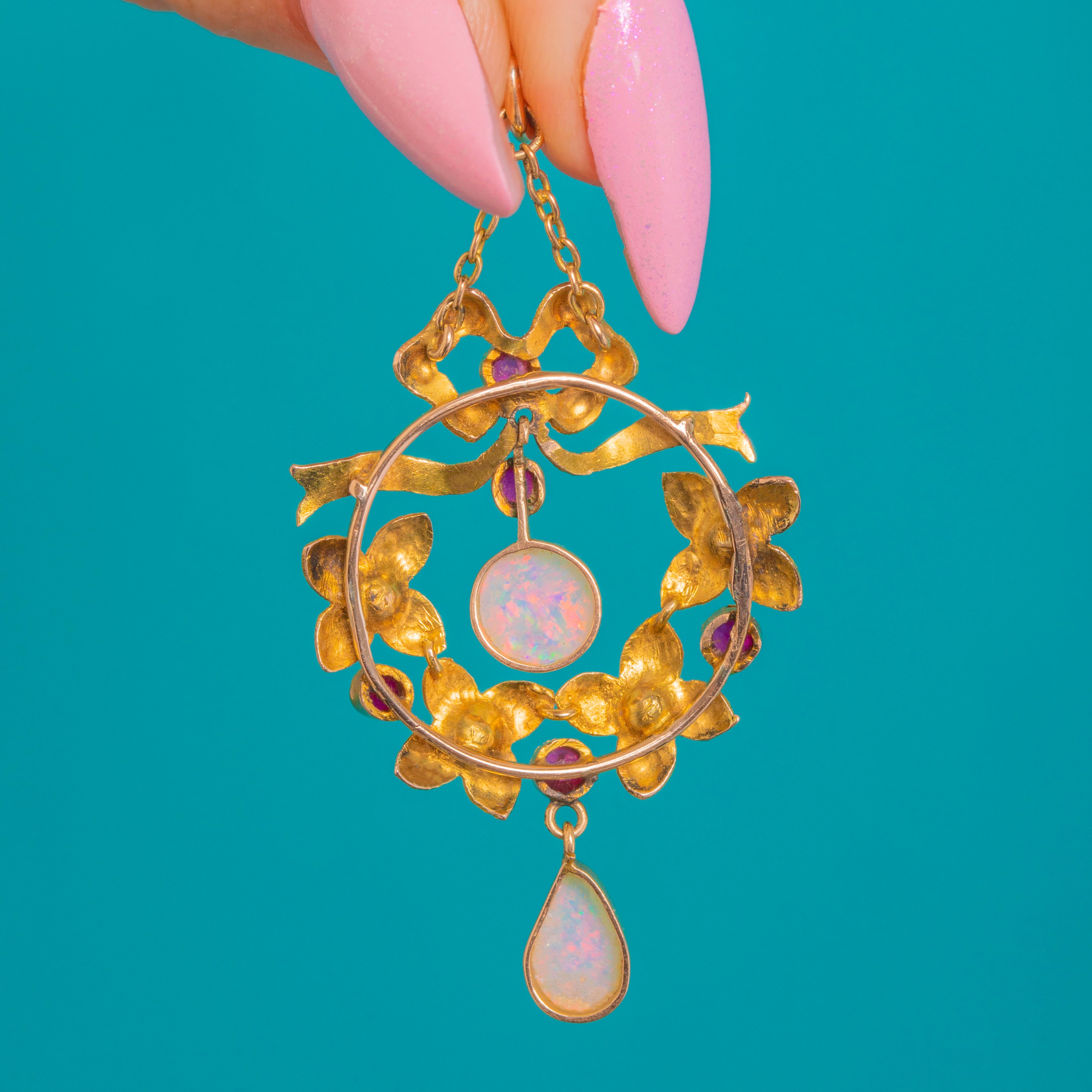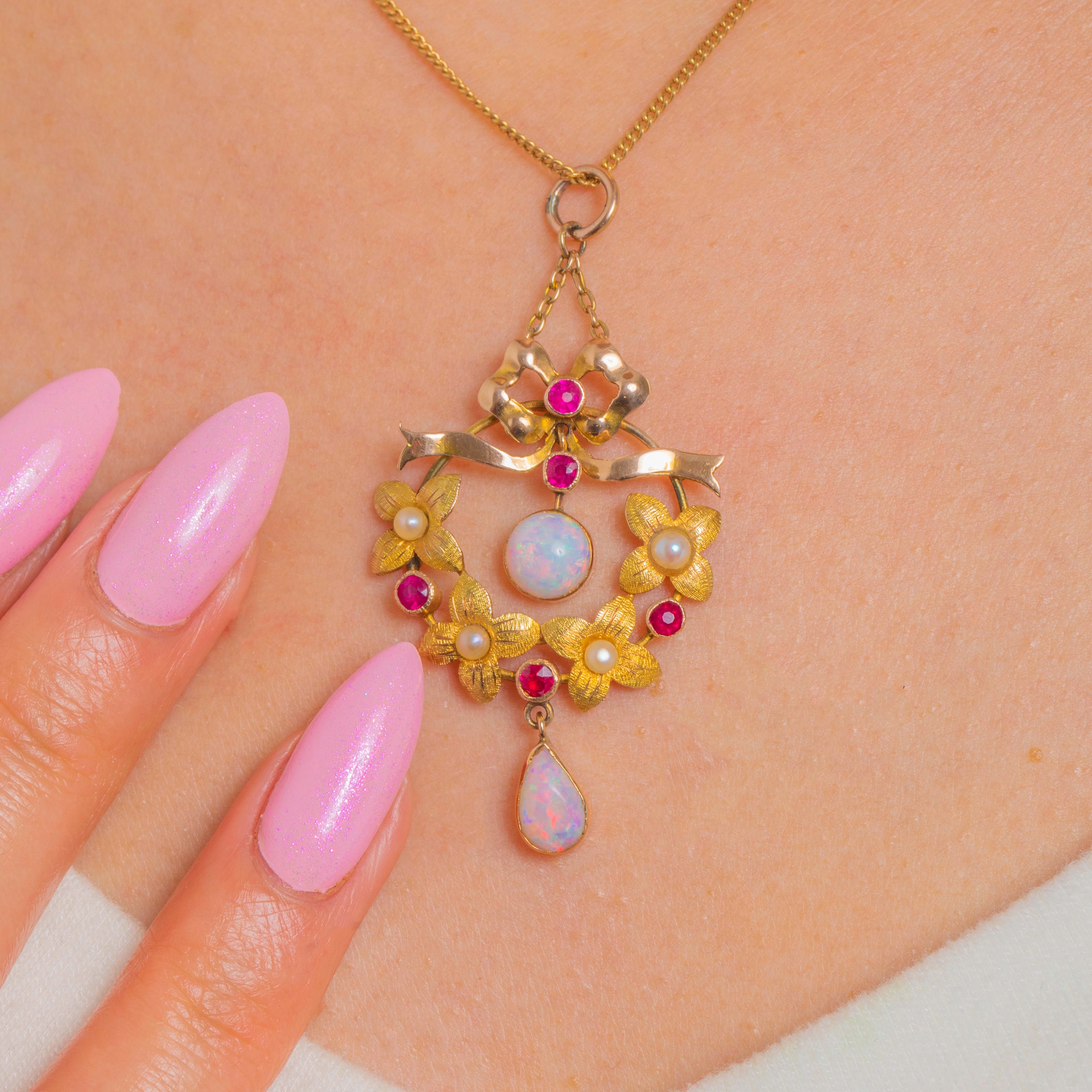A quintessential Edwardian beauty in 15ct Gold, this romantic pendant marries a graceful ribbon top with a floral wreath, all centred on a luminous round Opal cabochon and finished with an elegant pear Opal drop. The warm Gold setting is softly textured to echo petals and leaves, while bright, pinkish-red Rubies and creamy Pearls lend delicate colour and contrast throughout.