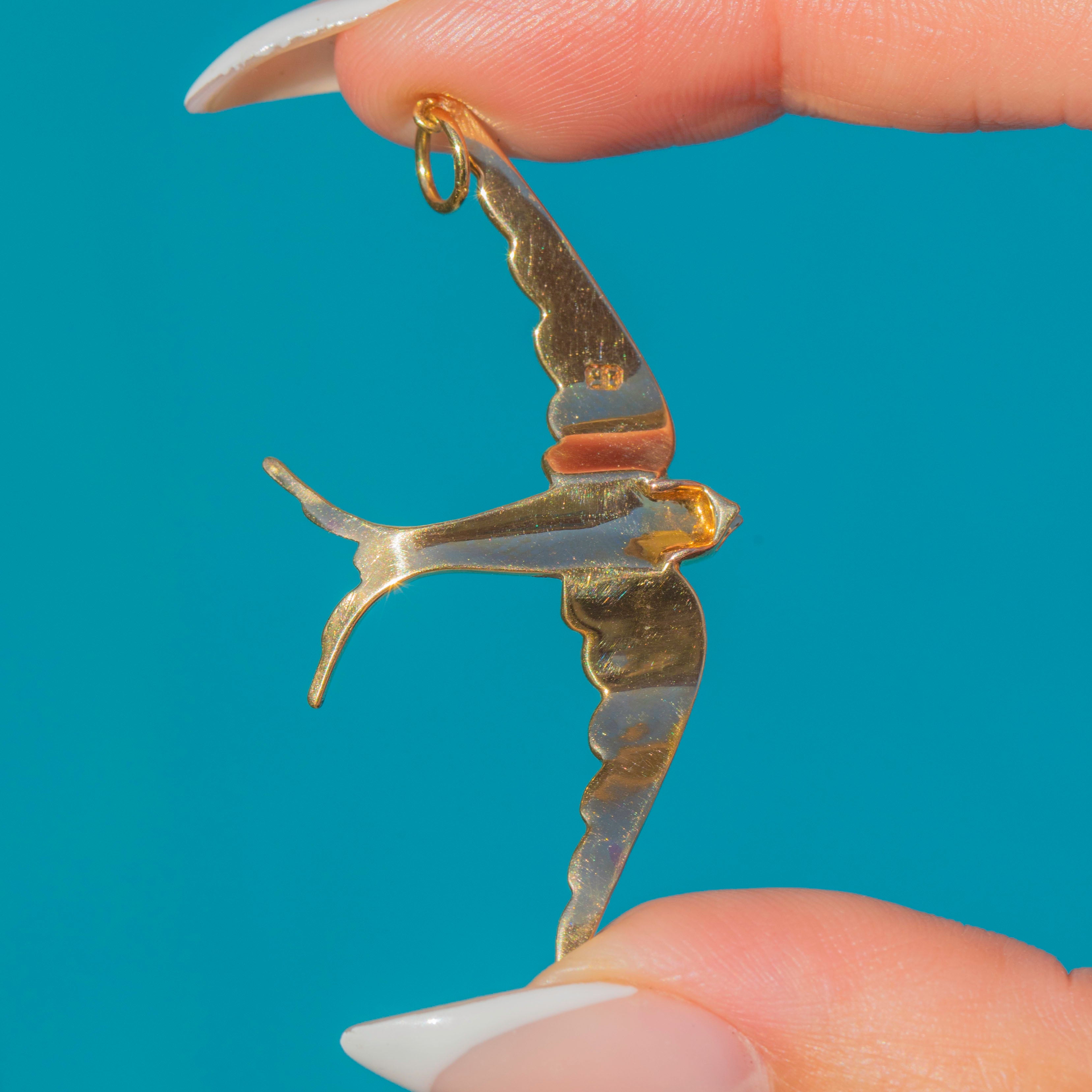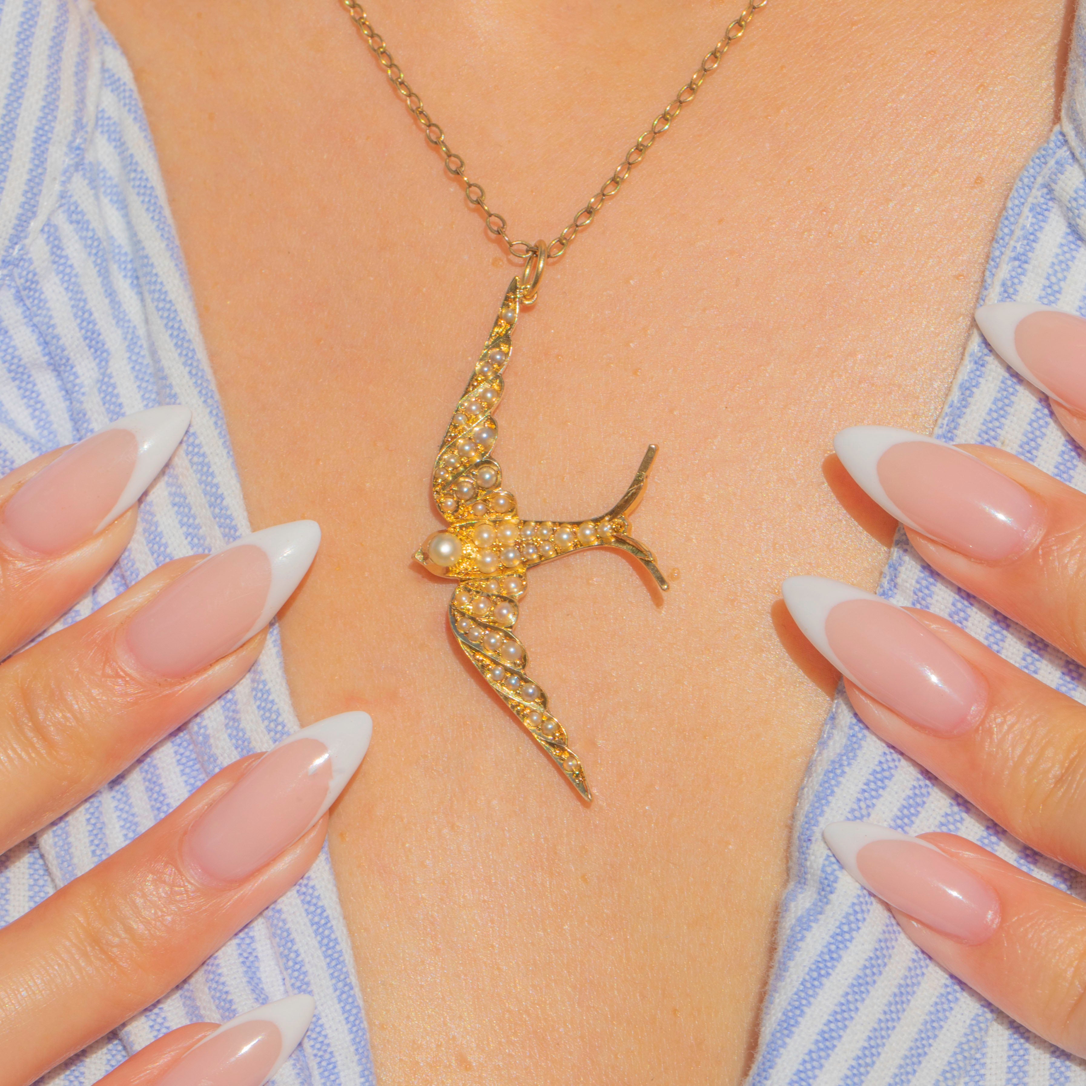 This magnificent Victorian Swallow pendant is crafted in rich 15ct Gold and set with luminous natural Pearls. The swallow, a beloved Victorian motif symbolising love, loyalty, and safe return, is beautifully rendered in a dynamic, sweeping pose that seems to capture the bird mid-flight.