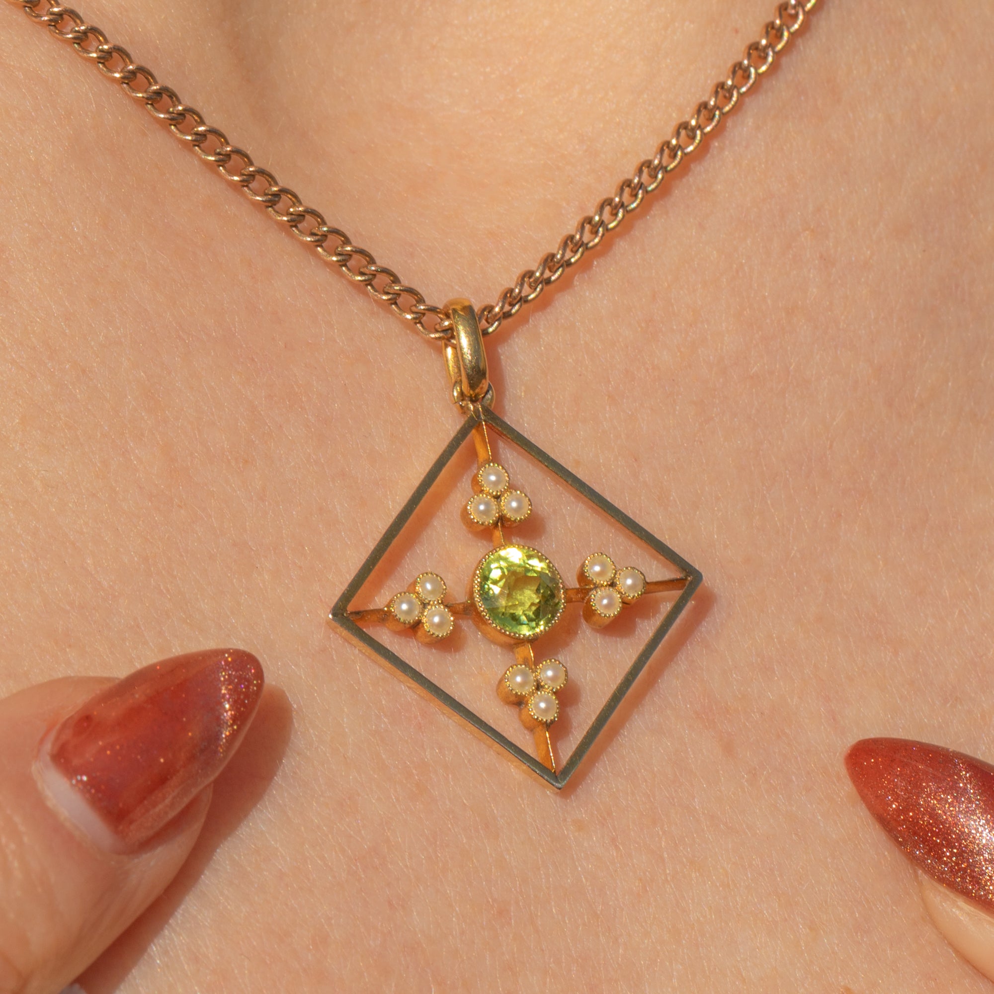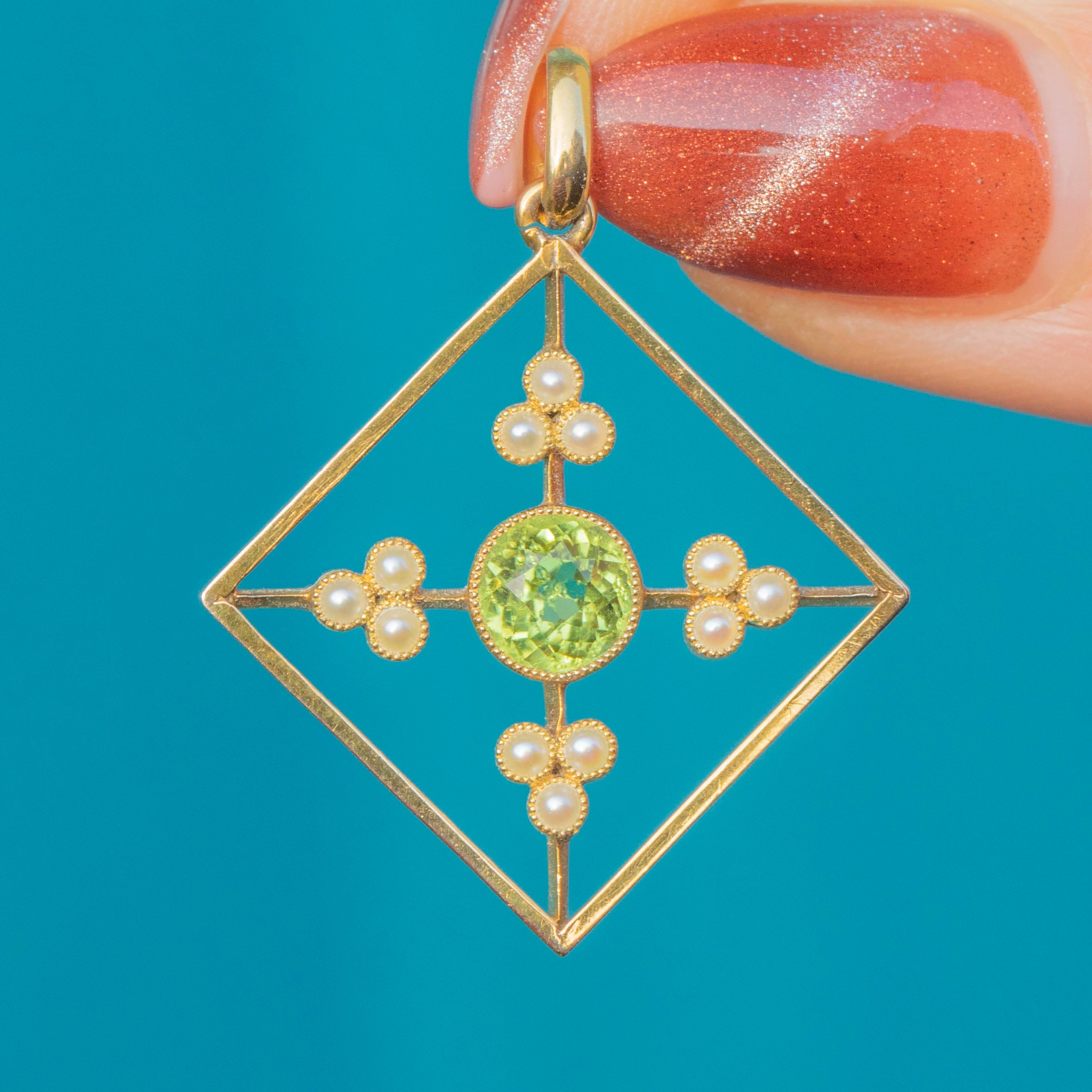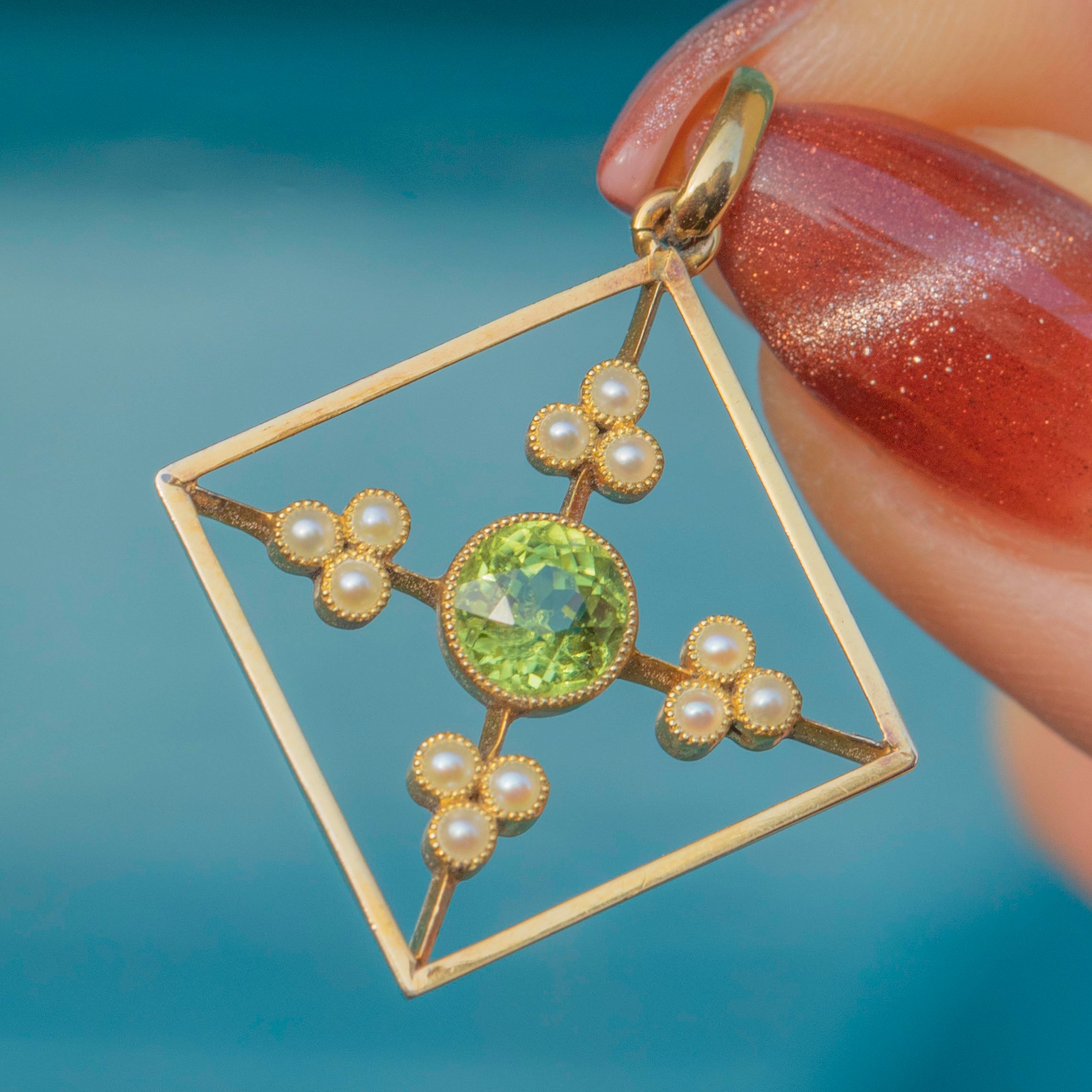 This antique 15ct Gold Peridot Pearl pendant will certainly grab your attention! Crafted entirely from saturated and rare 15ct Gold, this Edwardian pendant has been formed into a striking diamond-shape and is inlaid with resplendent gemstones.