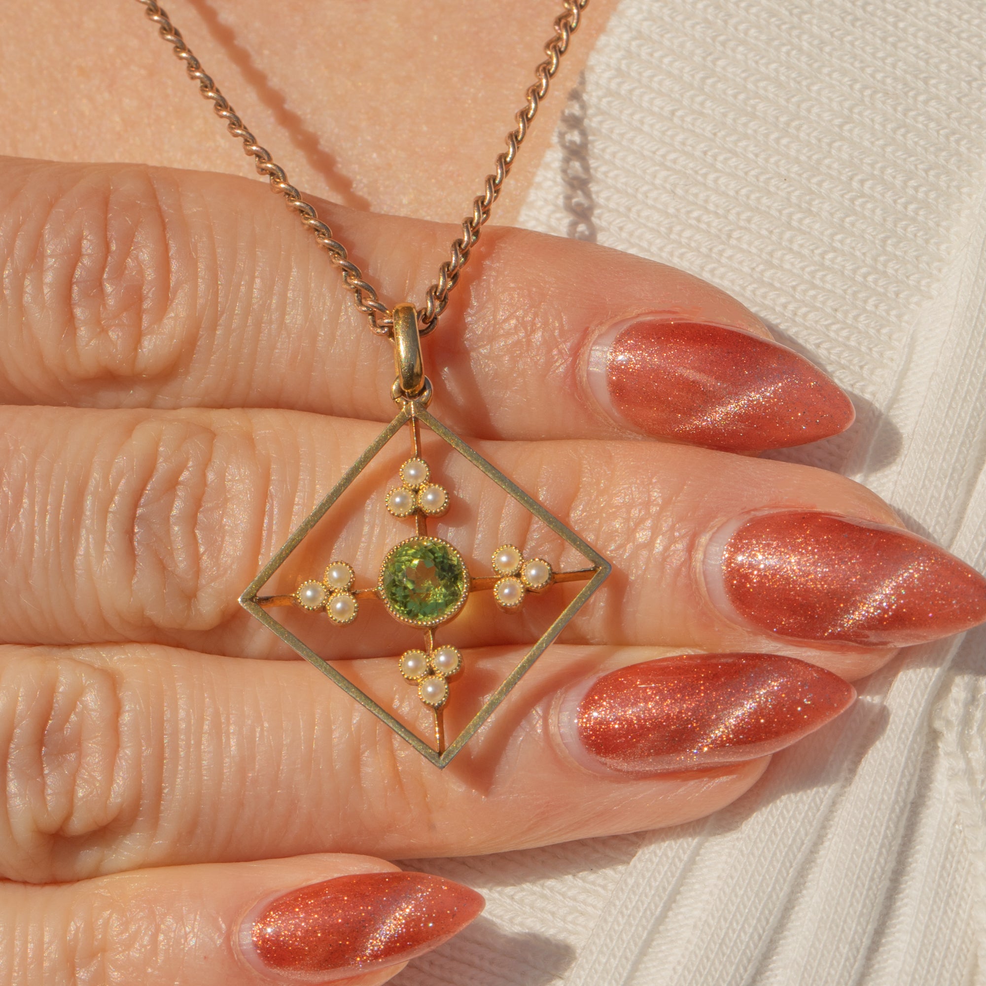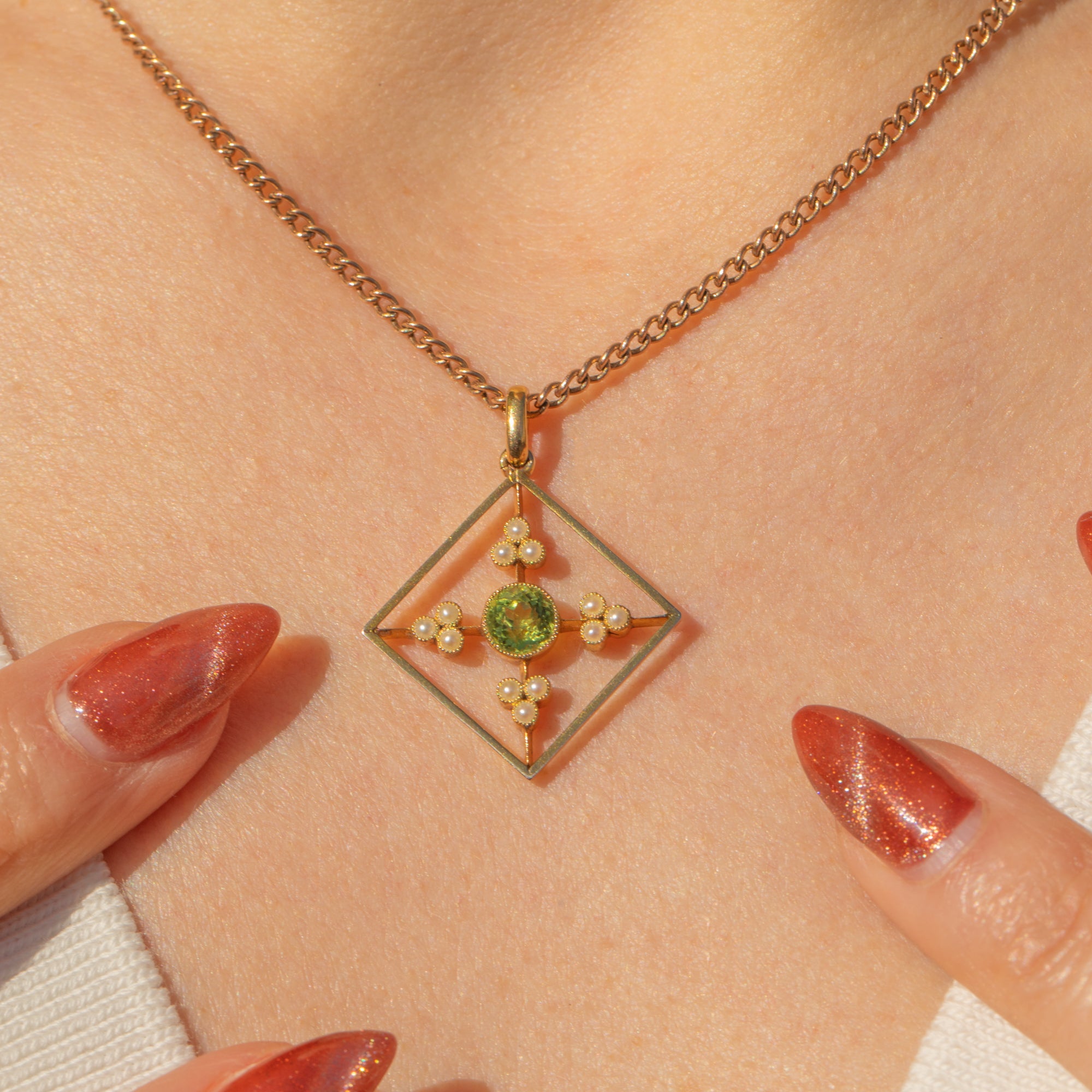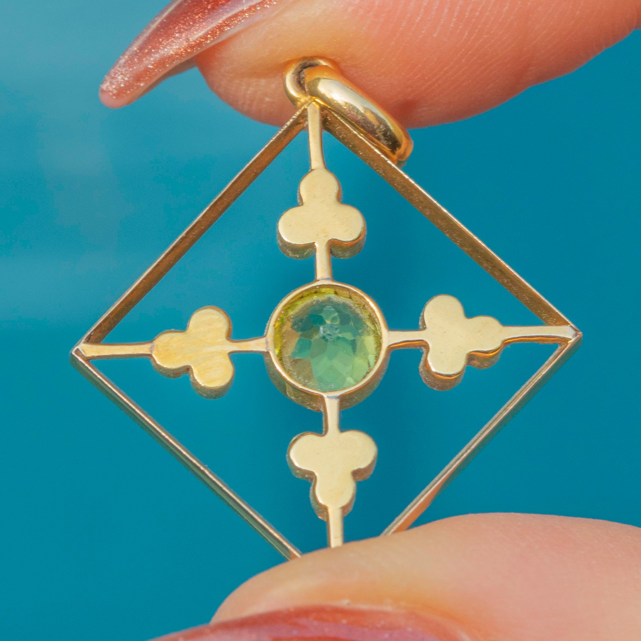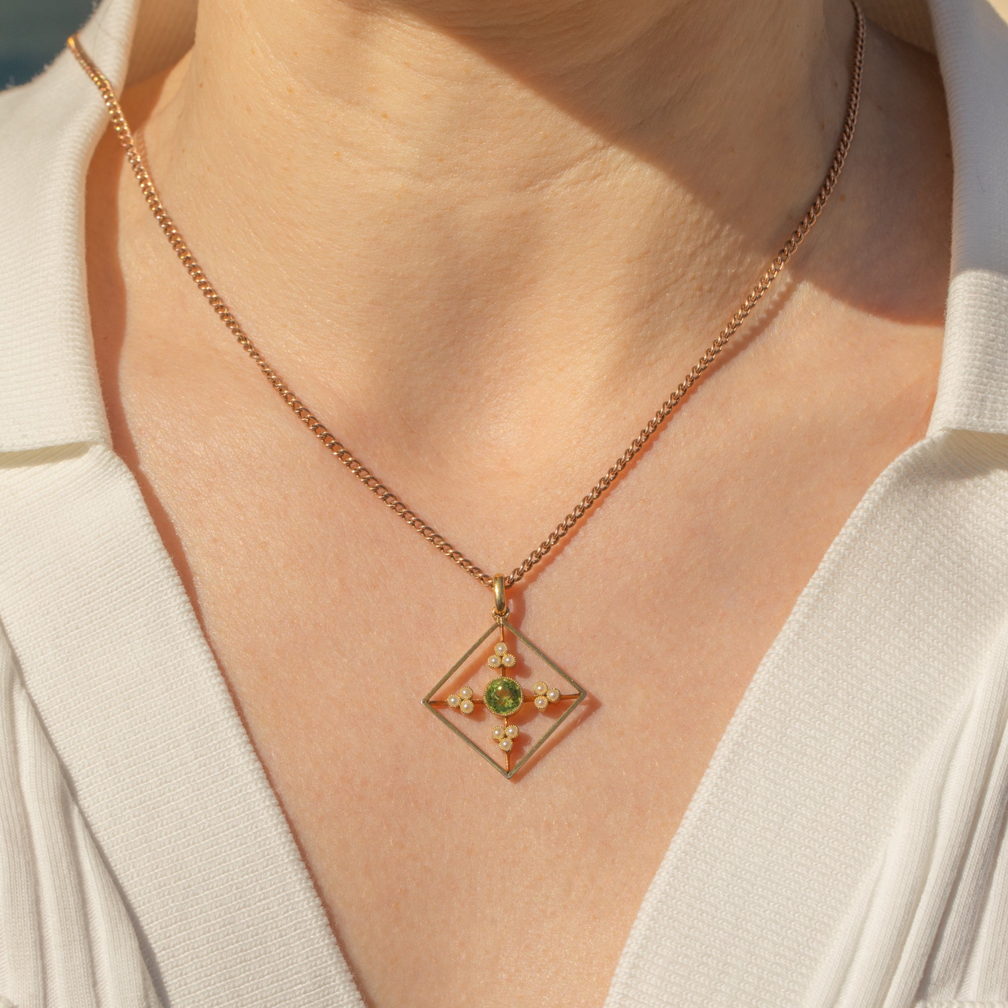 This antique 15ct Gold Peridot Pearl pendant will certainly grab your attention! Crafted entirely from saturated and rare 15ct Gold, this Edwardian pendant has been formed into a striking diamond-shape and is inlaid with resplendent gemstones.