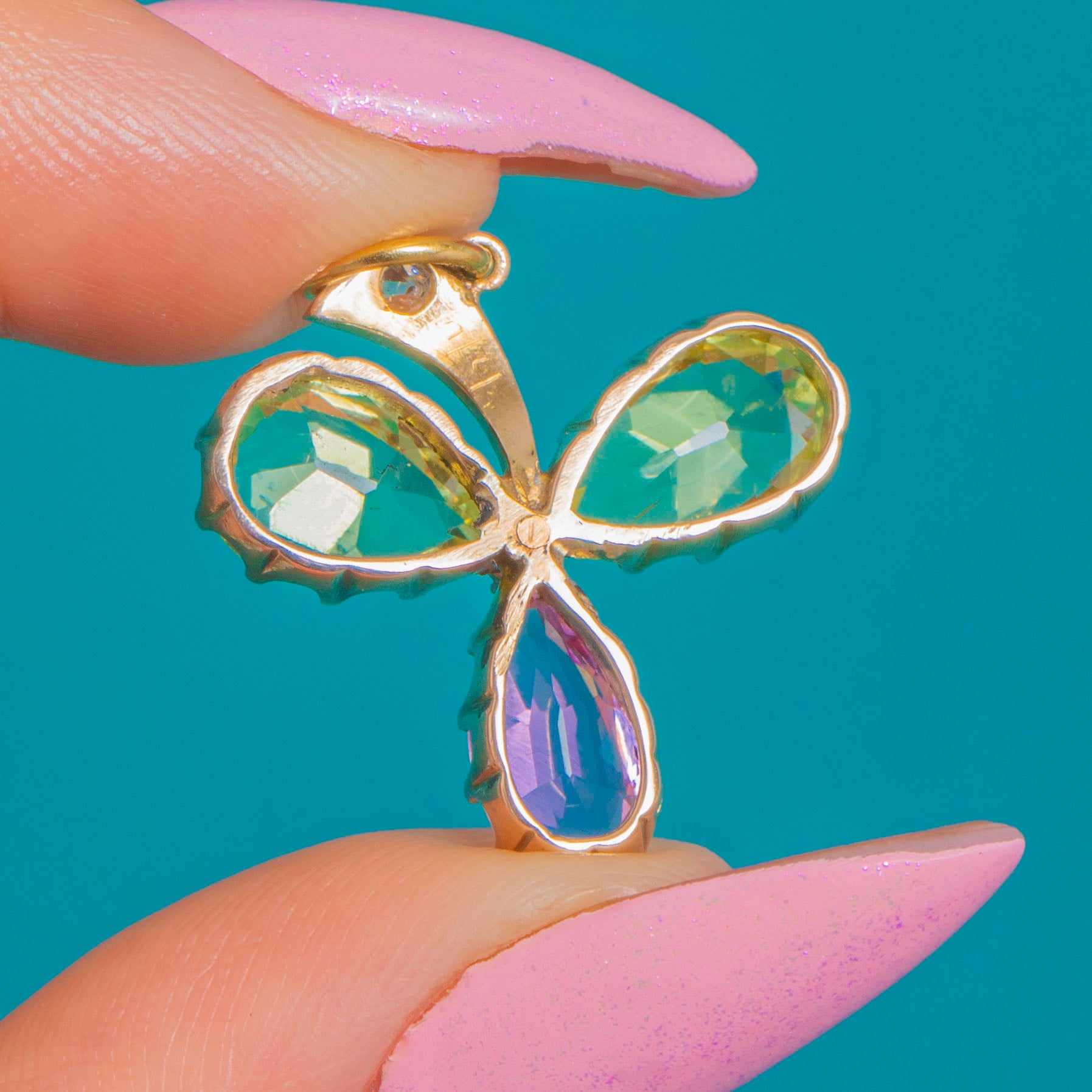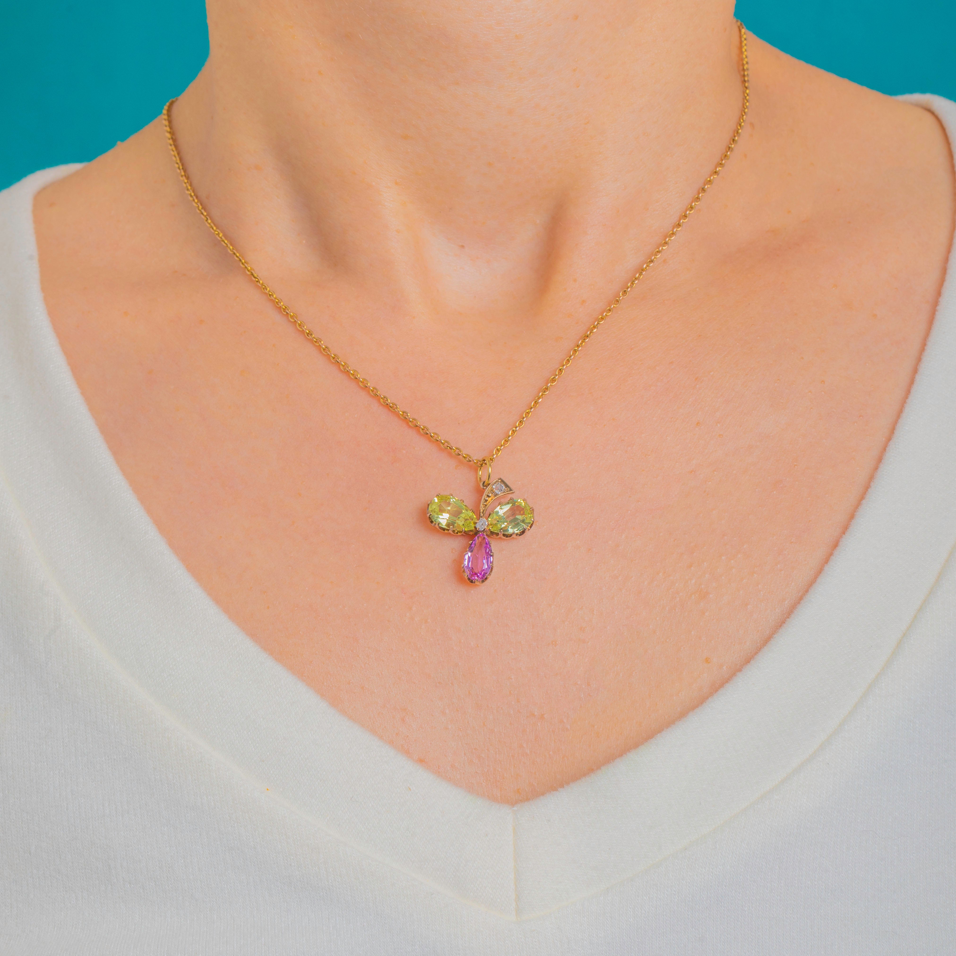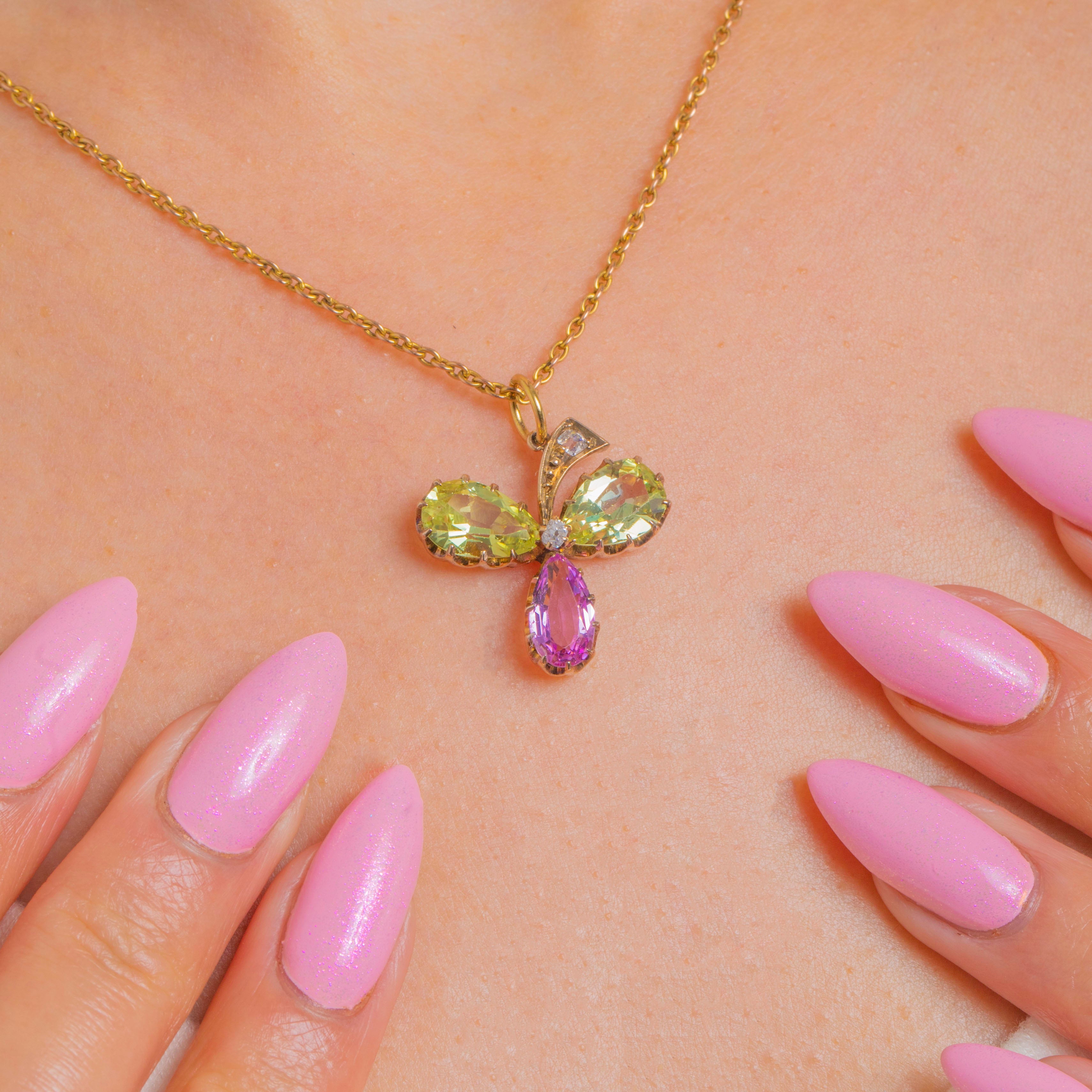 A luminous Victorian clover pendant set in rich 15ct Gold, alive with colour and charm. Two fresh green Chrysoberyls form the upper leaves, balanced by a delectable Pink Topaz below, with a tiny Diamond twinkling at the heart of the trefoil. The scalloped claw settings and buttery Gold lend a refined, romantic finish that feels quintessentially 19th century.