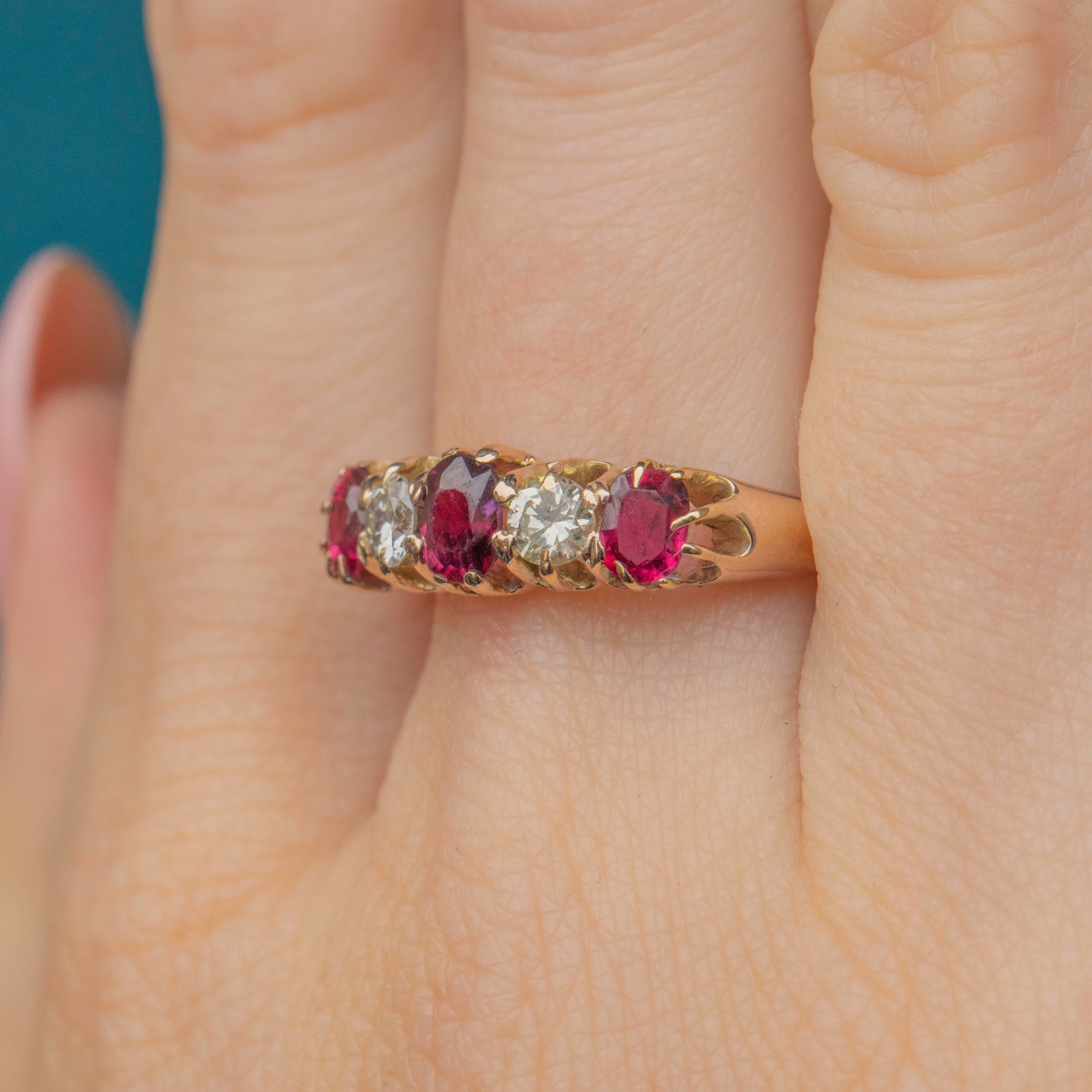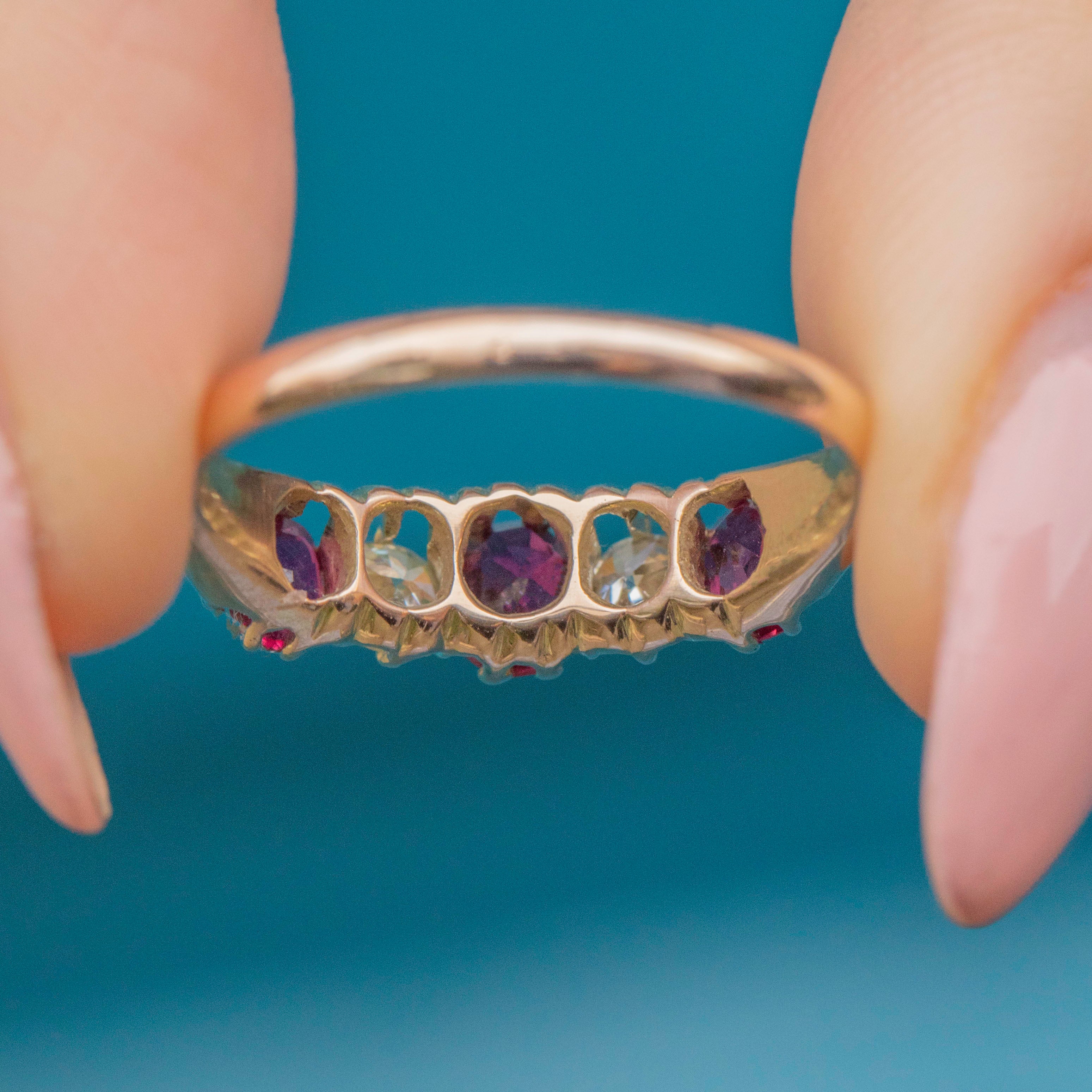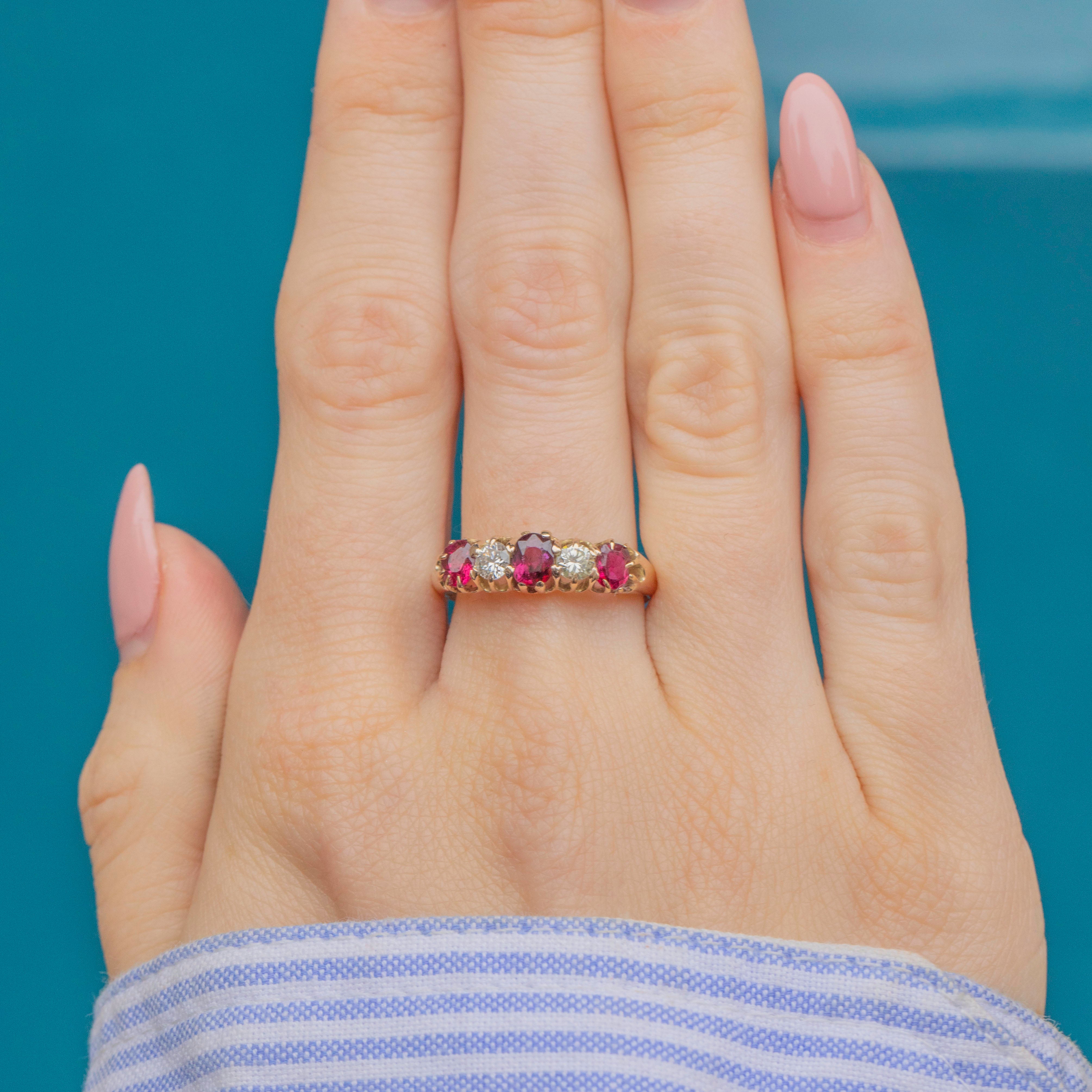 EXCELLENT. This antique 15ct Gold Ruby Diamond five stone ring is in fabulous condition throughout. The 15ct Gold band feels substantial and sturdy, and all of the gemstones are secure in their settings. The Diamonds and Rubies are exceptionally bright and twinkling - a visionary piece!