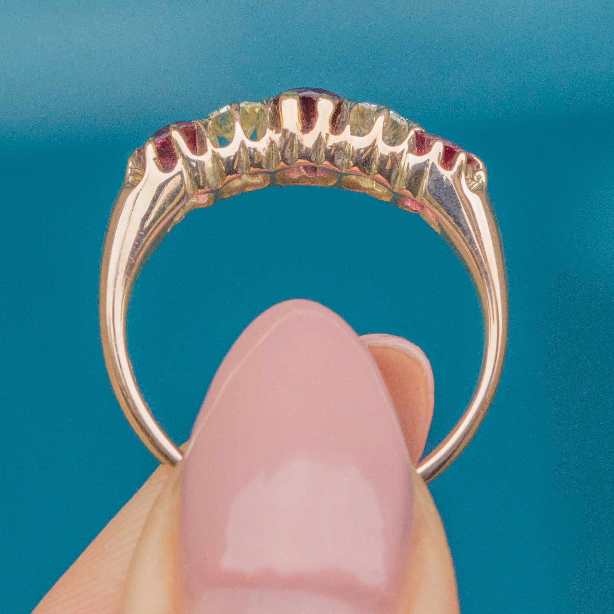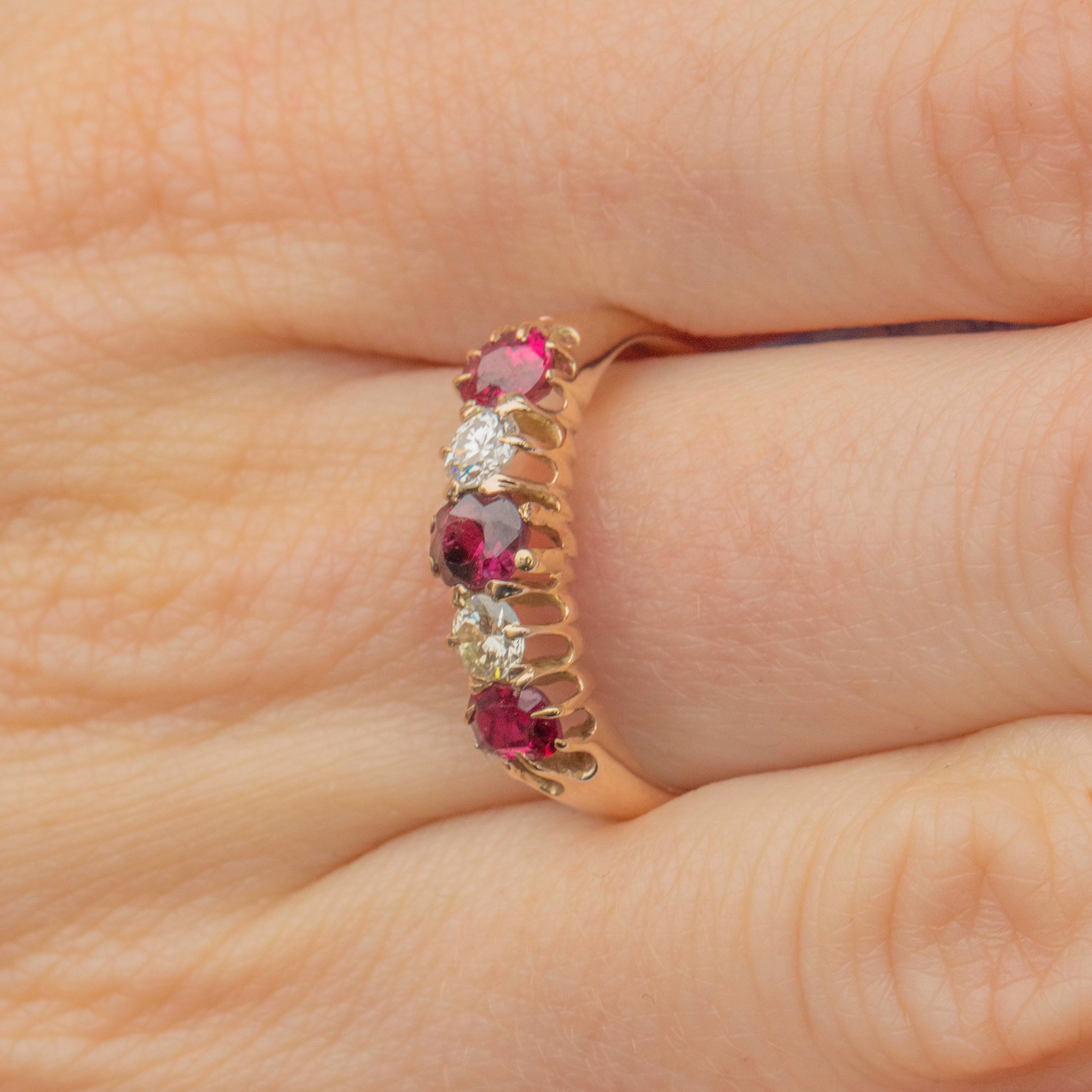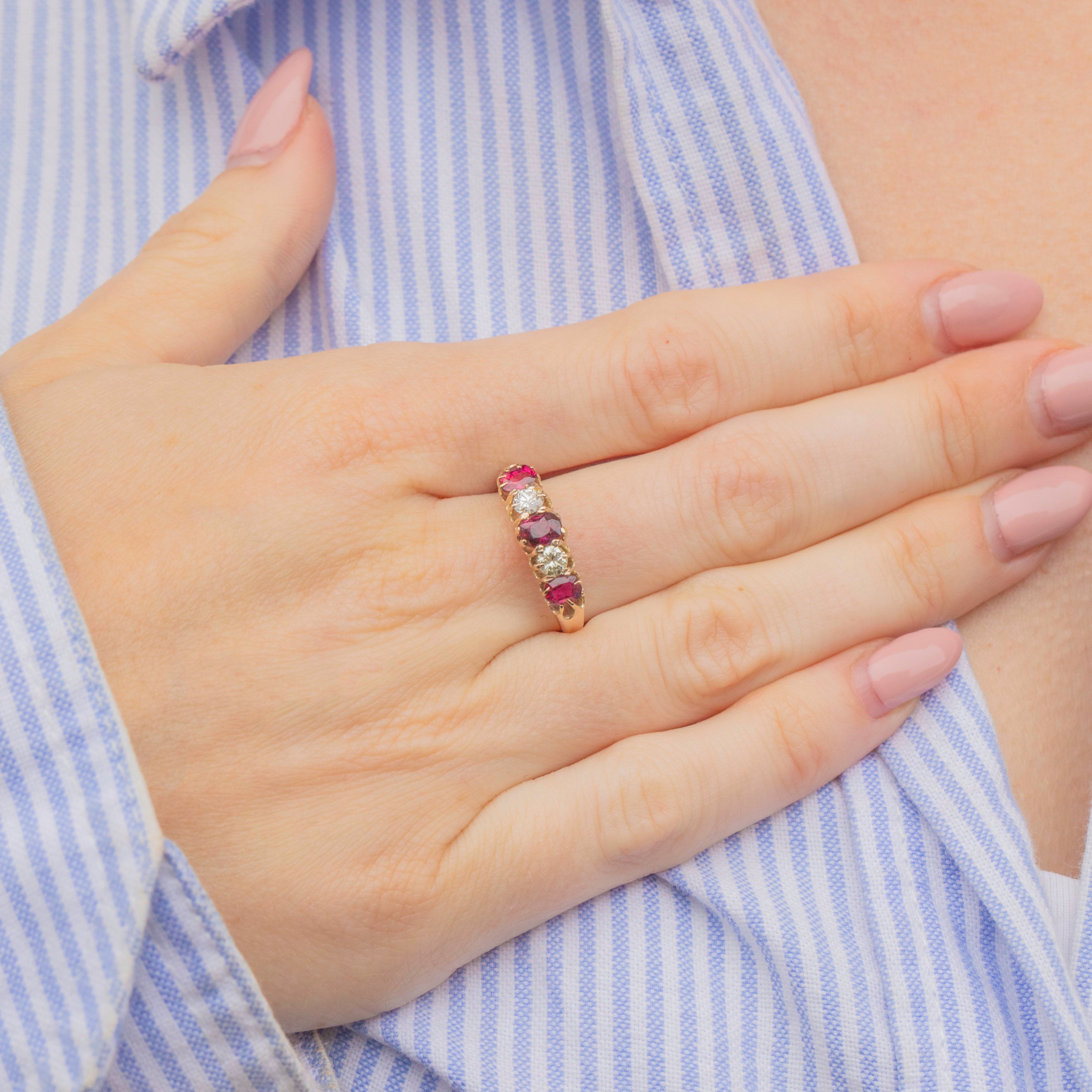 EXCELLENT. This antique 15ct Gold Ruby Diamond five stone ring is in fabulous condition throughout. The 15ct Gold band feels substantial and sturdy, and all of the gemstones are secure in their settings. The Diamonds and Rubies are exceptionally bright and twinkling - a visionary piece!