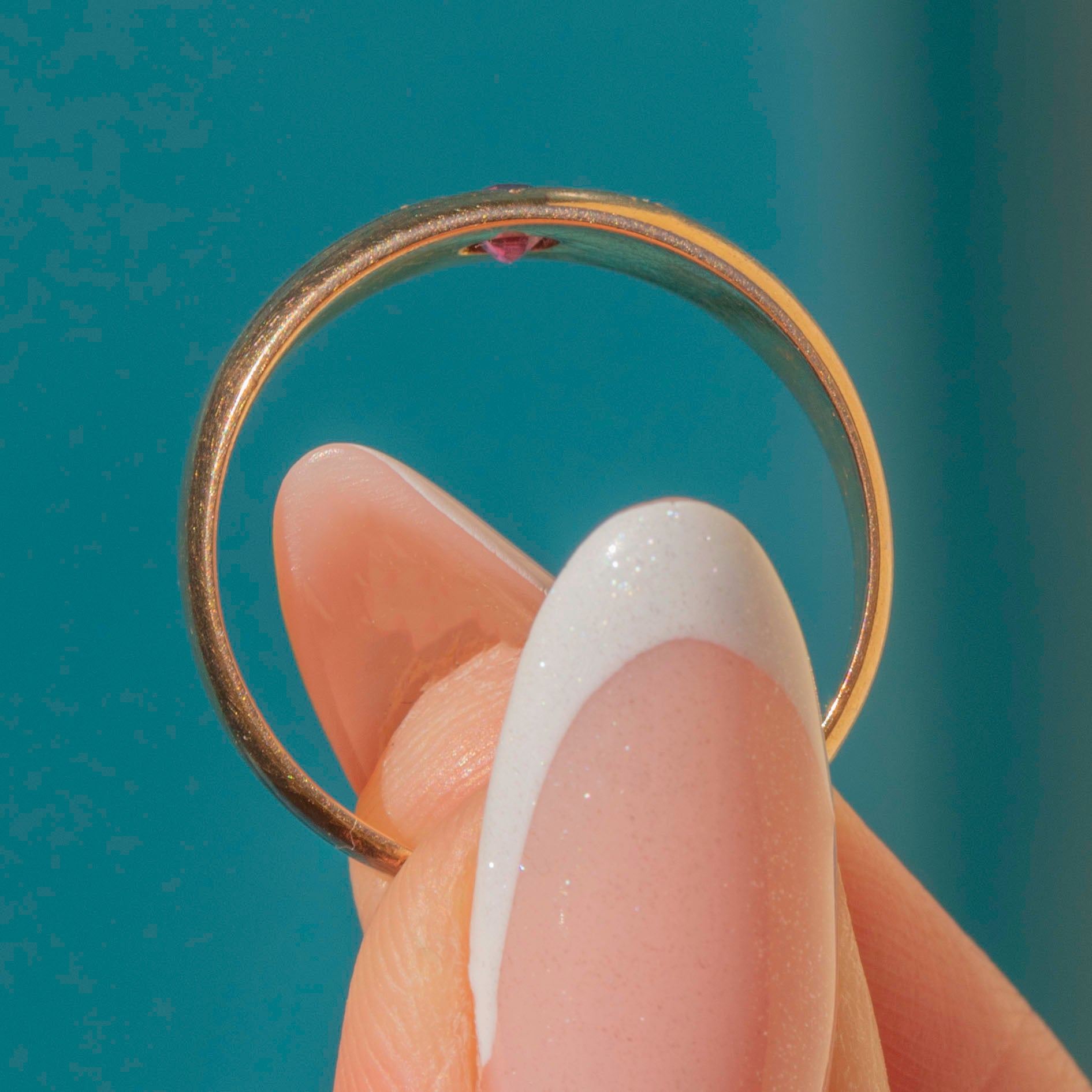 Elegant and refined, the chubby and glossy 15ct Gold band is adorned by a single fuchsia Ruby. Set within a star setting, this Victorian Ruby ring radiates celestial charm and has a lovely twinkle as she catches the light.