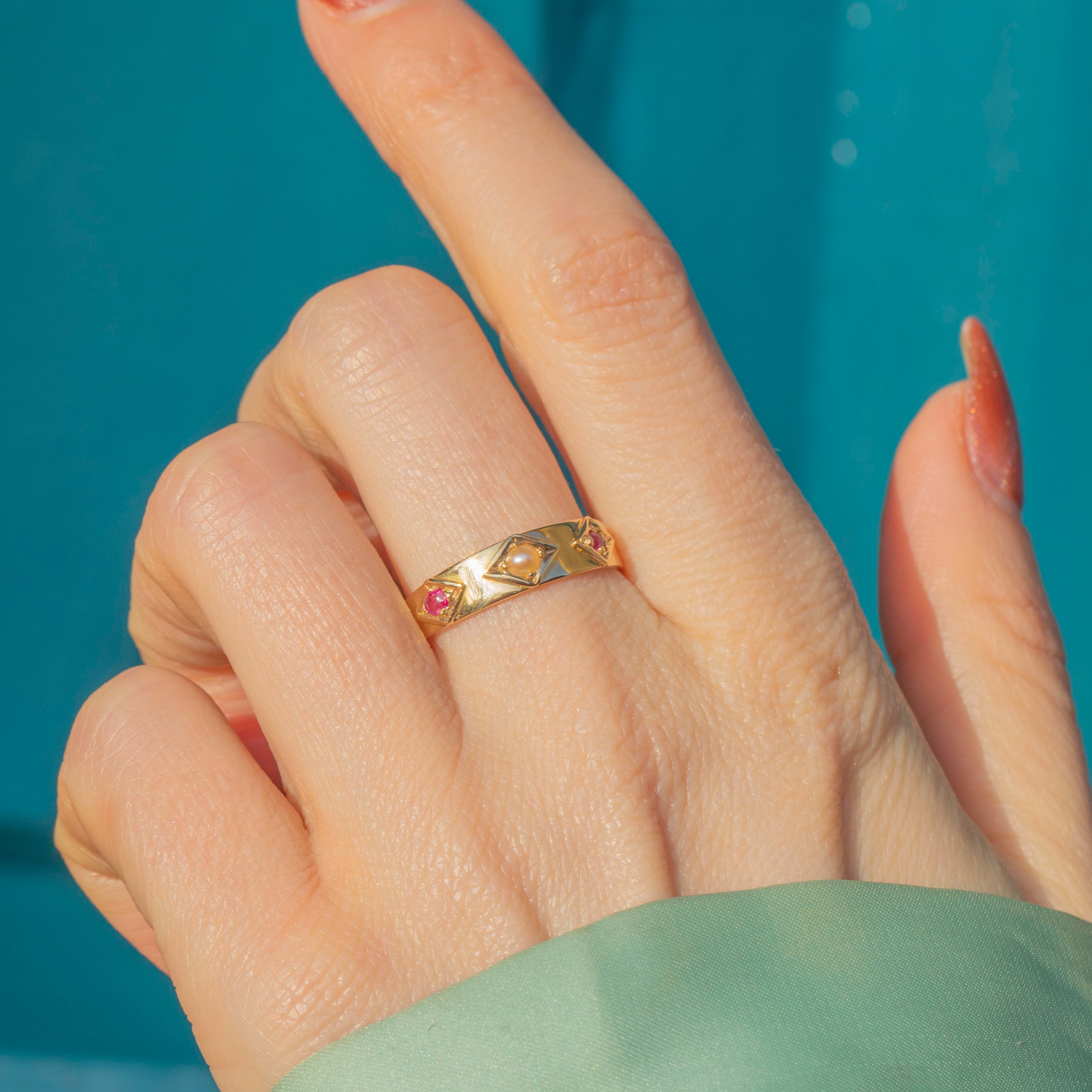 Add Victorian allure to your ring stack with this delightful antique 15ct Gold Ruby Pearl gypsy ring! Her saturated 15ct Gold band displays a gorgeous trio of gemstones, with an iridescent Pearl in the centre, flanked by two juicy pink-red Rubies.