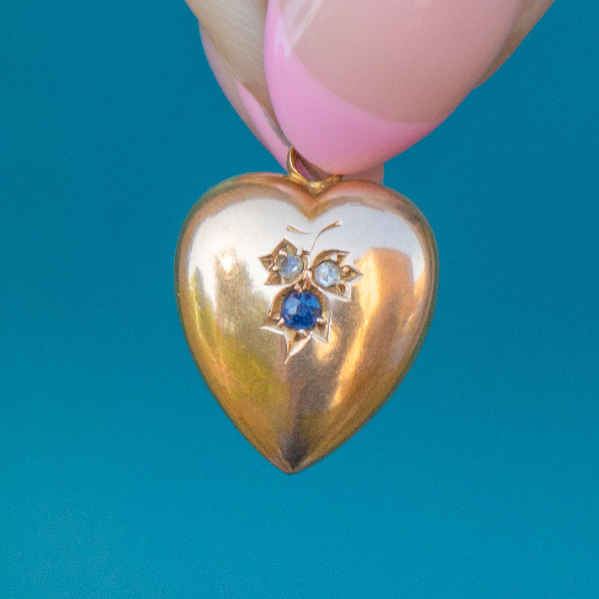 EXCELLENT. This antique 15ct Gold Sapphire Diamond puffy heart pendant is in excellent condition! The gemstones are all securely set and the heart has maintained its shape beautifully. The hallmarks are clear and fully legible making her a coveted addition to your collection!