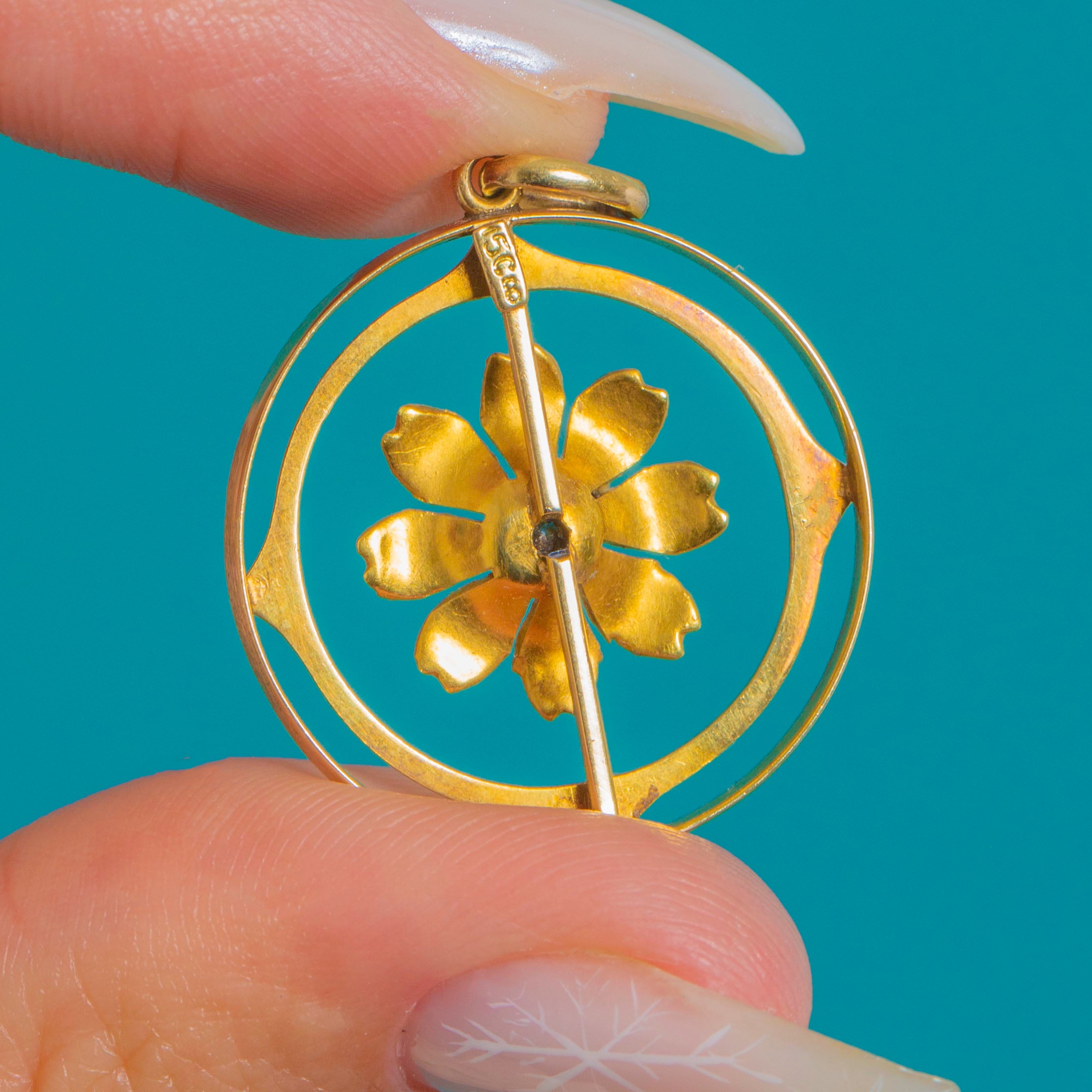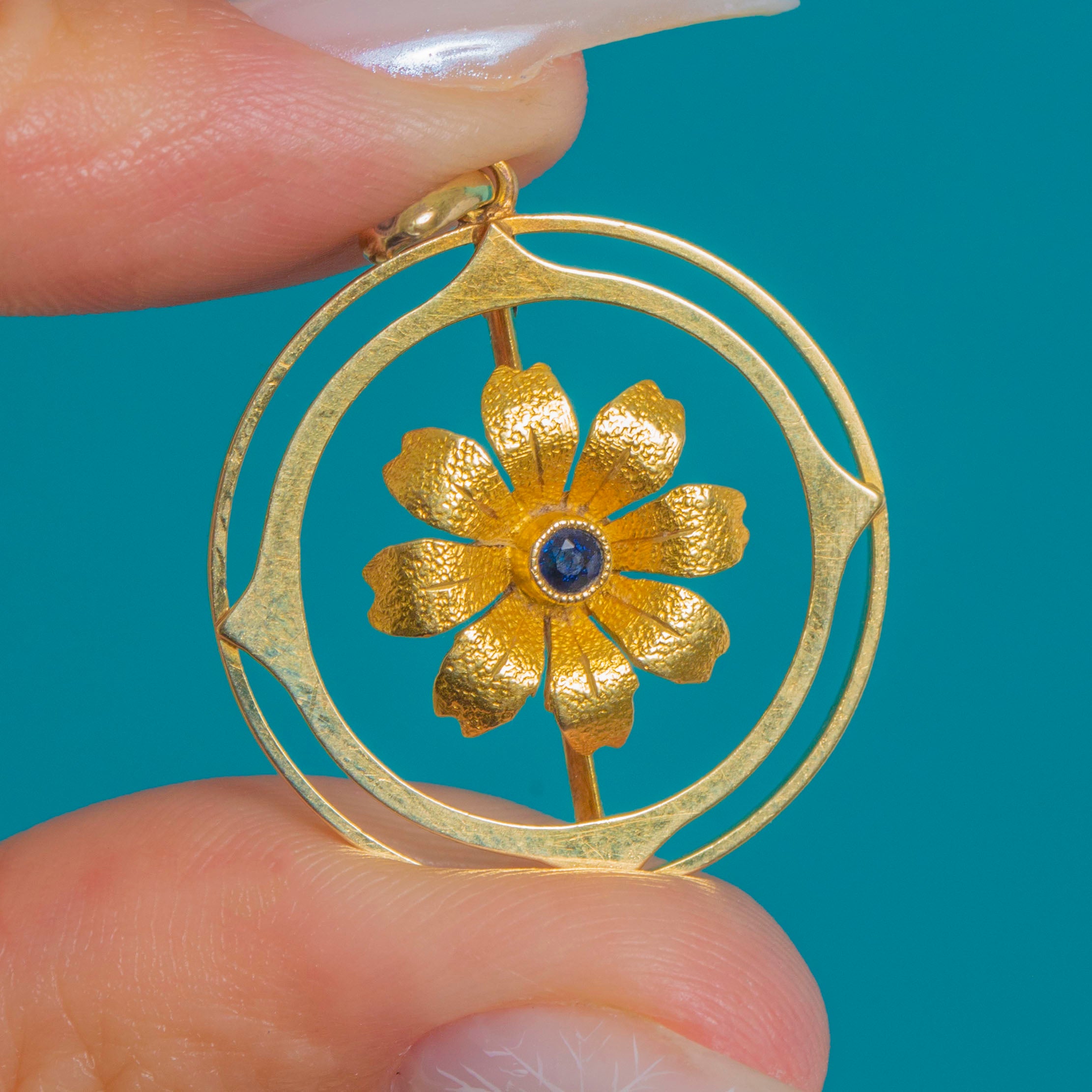 A charming Edwardian flower pendant in rich 15ct Gold, this openwork roundel balances soft botanicals with crisp geometry. At its heart glows a deep blue Sapphire, set at the centre of a sculpted bloom with a slender stem and leaf, framed by concentric circles punctuated at the compass points for a refined, architectural feel.