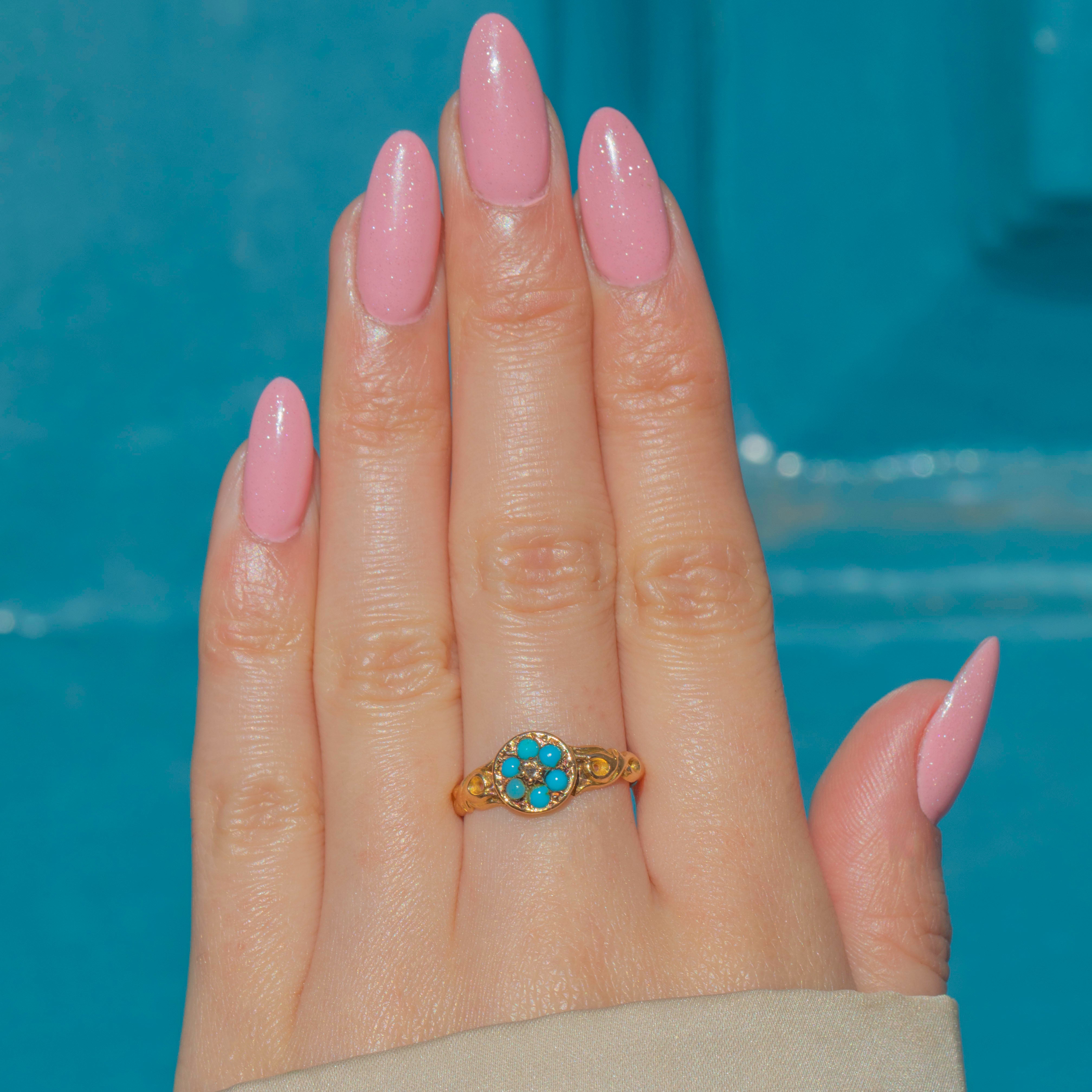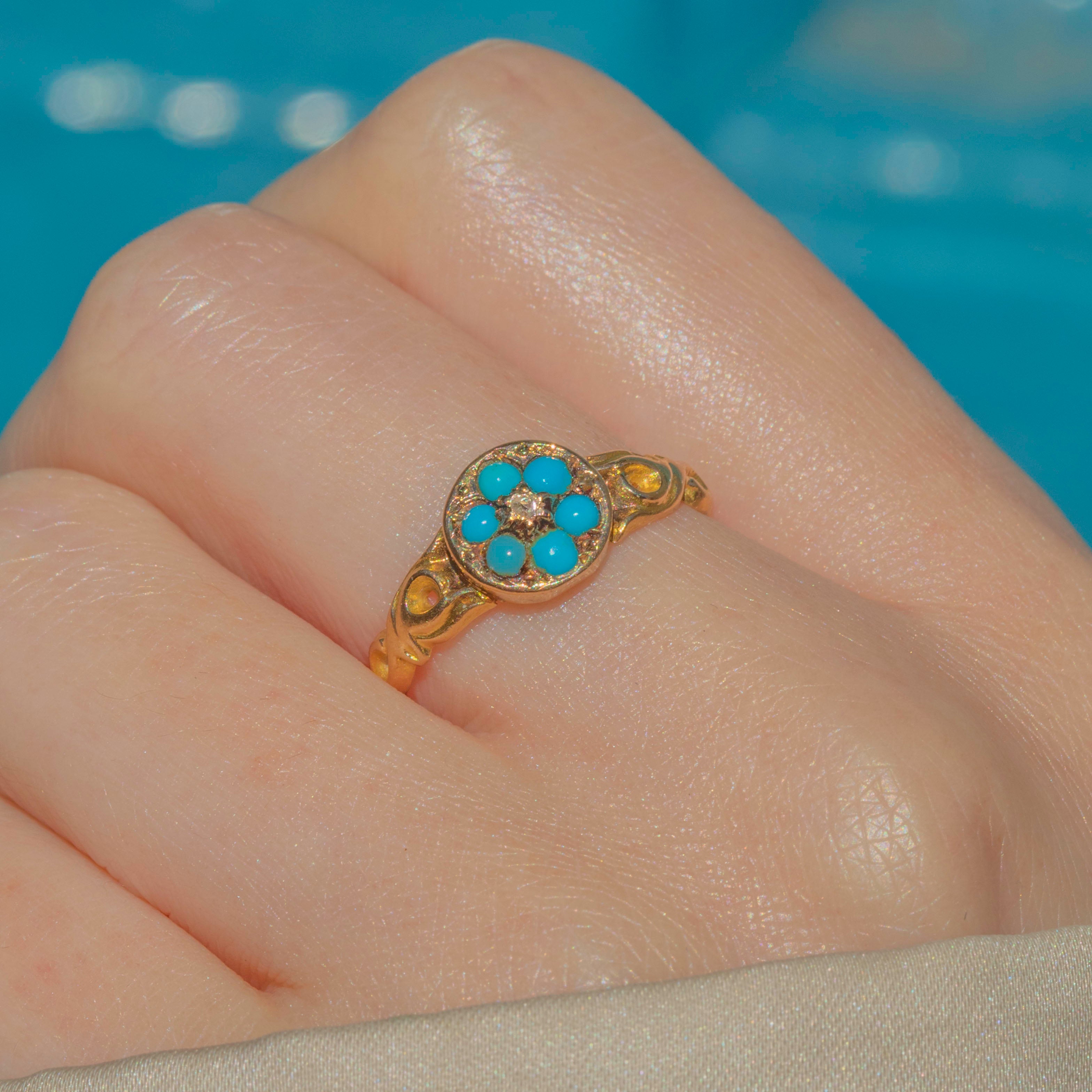 This antique 15ct Gold Turquoise Diamond flower ring is a dainty delight! Composed of six vibrant green-blue Turquoise stones framing a sparkling Rose-cut Diamond, she is a sight to behold.