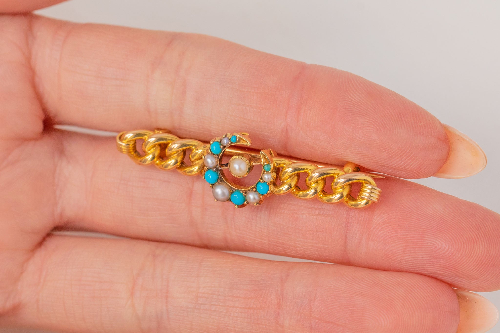 EXCELLENT. We offer you this antique 15ct Gold Turquoise Pearl crescent moon bar brooch in excellent condition! Each curb link is bright, buttery and securely soldered together, forming a solid frame for the bar brooch. The Pearls and Turquoise are securely nestled within their settings with no damage to note. The brooch fixture is in perfect working condition, allowing the brooch to sit safely against your clothing. She is truly a showstopper!