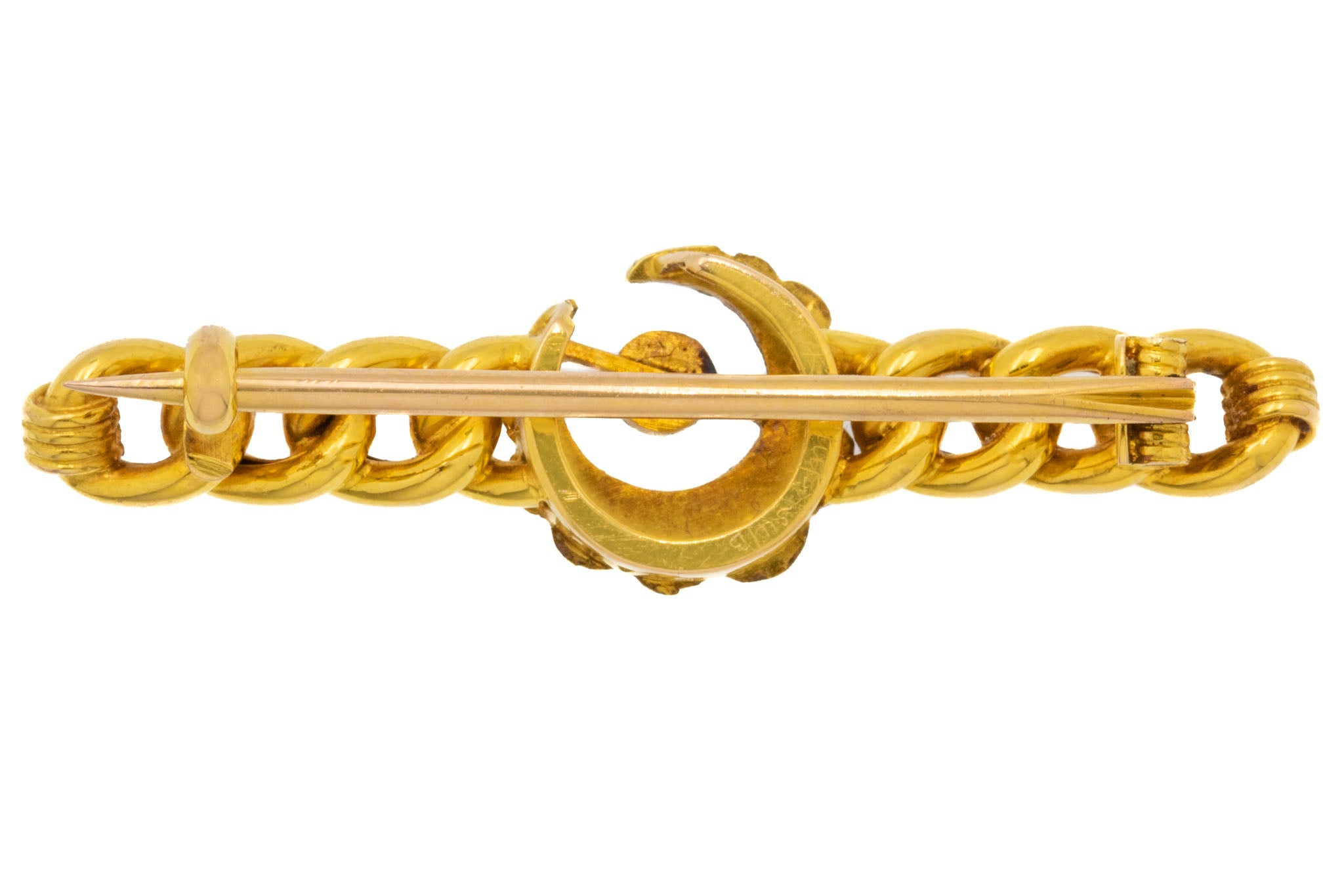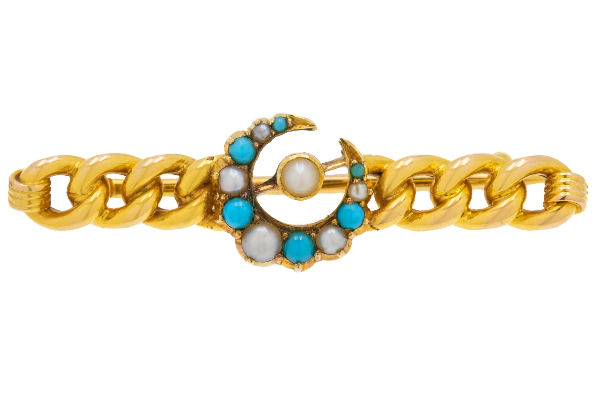 Every inch of this antique 15ct Gold Turquoise Pearl crescent moon bar brooch encapsulates the essence of Victorian jewellery. Nestled between her curvaceous, chunky curb links is a crescent moon, adorned with shimmering Pearls and sea blue Turquoise.