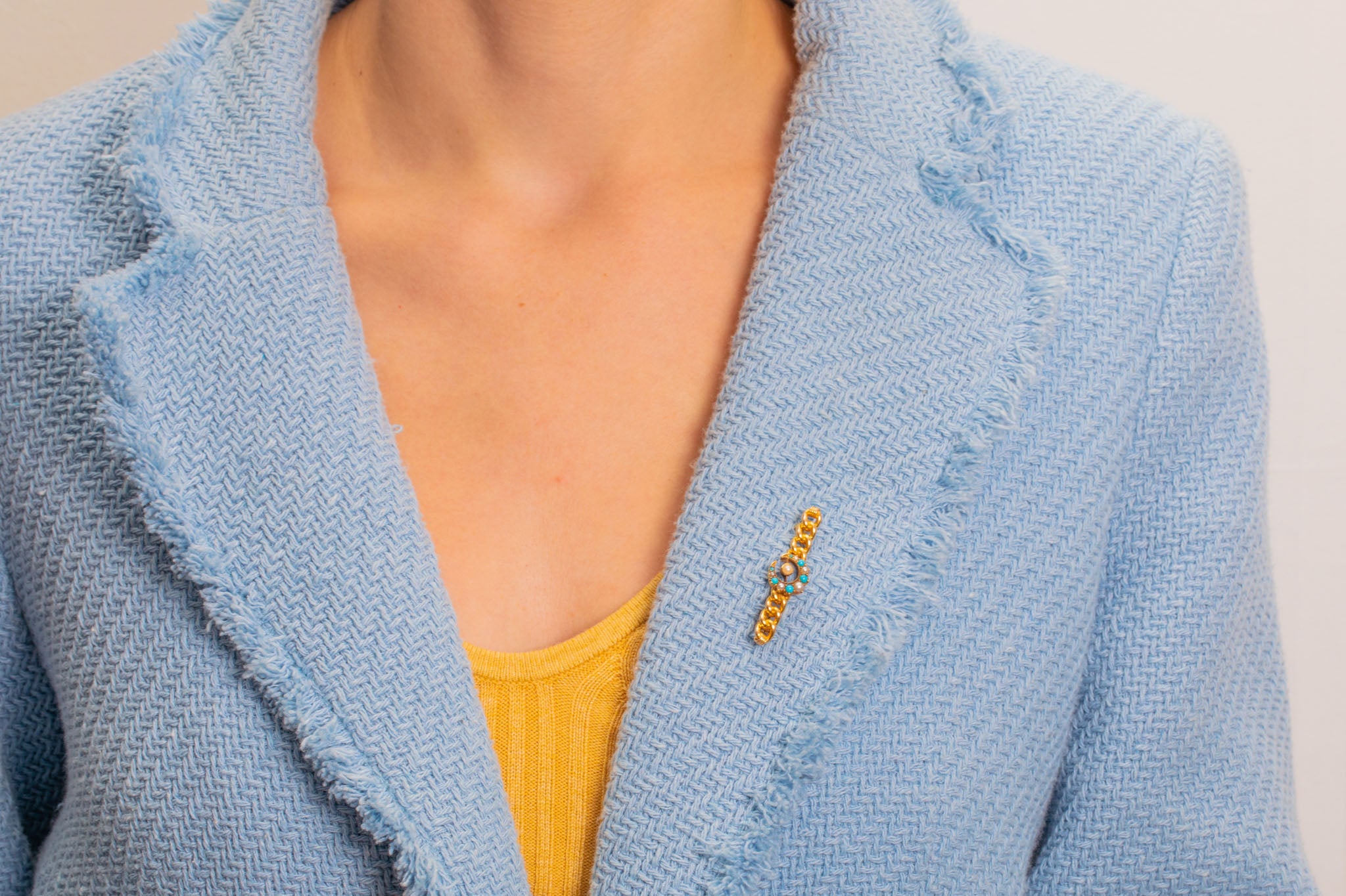 Oozing splendour from her every crevice, the body of this Victorian Gold brooch is crafted from sumptuous 15ct Gold and can be affixed to your jacket lapel with her 9ct Gold pin; there is no denying she will brighten up any outfit you marry her with. If you are a collector of all things Victorian, this antique Turquoise Pearl Gold brooch is certainly the one for you!
