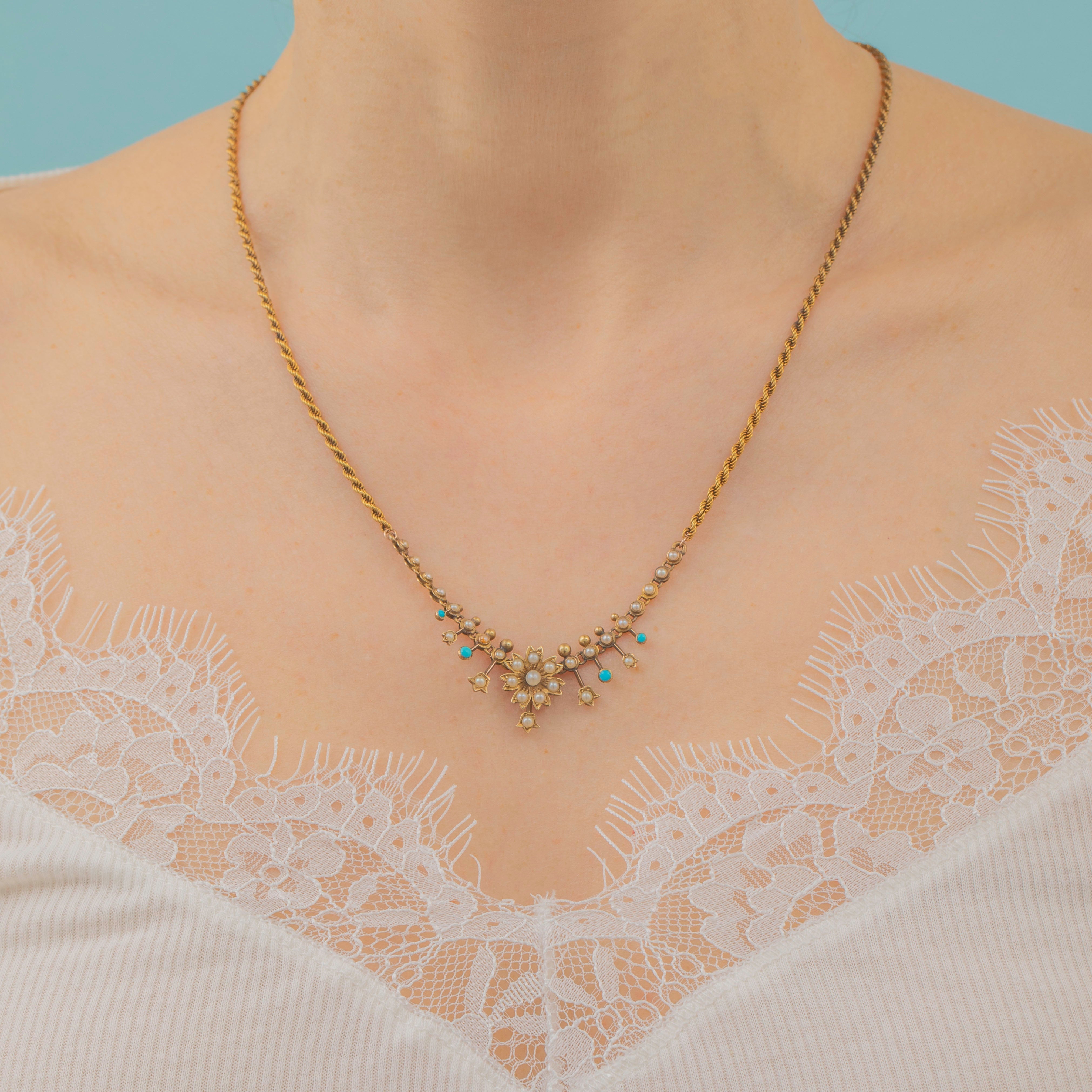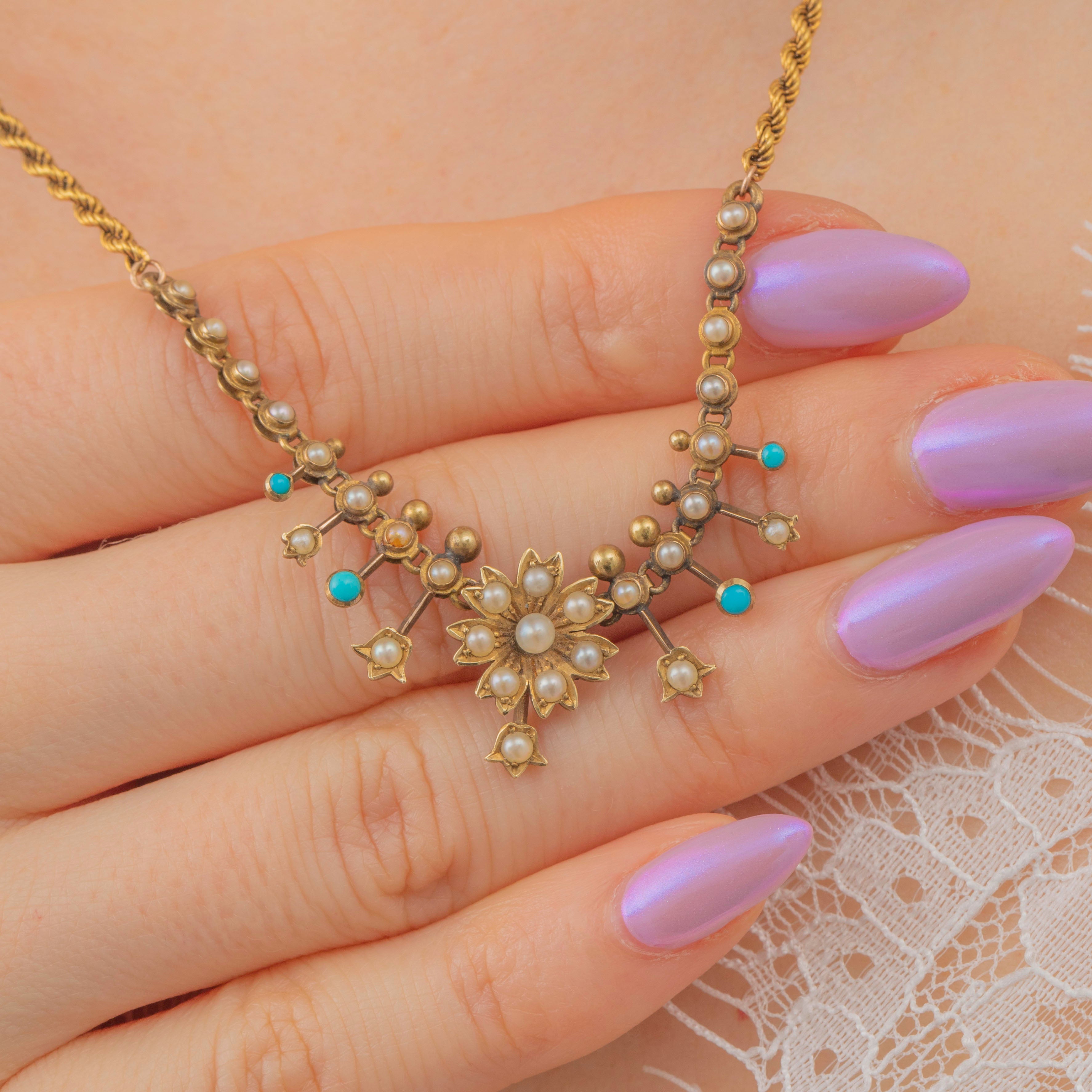 Antique 15ct Gold Turquoise Pearl Floral Necklace