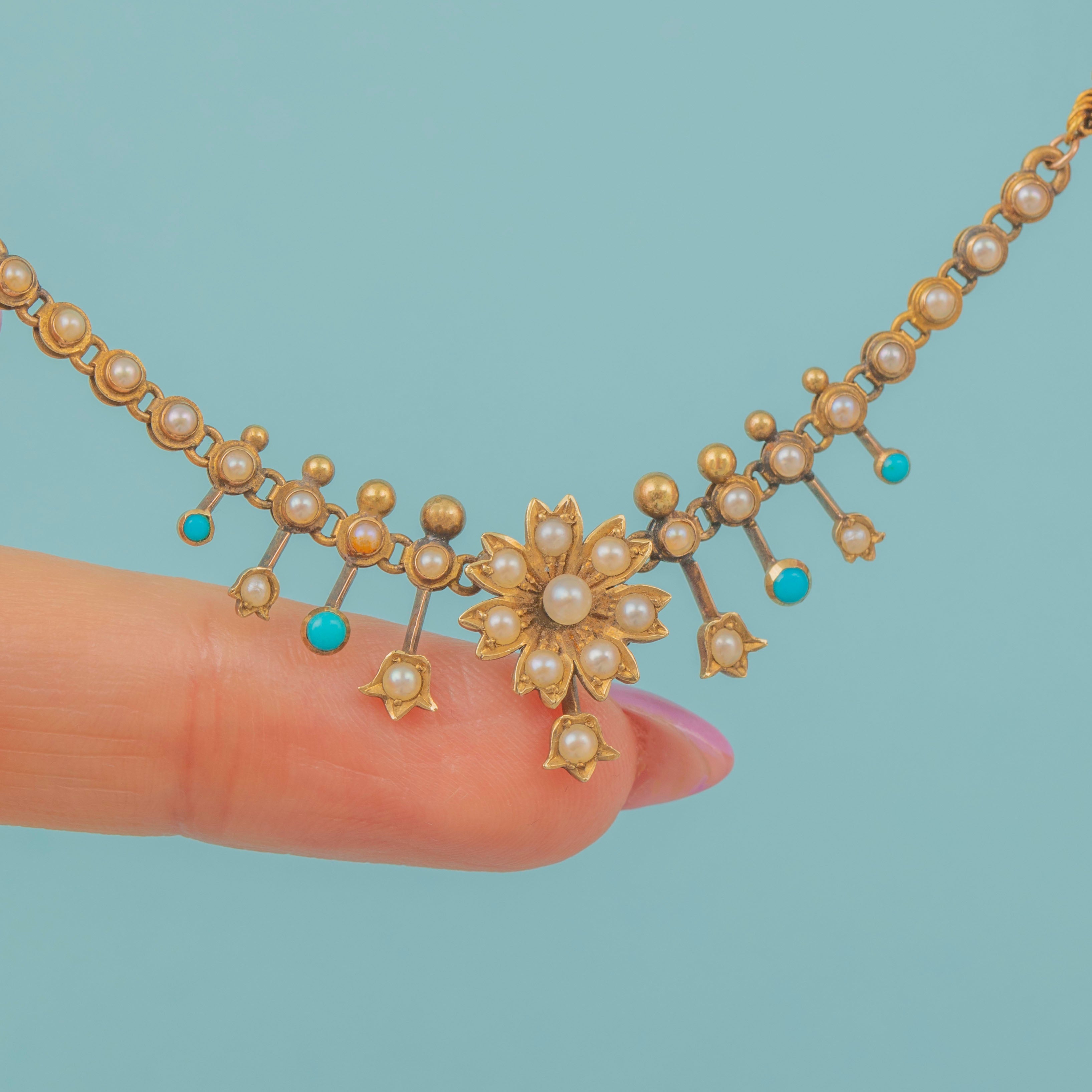VERY GOOD. This antique 15ct Gold Turquoise Pearl floral necklace is presented in very good condition. Her Pearls and Turquoise are all present and securely set into their Gold settings, with some subtle variation within the hue of some of the Pearls. The Gold has aged well over the years, with only some mild discolouration and wear to the necklace's body. There is a residual attachment on the back of the necklace, an indication that there was an additional part of the necklace that has since been removed. The chain has accrued a patina over the years adding a rich antique feel to the piece as a whole.